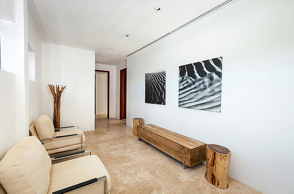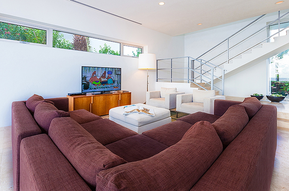 Upstairs are two identical master suites on each end with two guest suites in the middle. All have huge glass windows to enjoy the view. The fifth bedroom is located on the main floor.