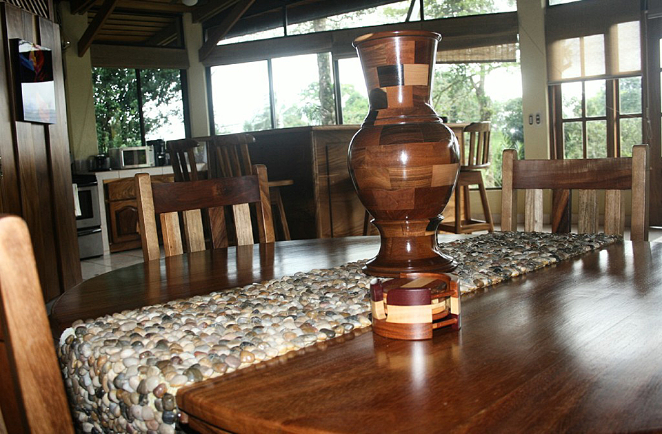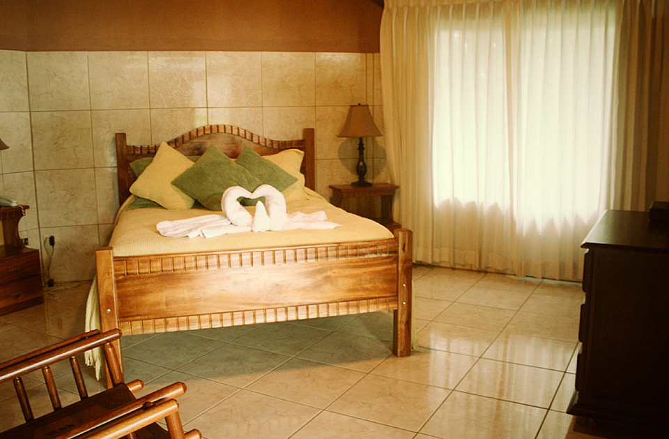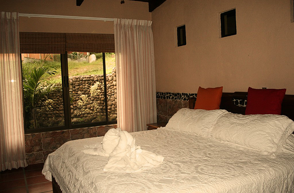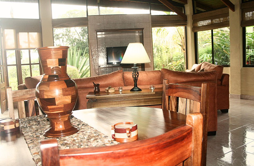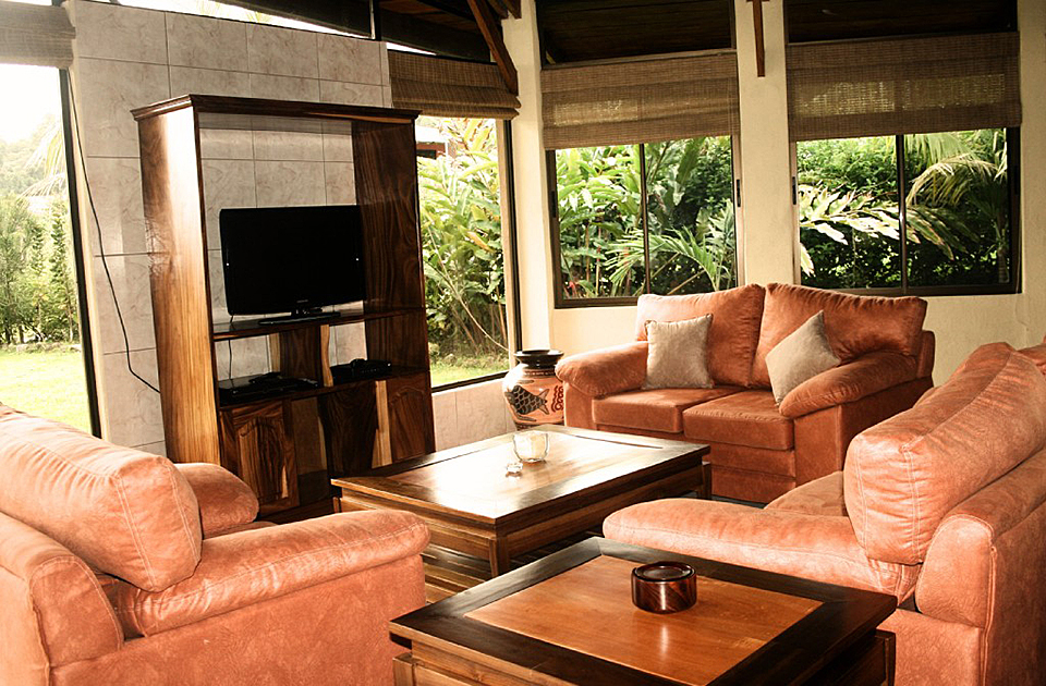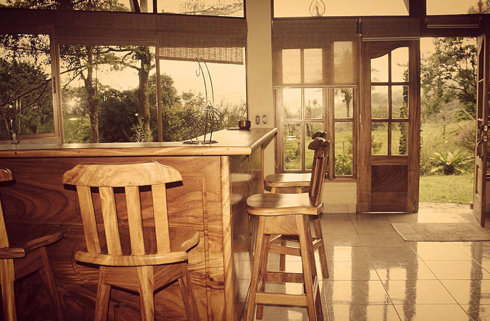 The home has three bedrooms and two bathrooms accommodating a king, a queen, and two twin beds that are easily transformed into a king if necessary. The living area is large and spacious with a full sofa, loveseat and chair as well as satellite TV, a flat screen television, DVD player and high speed wireless Internet. The kitchen is fully equipped with everything needed to cook for your family or entertain guests. Centered in the spacious kitchen/great room is an L shaped bar where you can relax and enjoy the view of the volcano while having cocktails or just hanging out. If it is a sit down meal you prefer, then you will enjoy the beautiful custom made dining table that accommodates six. After a wonderful night's sleep in the comfort of custom made beds and orthopedic mattresses, you will awaken to the singing of hundreds of different species of birds, and in the background, the howler monkeys singing their own morning song. Just a short walk across the street, you will find a beautiful river for your swimming enjoyment and several local waterfalls that can be accessed by horseback riding or hiking. This villa is a bird watchers' paradise and a relaxing retreat for nature lovers young and old.
