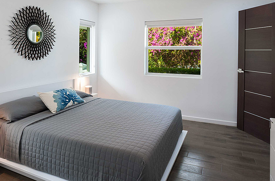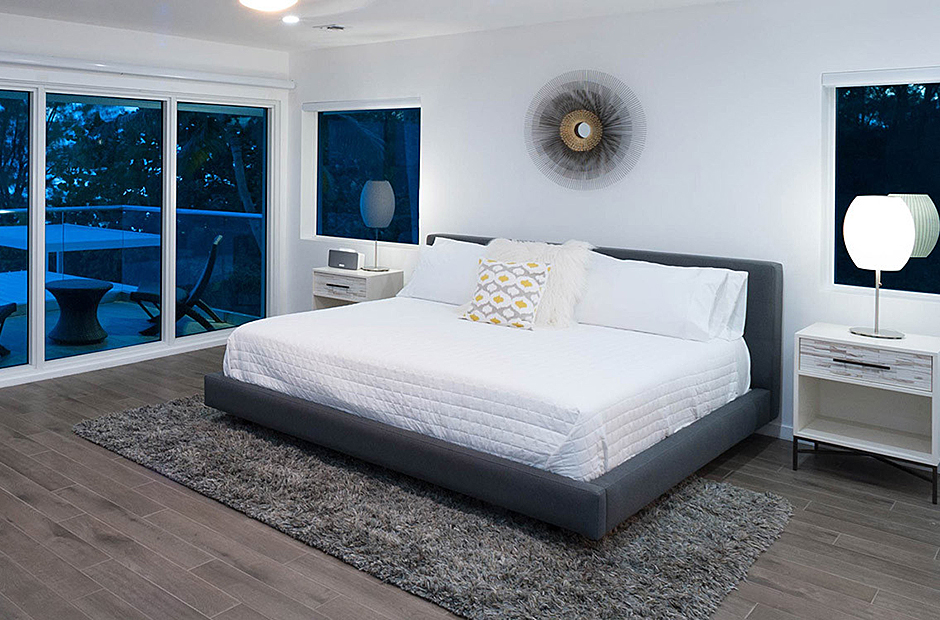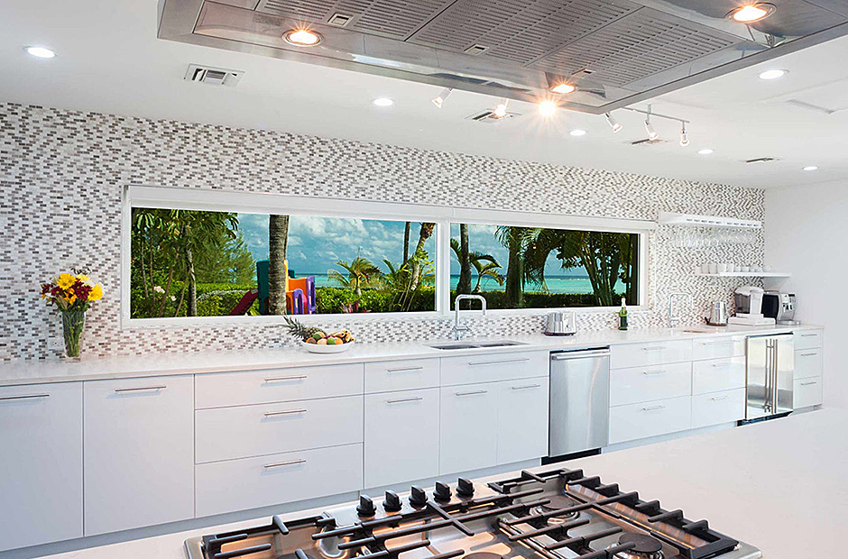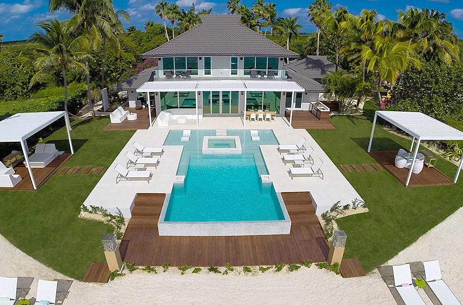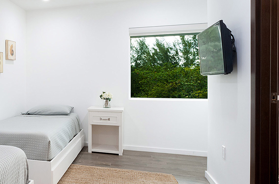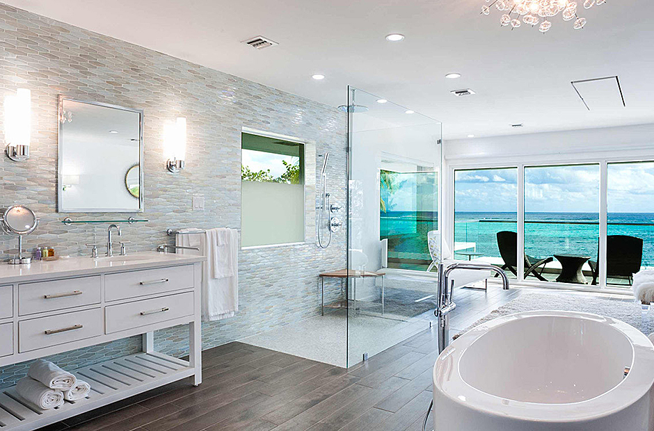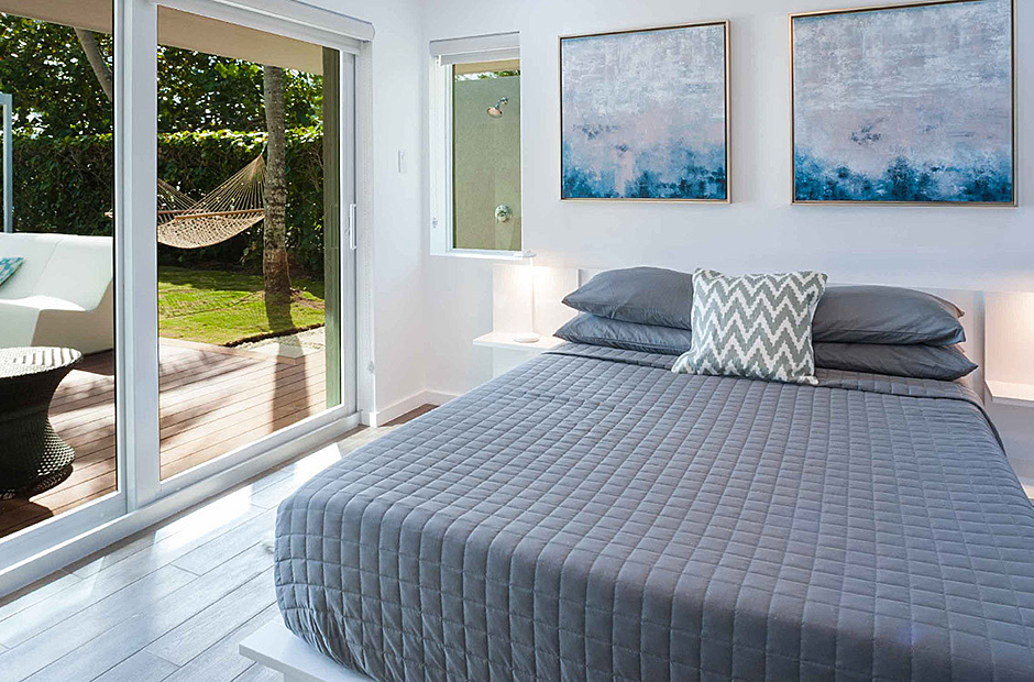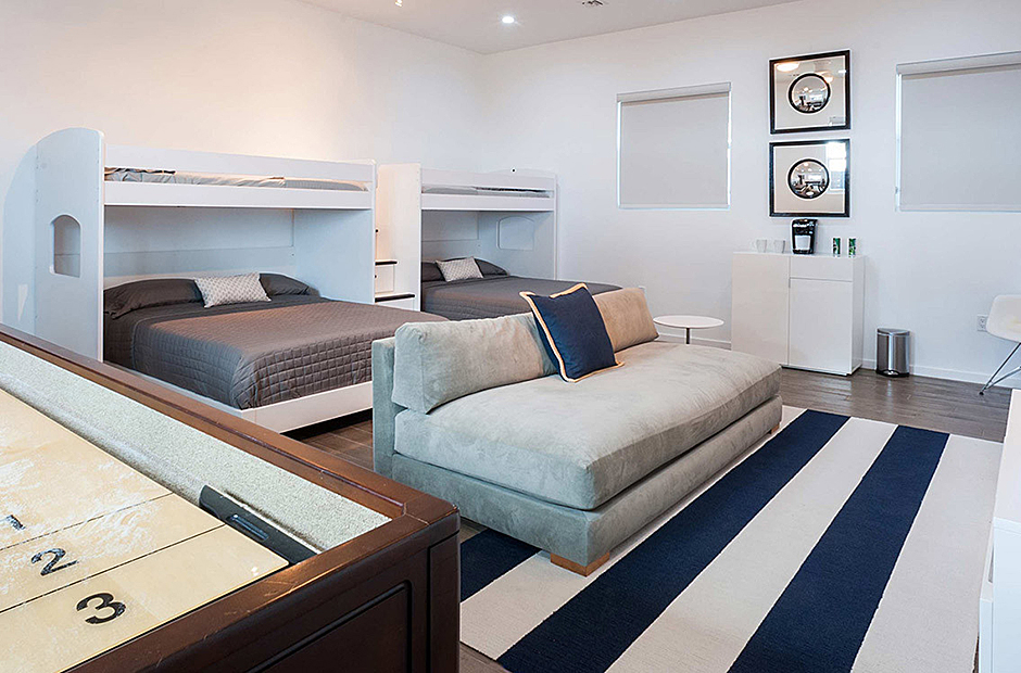 The villa comfortably accommodates up to 18 guests across six bedrooms, including two master suites. One master suite features a deep soaking tub and an ocean-view shower, creating a spa-like retreat. The second master is conveniently located adjacent to a children’s bedroom, ideal for keeping young ones close. Downstairs, older children can enjoy their own space in a bunk room next to two queen suites—one with an ocean view and the other with a garden view.