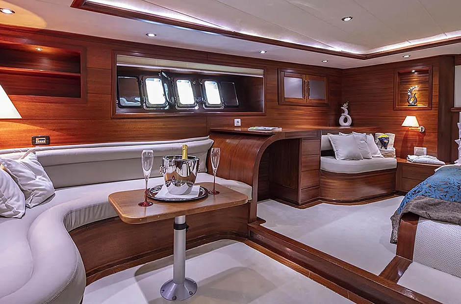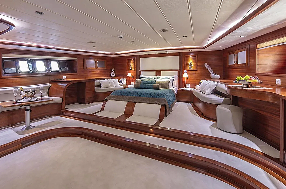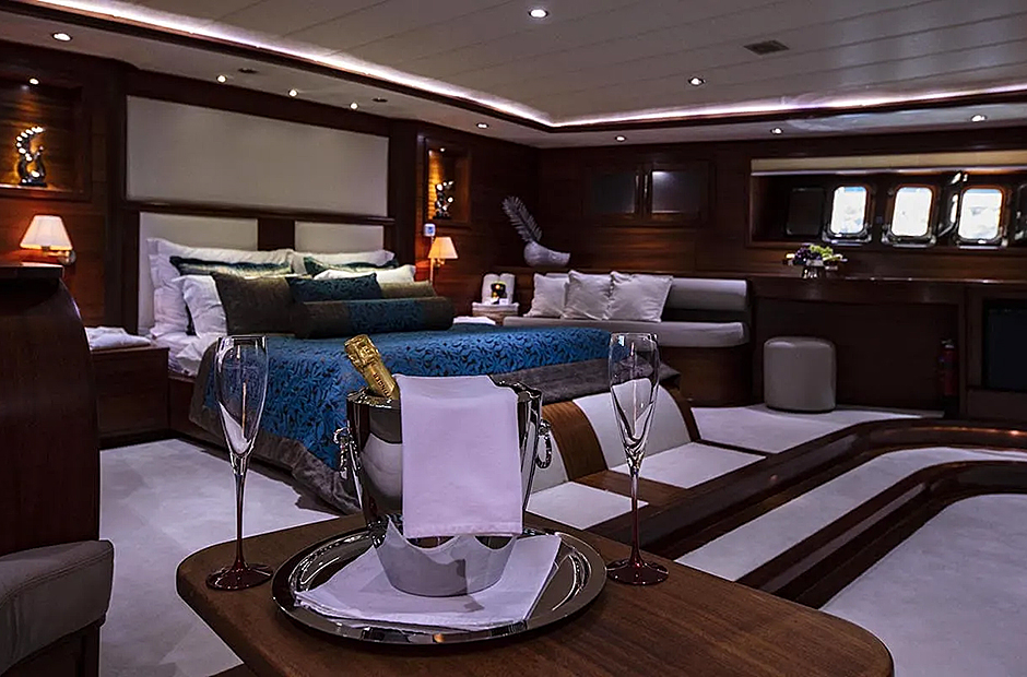 The extremely spacious full beam master stateroom has plenty of storage space, wardrobes, and a large marble ensuite bathroom with bathtub. A further three double staterooms sleep your guests comfortably in queen sized beds.