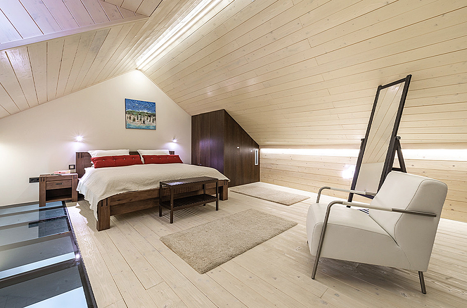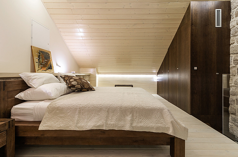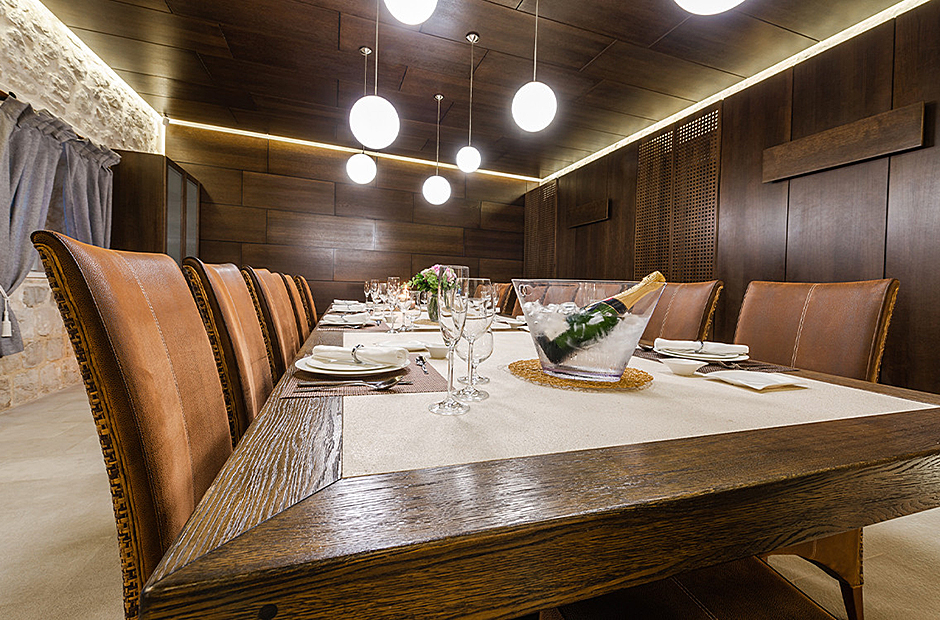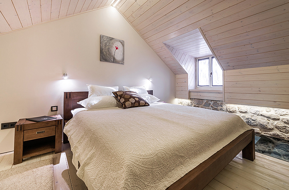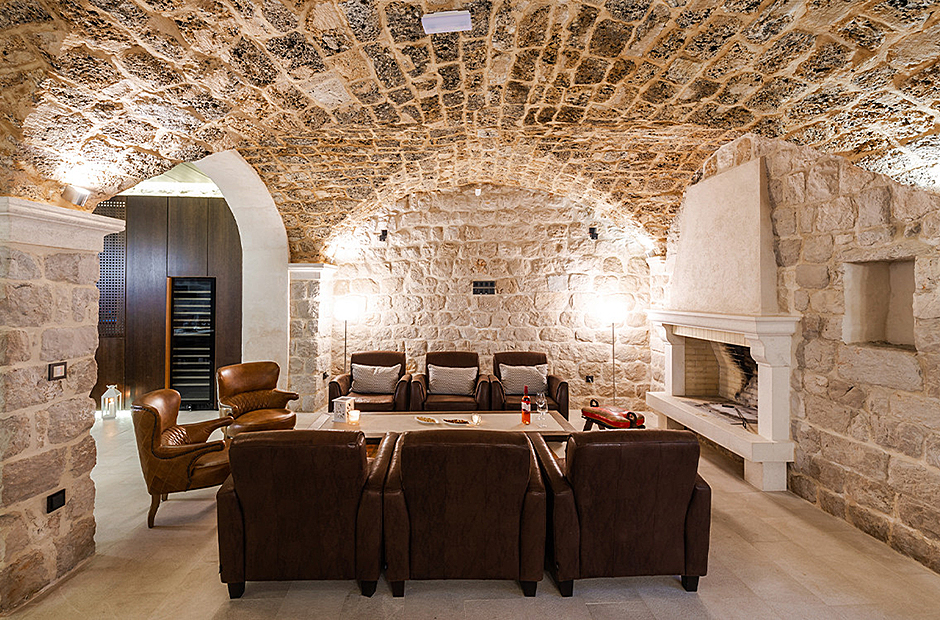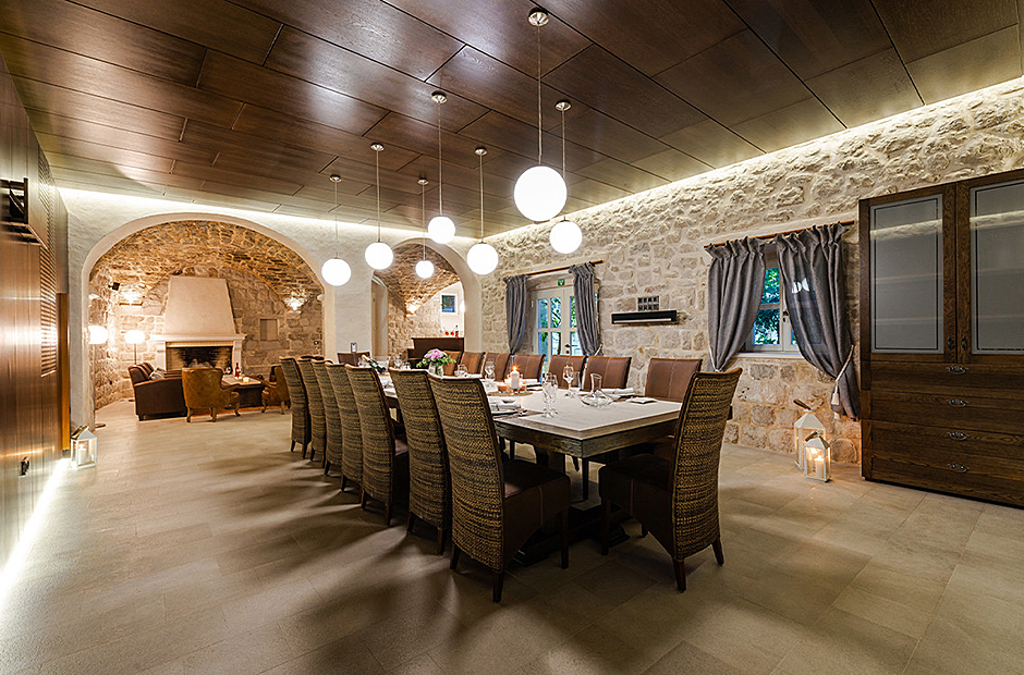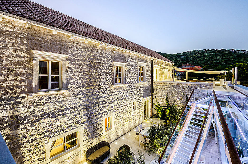 As you step through the main entrance, the southern courtyard welcomes you with its massive stone walls, exuding an air of exclusivity and tranquility. The courtyard, adorned with outdoor sofas, leads to the main house, where traditional Croatian materials such as stone and wood harmonize with modern design features. The spacious interior, spread over two floors, offers a seamless fusion of contemporary minimalism and historic details, creating a warm and inviting ambiance.