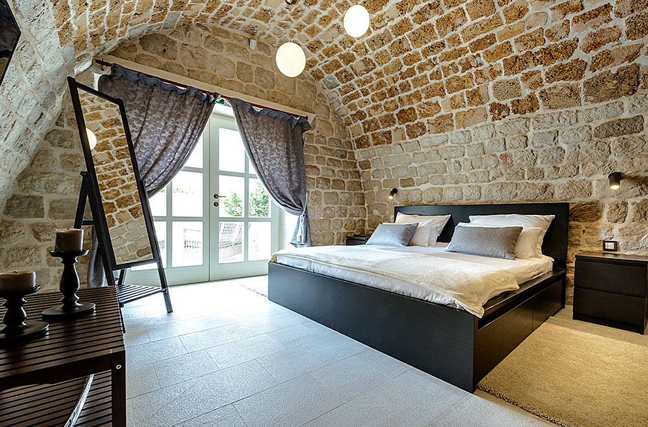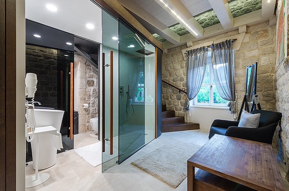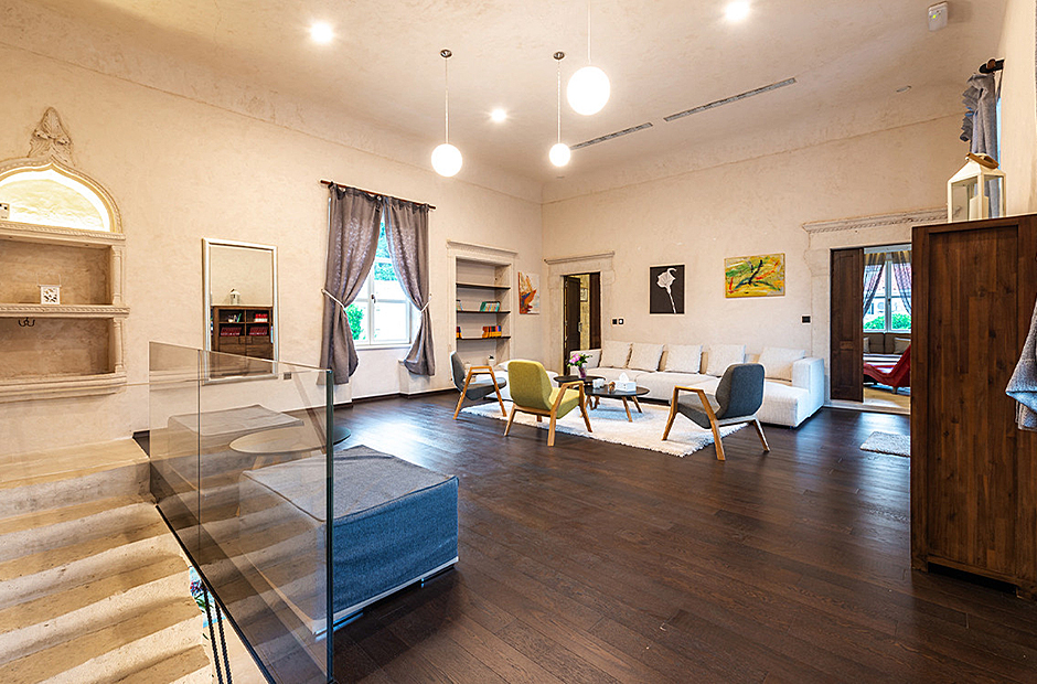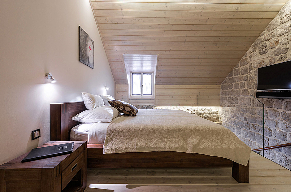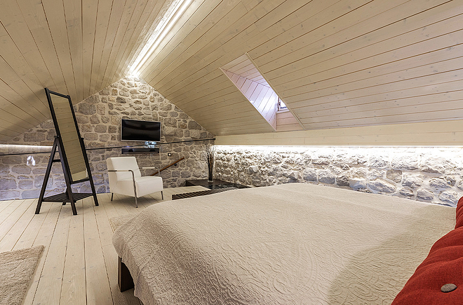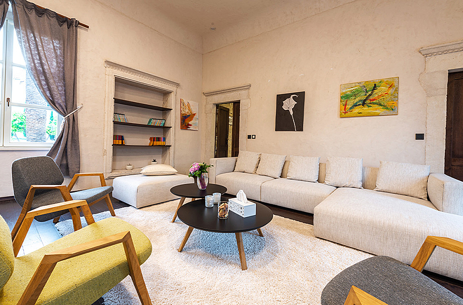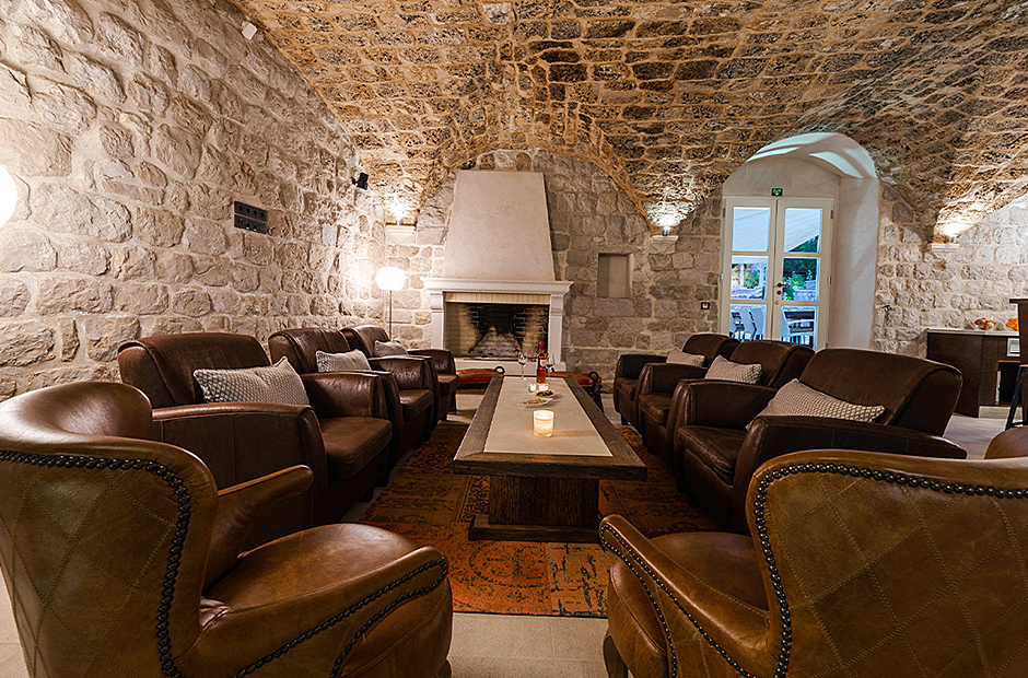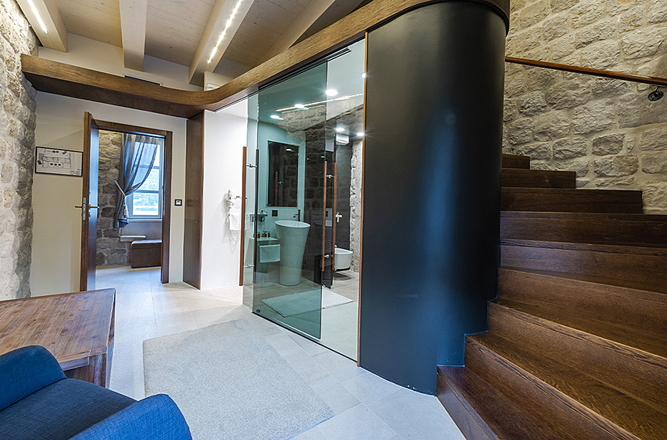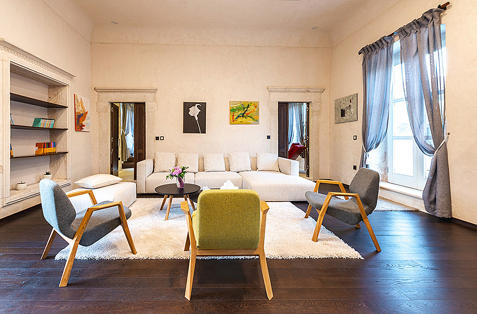 Ascending the historic staircase to the first floor, you'll find the library, a light-filled sanctuary overlooking the bay of Zaton. The first floor also houses four luxury suites, each offering a comfortable lounge area, modern bathroom, and gallery with a king-size bed.