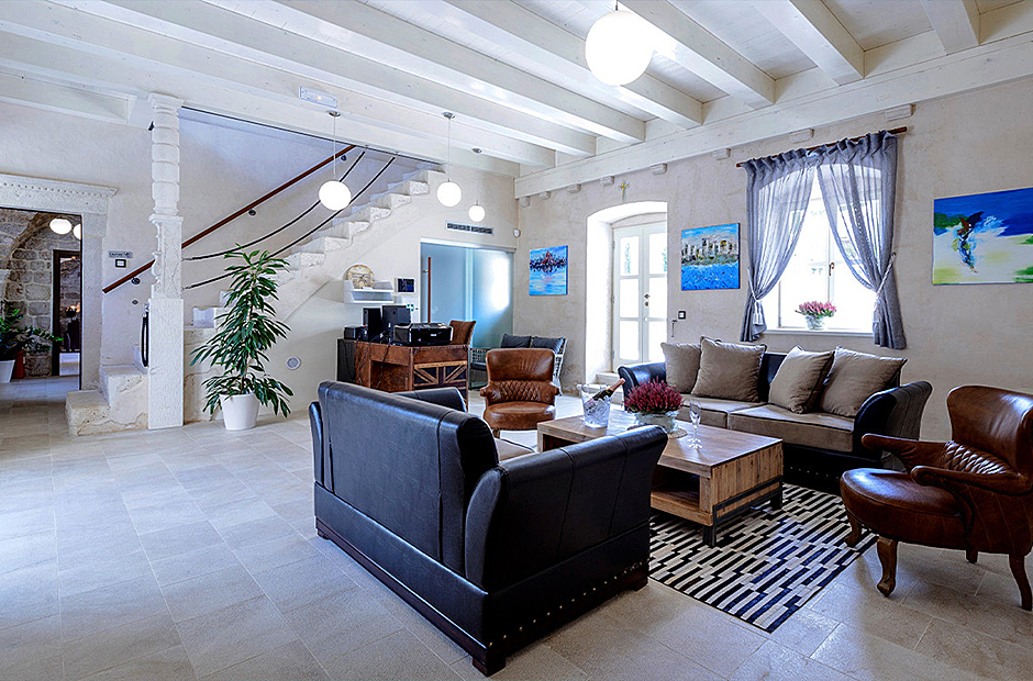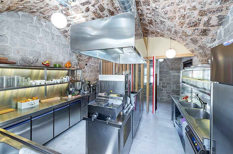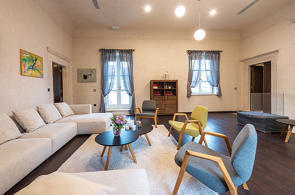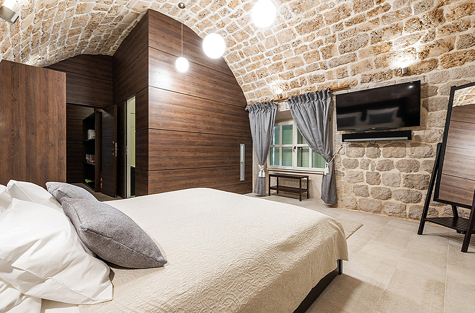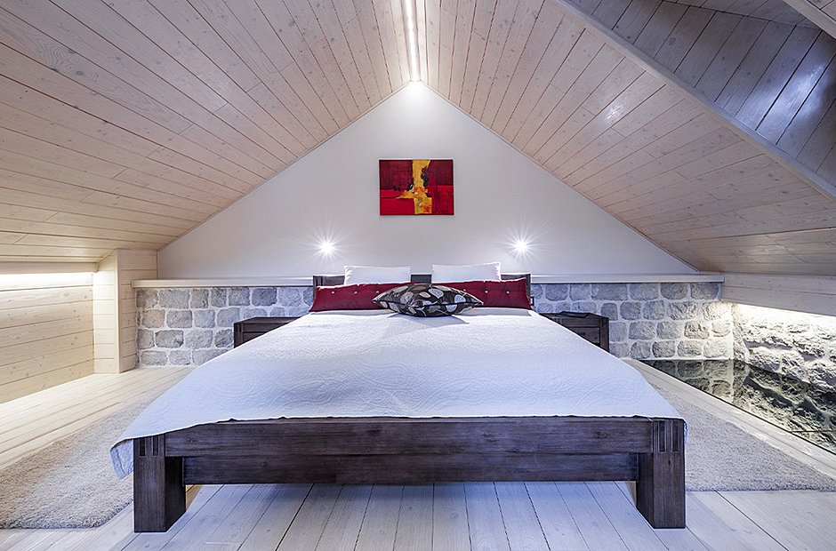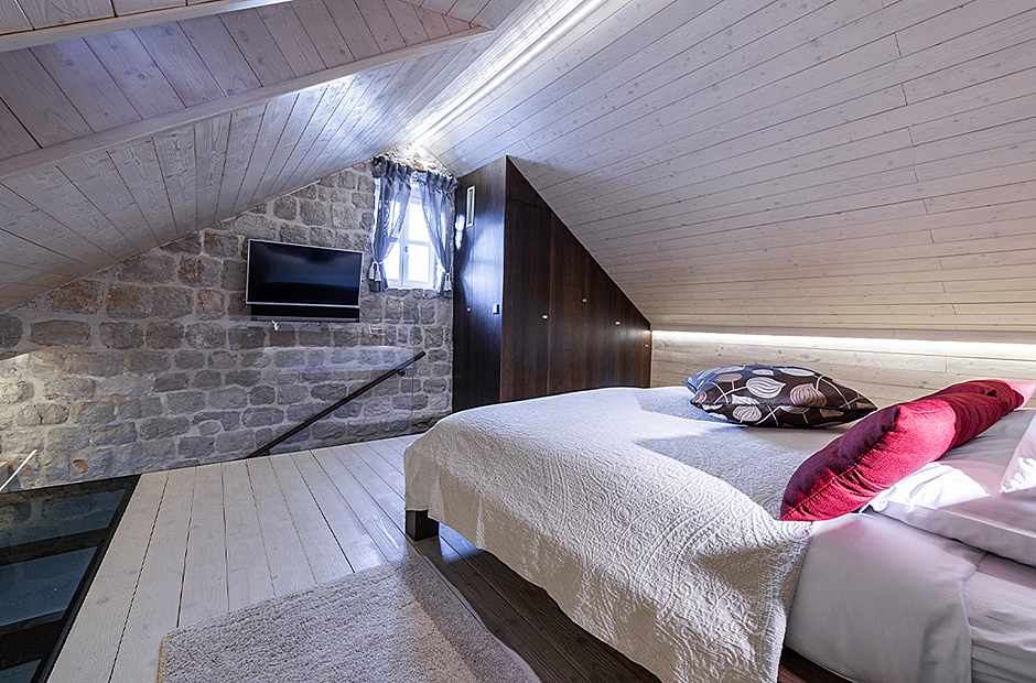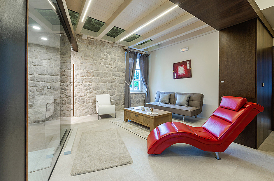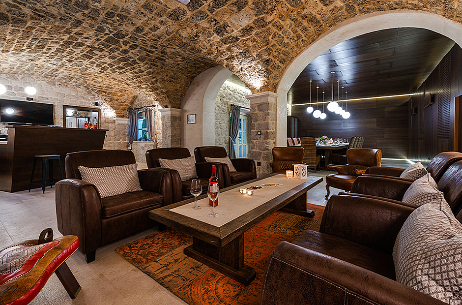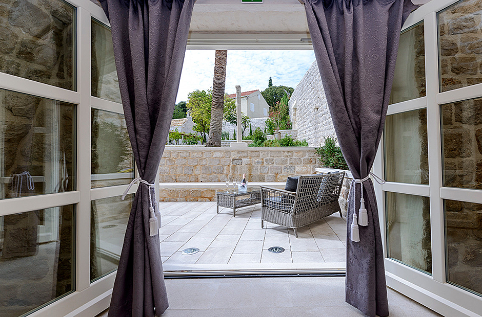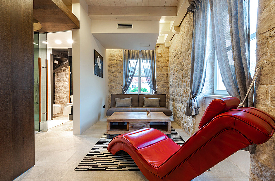 Ascending the historic staircase to the first floor, you'll find the library, a light-filled sanctuary overlooking the bay of Zaton. The first floor also houses four luxury suites, each offering a comfortable lounge area, modern bathroom, and gallery with a king-size bed.