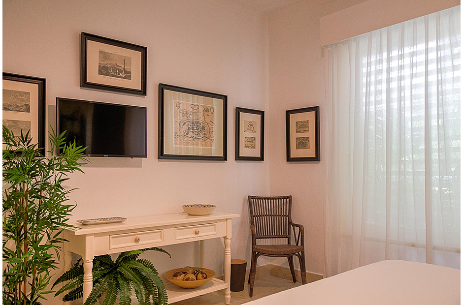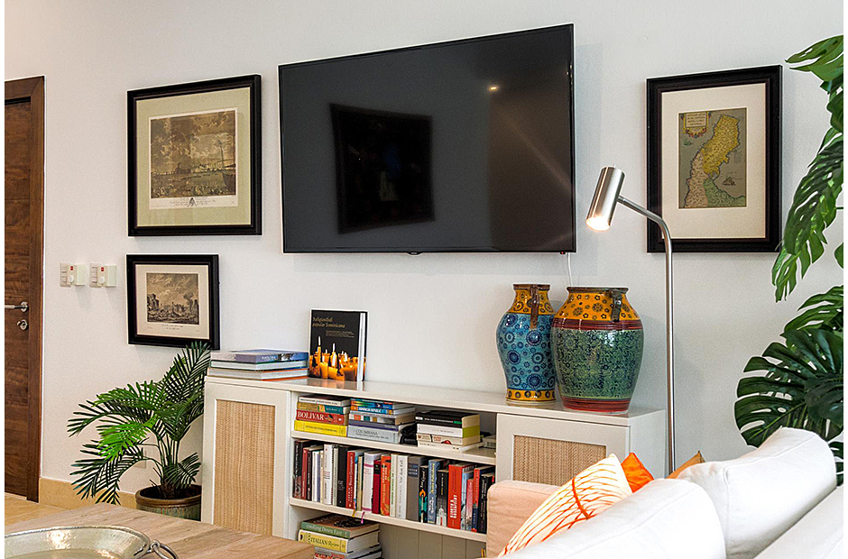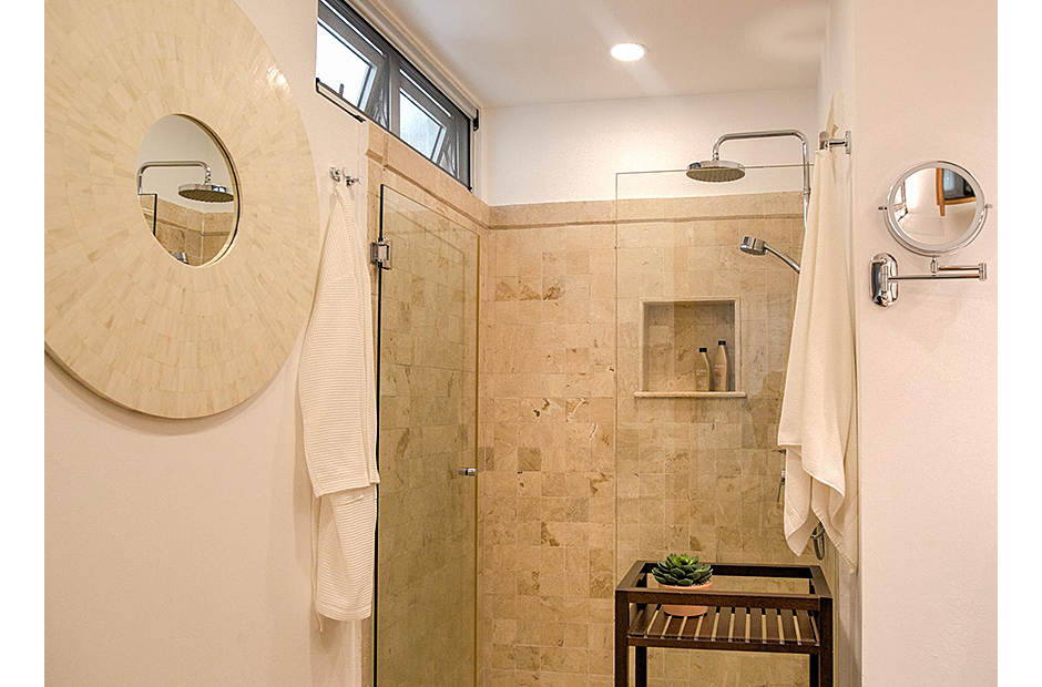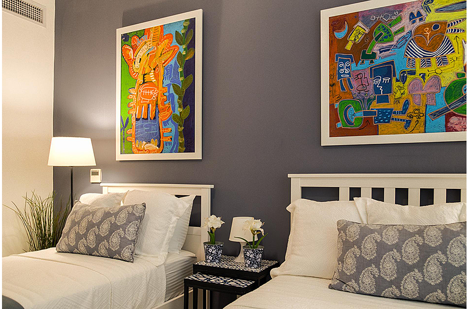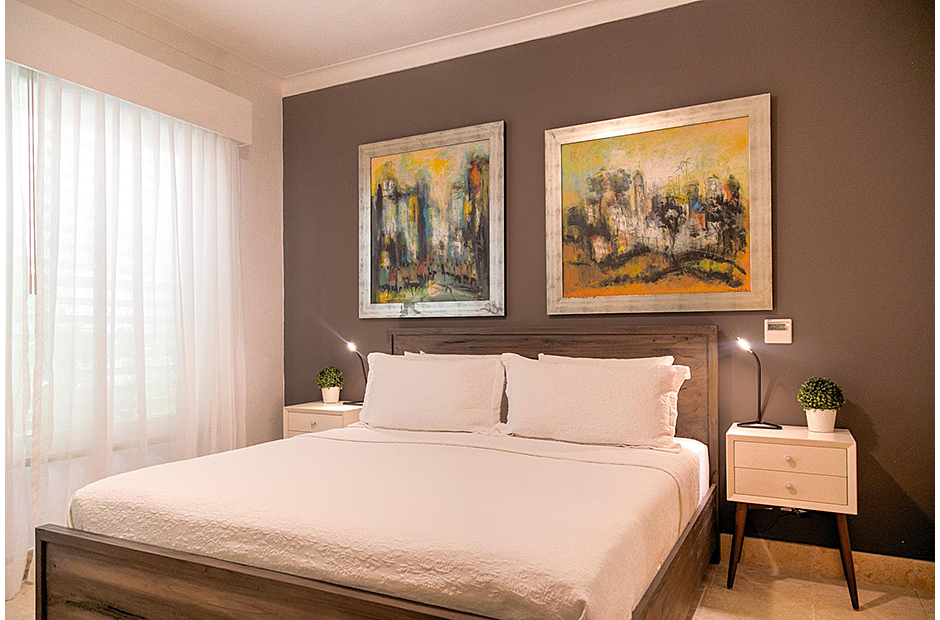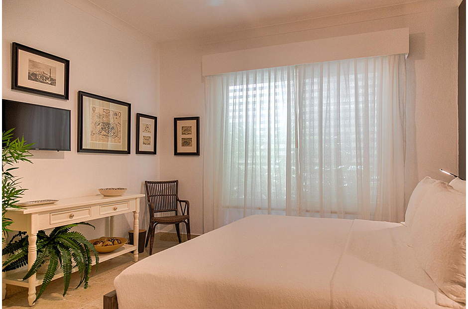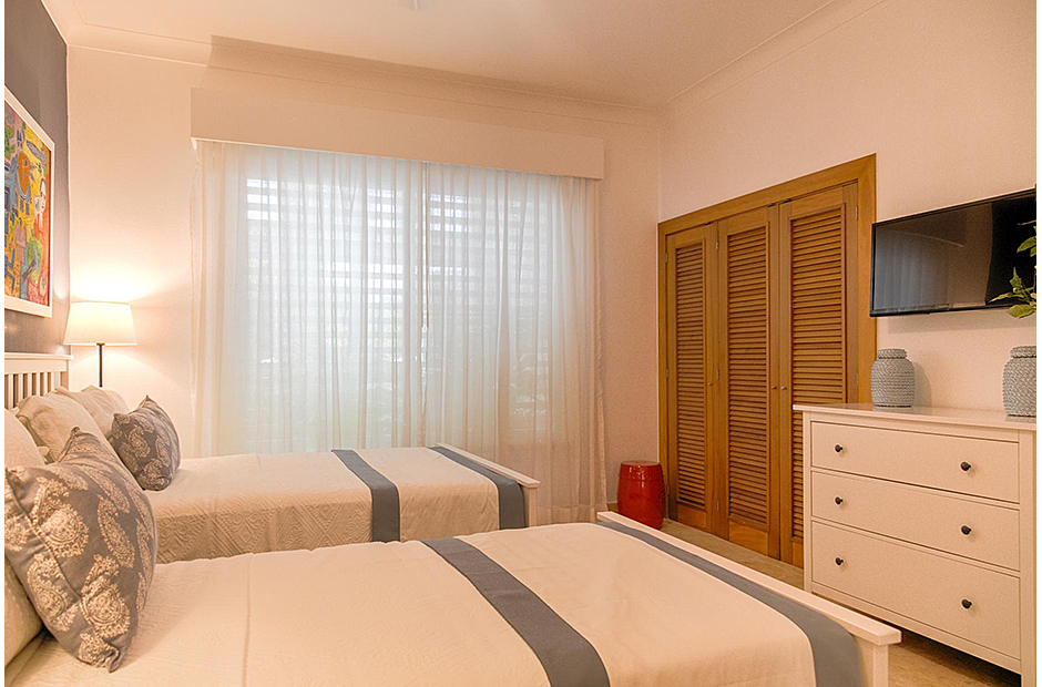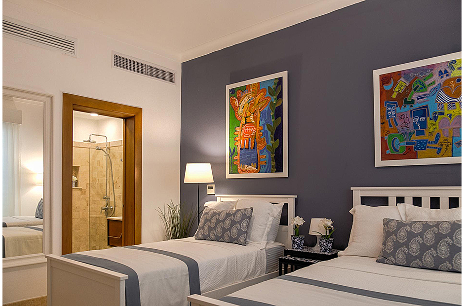The master bedroom includes a king size bed and the second bedroom includes one full and one queen size bed. All rooms include air conditioning, ceiling fan, TV with international cable channels and private bathroom.