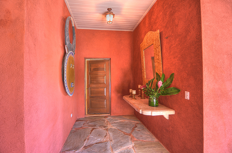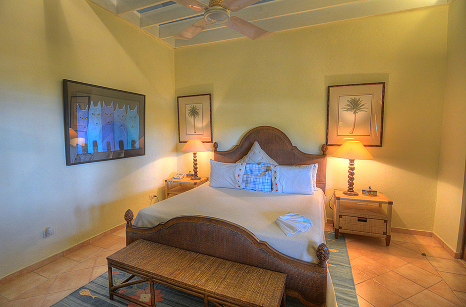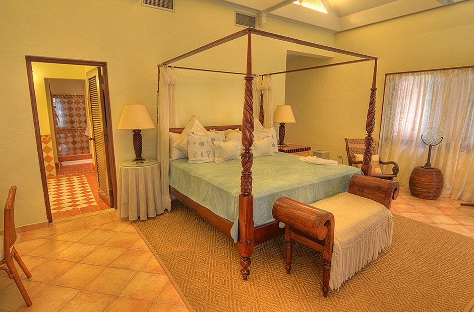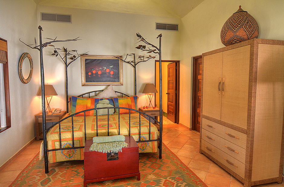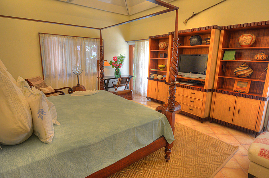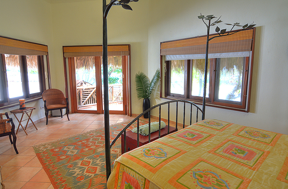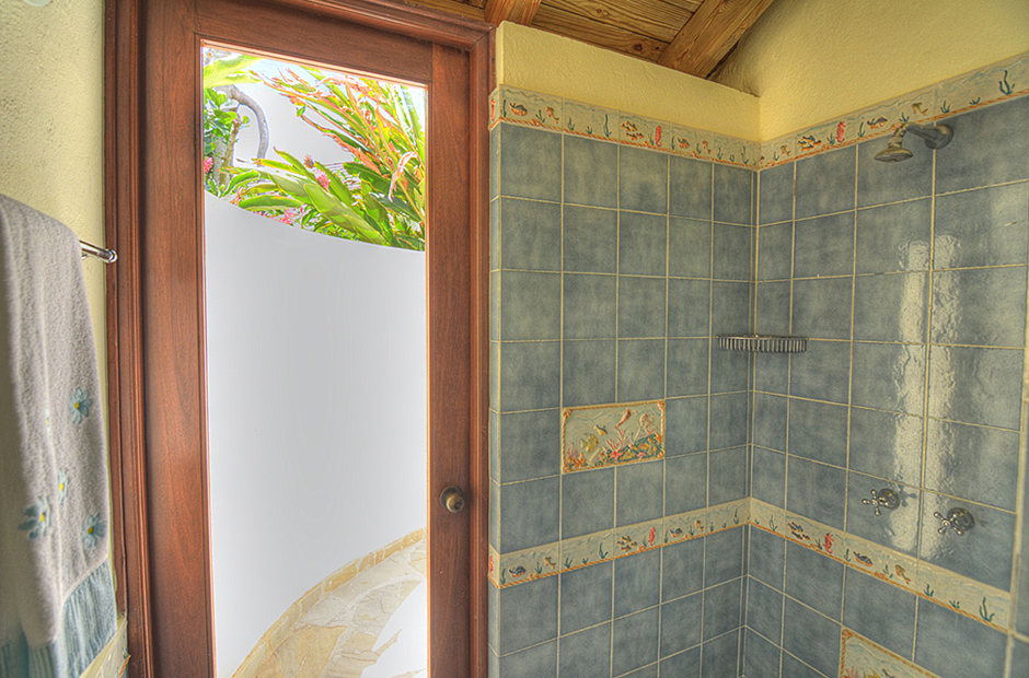 The master bedroom includes a king size bed, with a spacious bathroom and outdoor shower. The secondary bedroom includes 2 queen size beds.