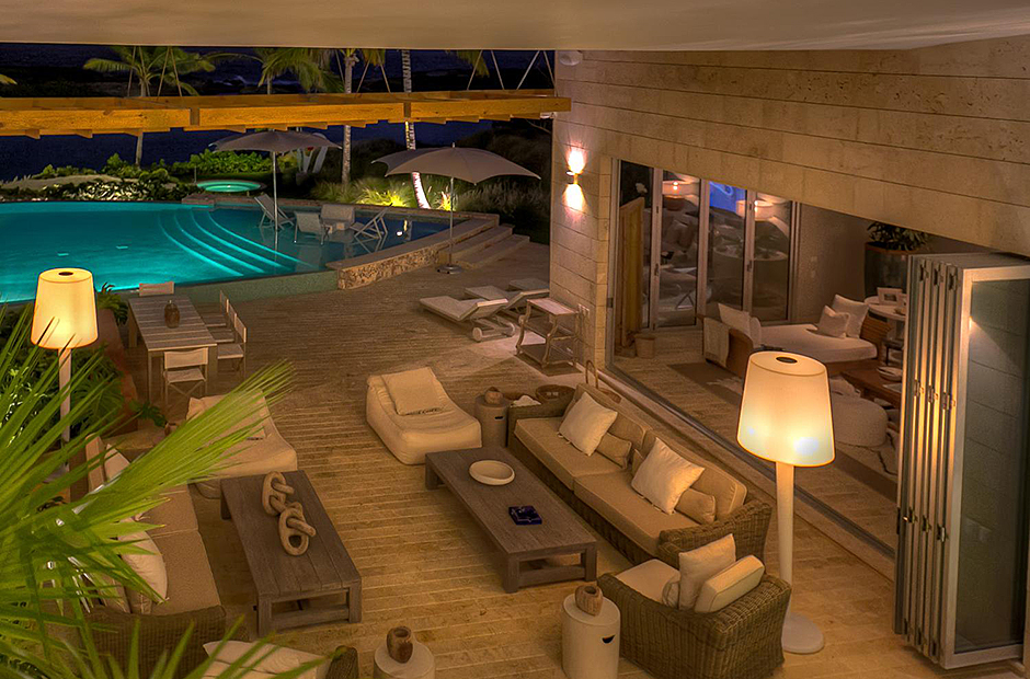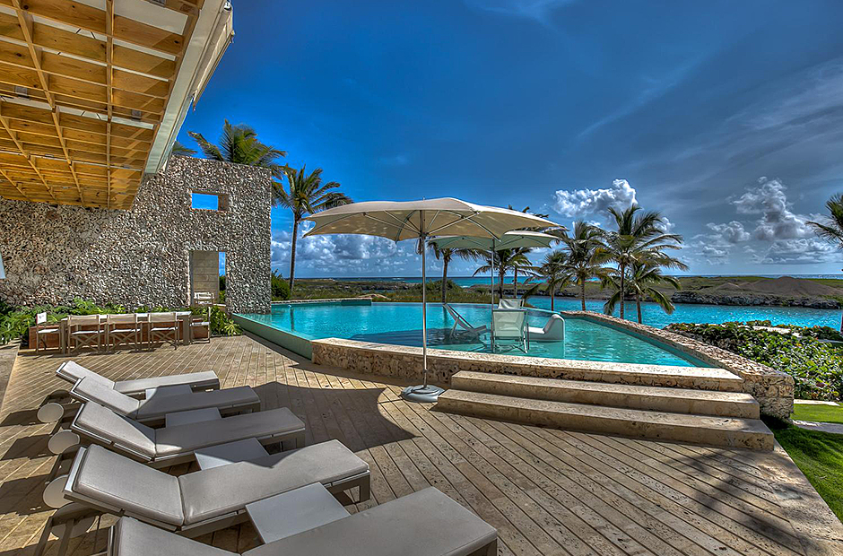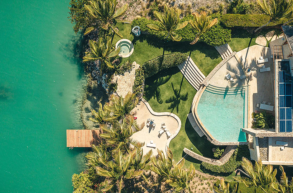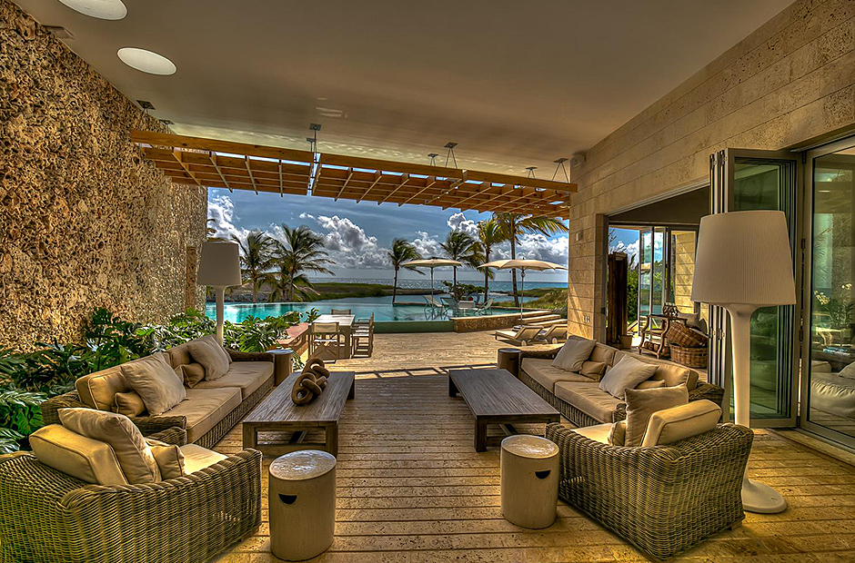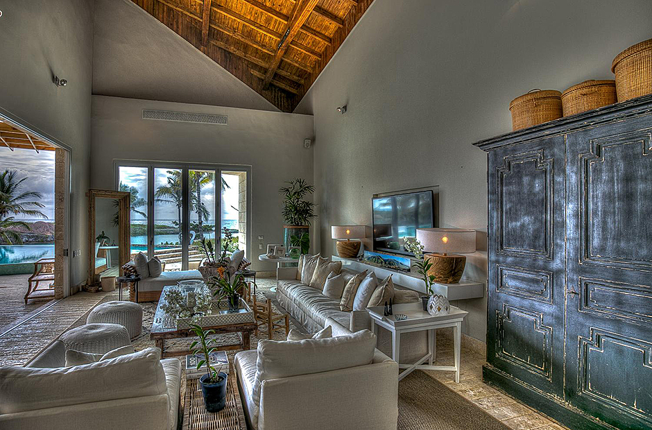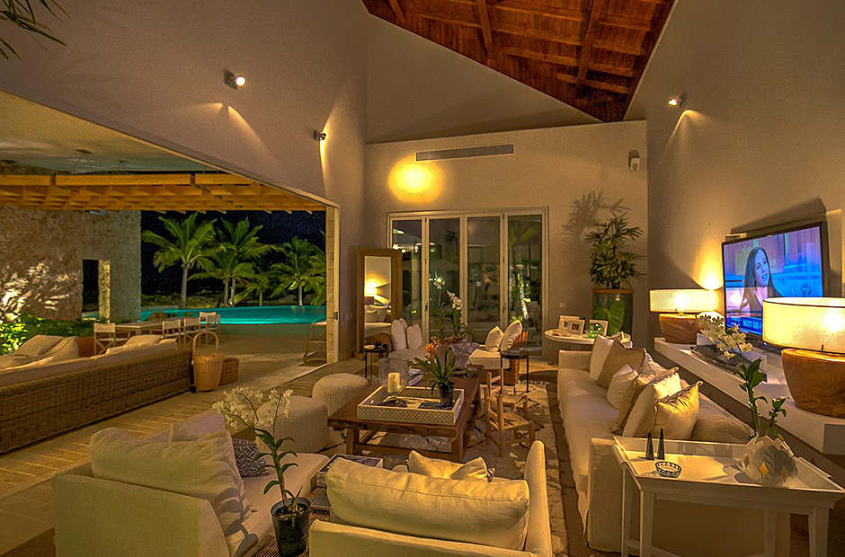 When stepping through the main front door of the villa, you will be met by a scenery overlooking the living room and an incredible infinity pool overlooking a beautiful cove of the Caribbean sea with a dock.