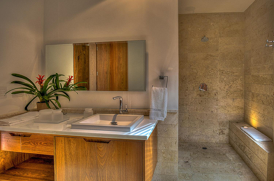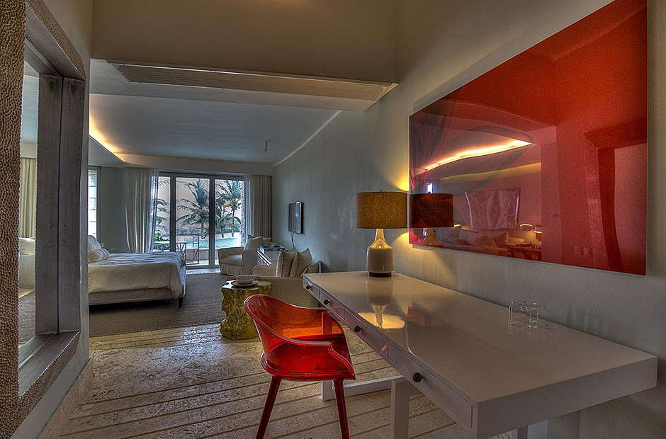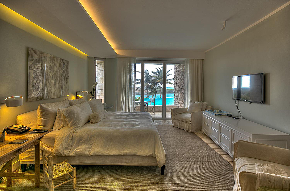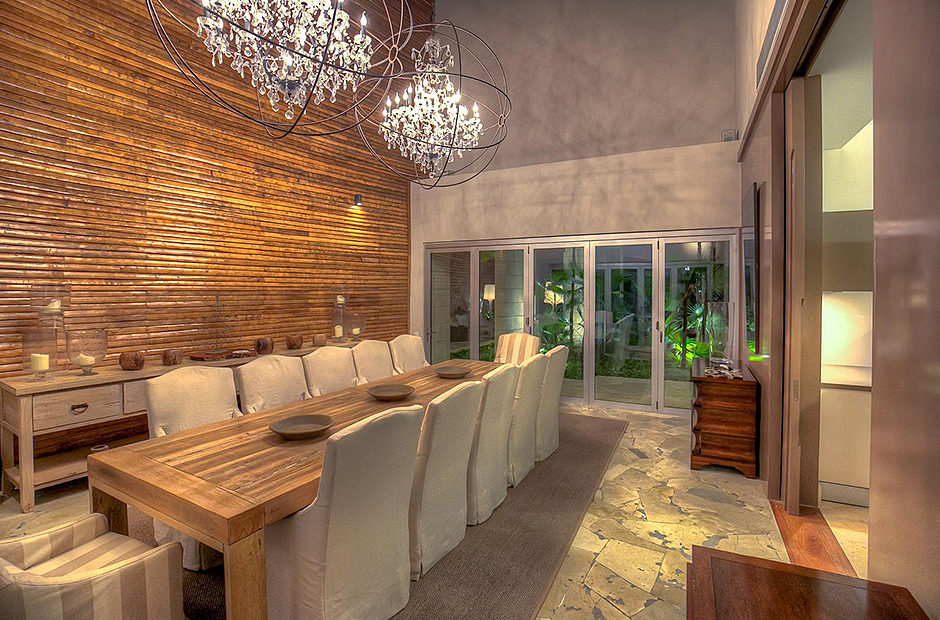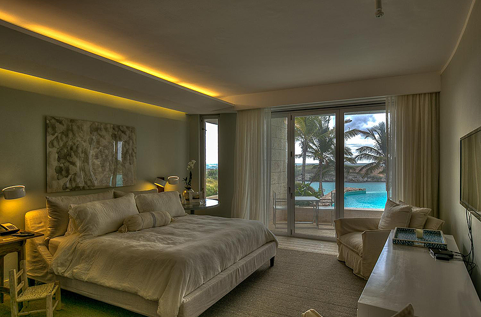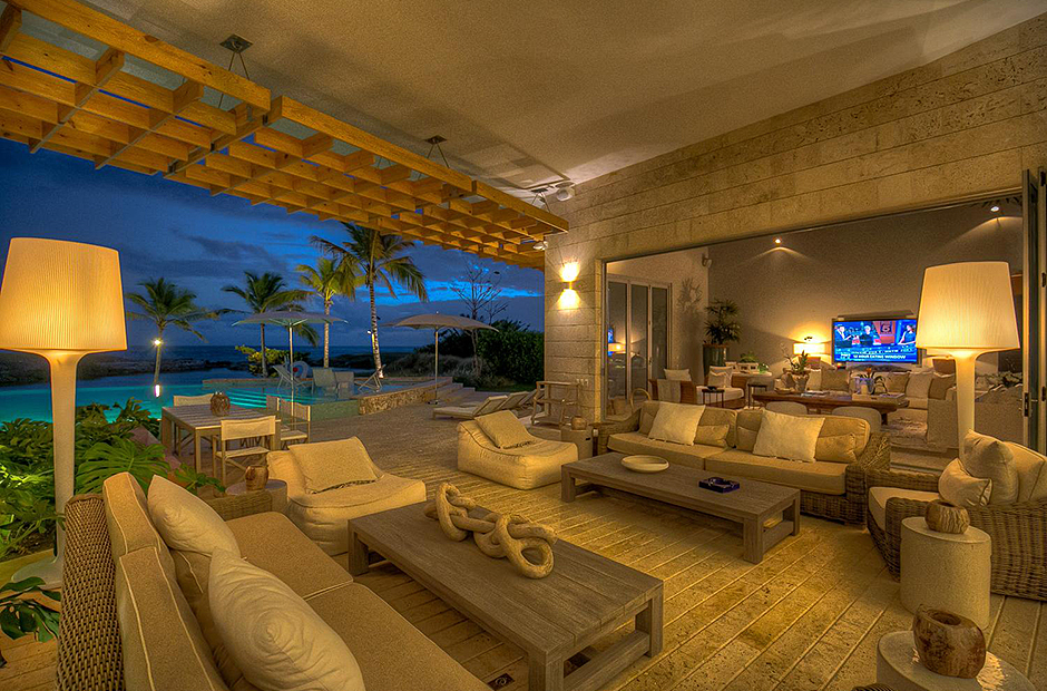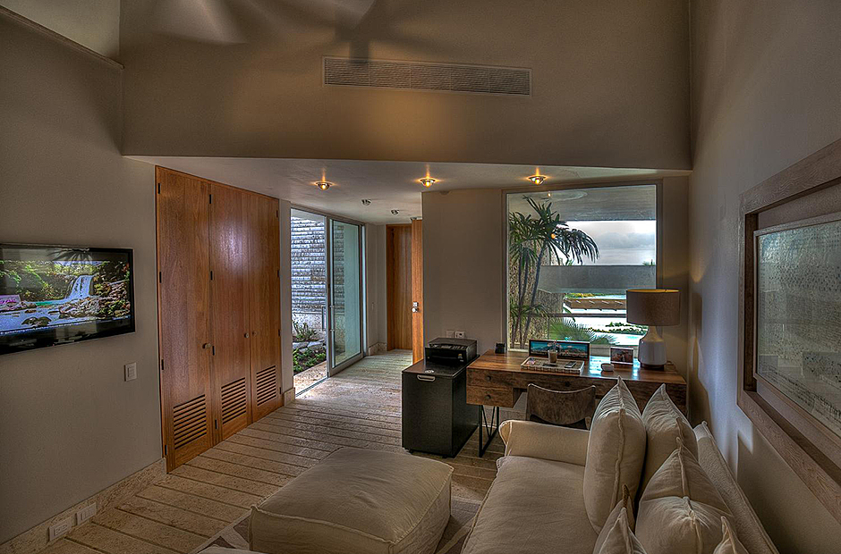 When stepping through the main front door of the villa, you will be met by a scenery overlooking the living room and an incredible infinity pool overlooking a beautiful cove of the Caribbean sea with a dock.