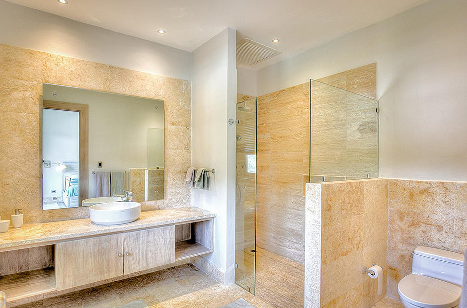 When it´s time to sleep or you want to take a quick nap, you can go upstairs on the main building and find the master bedroom with a king bed, full bathroom with shower and tub and walk-in closet, a second bedroom with another king bed, full bathroom with shower and walk-in closet and the third bedroom with 2 twin beds, full bathroom with shower and walk-in closet. Next is the guest house with all bedrooms downstairs. The fourth bedroom has two full beds, full bathroom with shower and walk-in closet, finally the fifth and the sixth bedroom have king bed each, a full bathroom with shower and walk-in closet each. All bedrooms have TV except the bedroom with the Twin Beds.