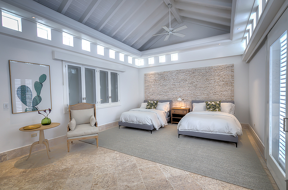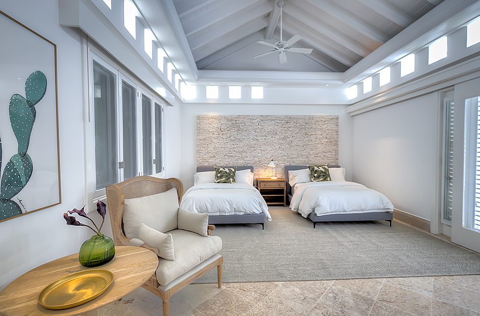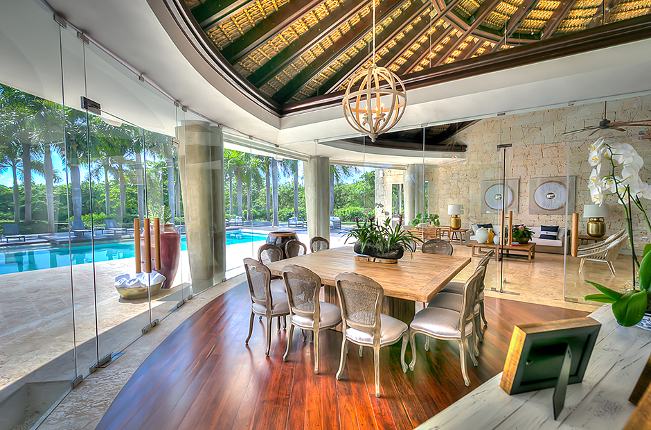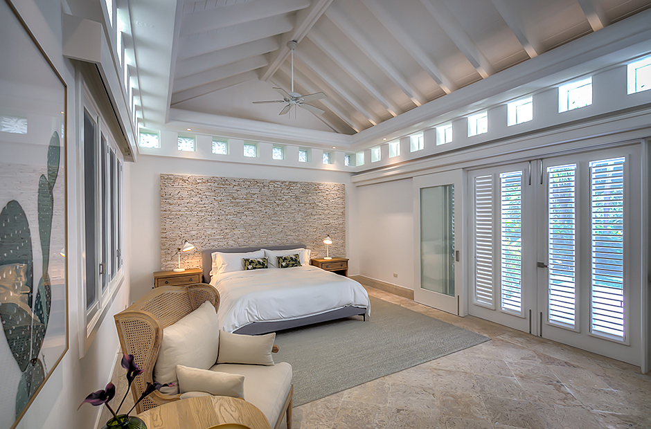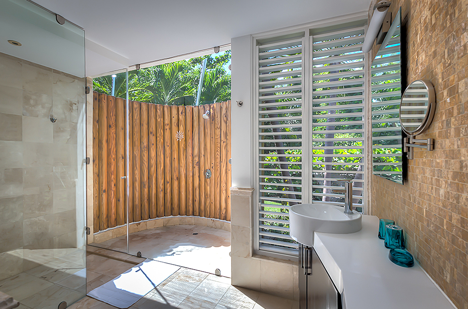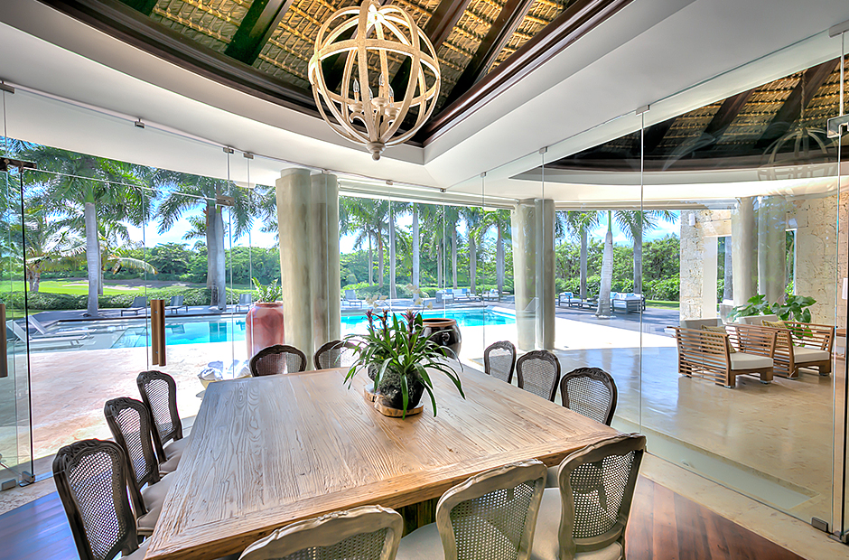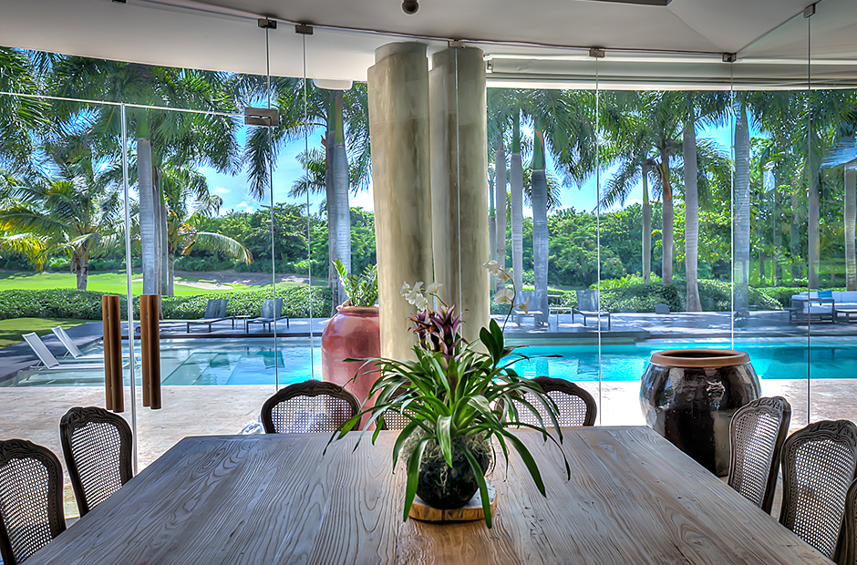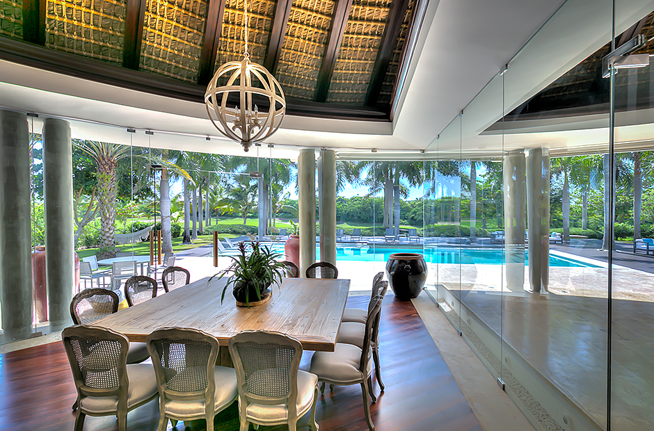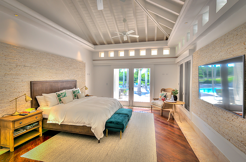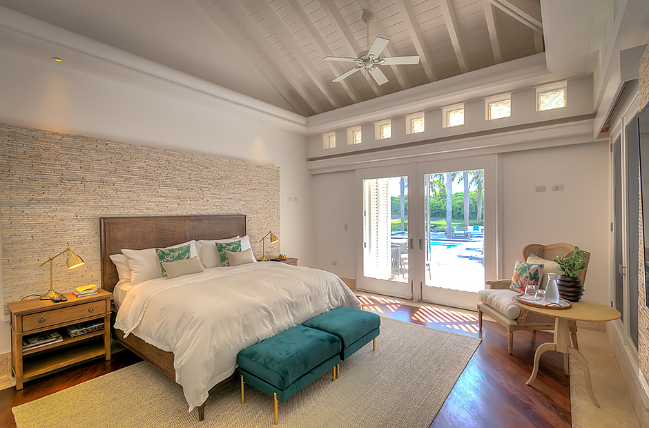 The dining room and living room are governed by large glass windows and doors, giving the guests ample views from the villa to the garden and the golf course. The dining room has a hardwood floor, a 12-seats table, and access to the garden. Next is the living room connected to the outdoor living with an open concept with two giant red vases. The wooden deck with sun loungers surrounds the pool and giving a genuine and onliest touch to the garden. The hot tub is the ultimate spot to lay back and enjoy the bluffing views or to gently swing on the hammock while prizing the Caribbean breeze.