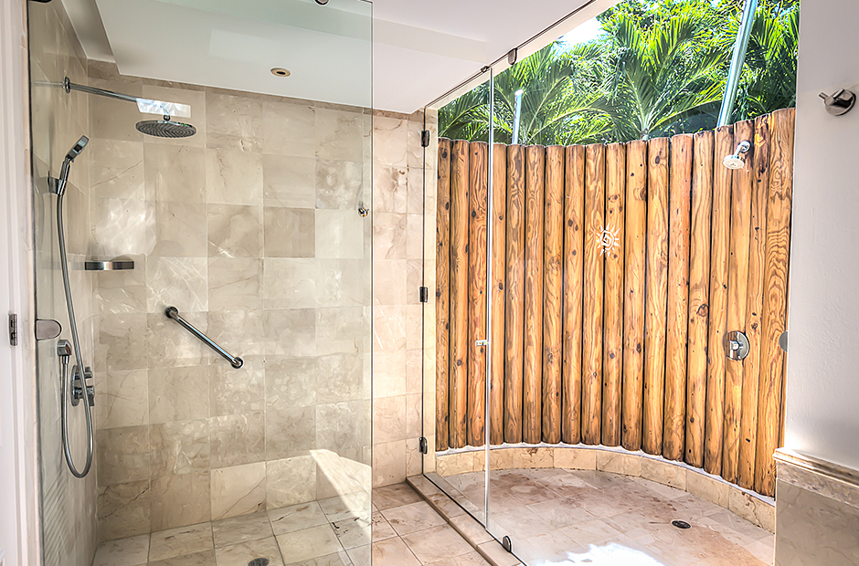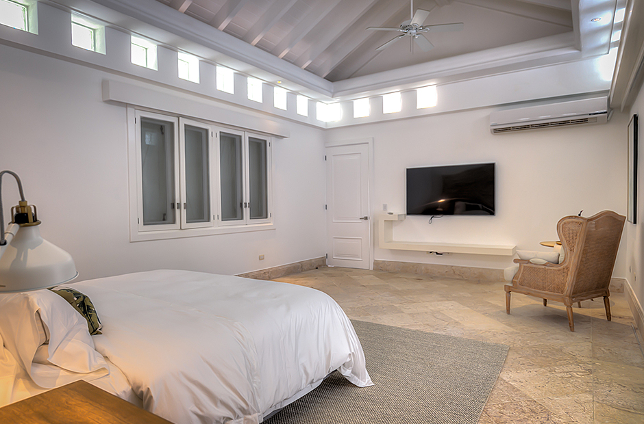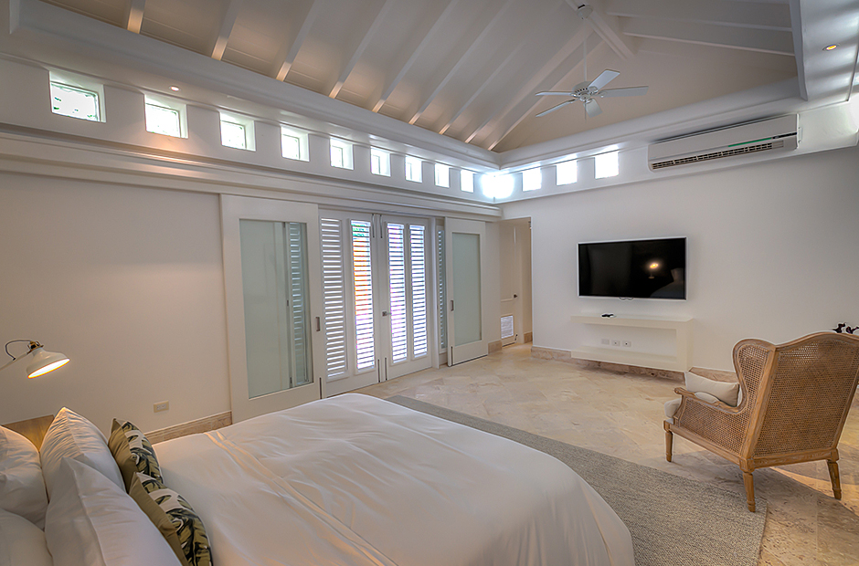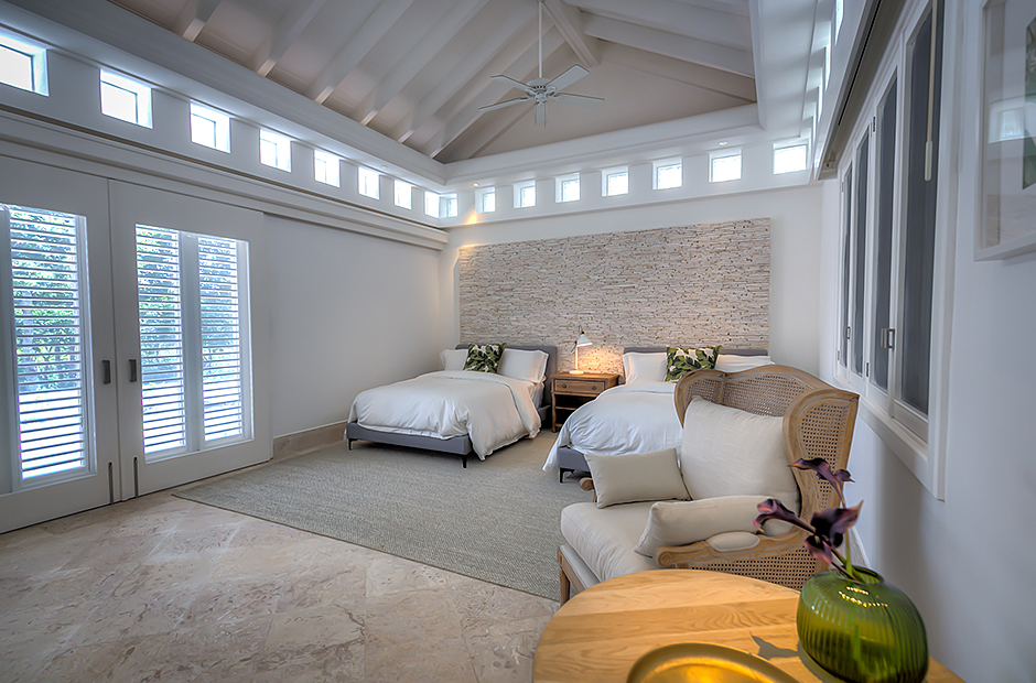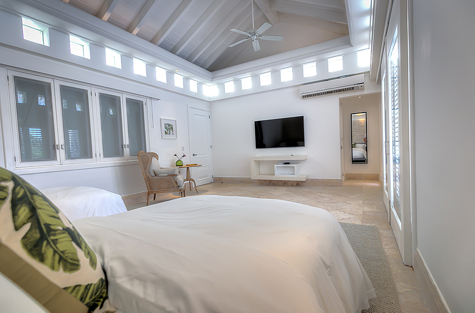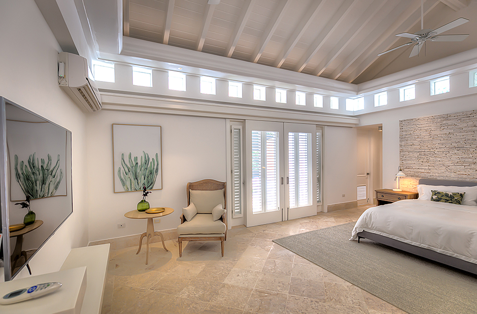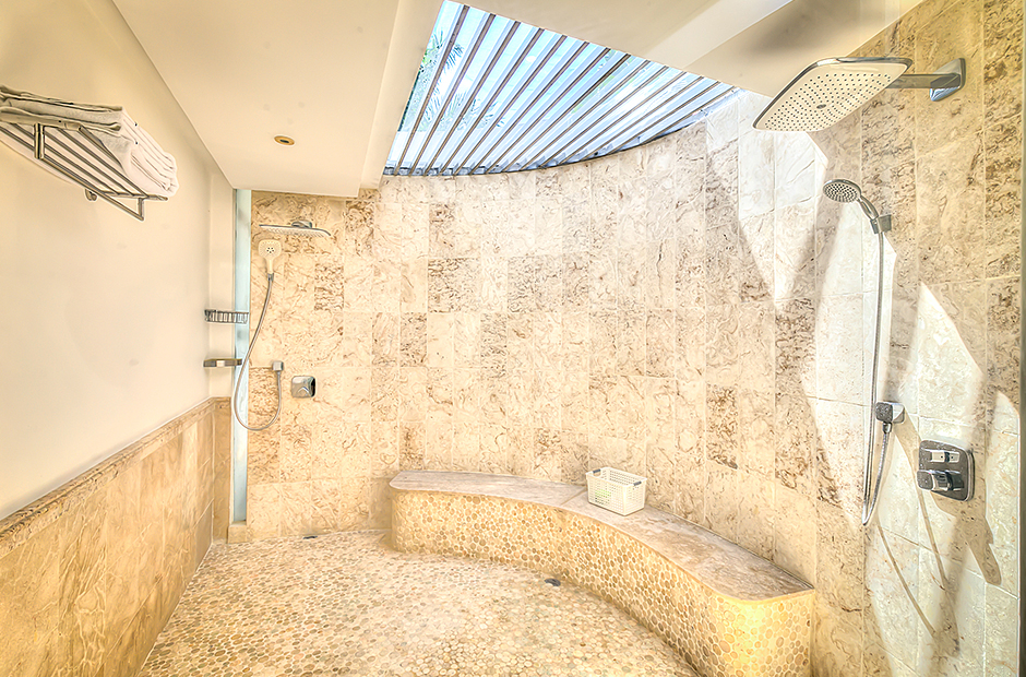 This villa has 6 unconnected and private bedroom cottages. The master bedroom has a king bed, ensuite bathroom, TV, exterior and interior shower. The second bedroom and third bedroom have a king bed, TV, ensuite bathroom, walk-in closet, outdoor and indoor shower each. The fourth bedroom and fifth bedroom have 2 queen beds, TV, ensuite bathroom, walk-in closet, outdoor and indoor shower each. The sixth bedroom has a TV, closet, and bathroom with shower.