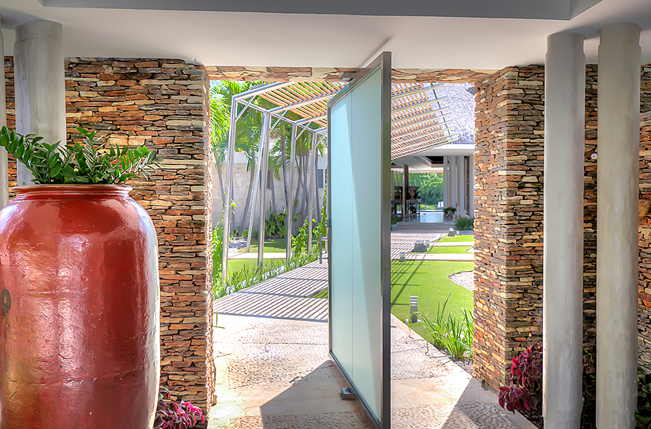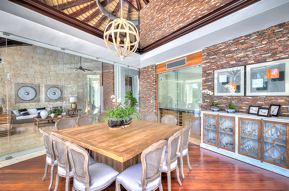 Steering through the main entrance, a long way enhanced with striking stainless pergola guides visitors to the circle-shaped main building. Along the way, each individual bedroom cottage awaits its guests fretfully. The villa offers a fresh decor with penny-farthing bikes in the media room and strident paintings. Most walls have natural stones or coralina slabs, giving an elegant look with the hay ceiling and the wooden beams.