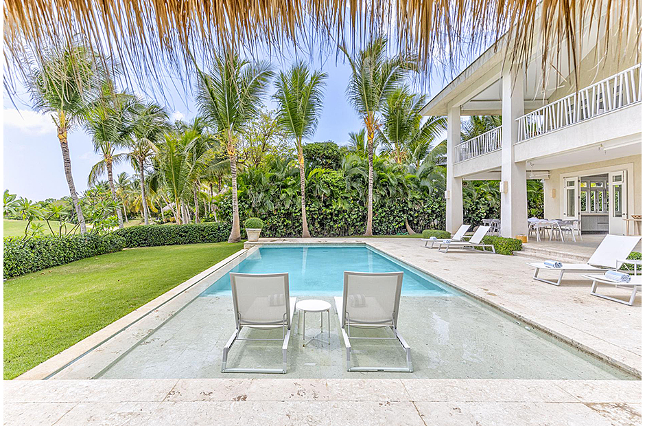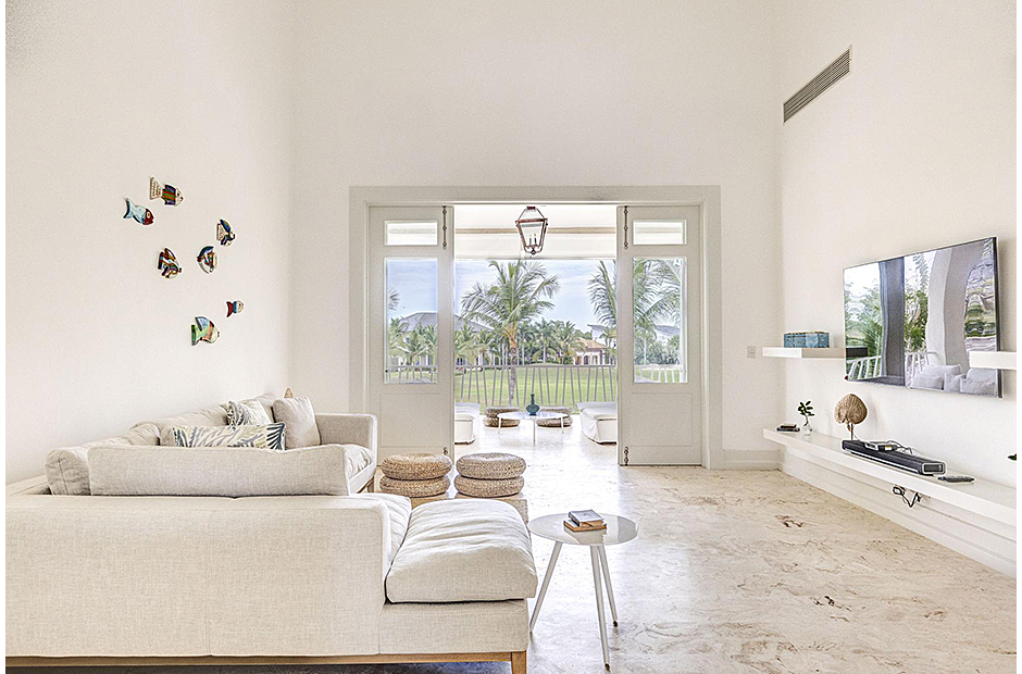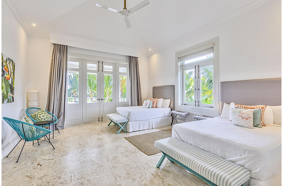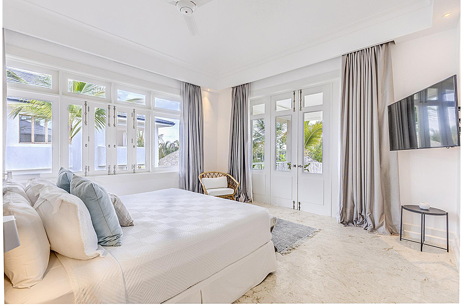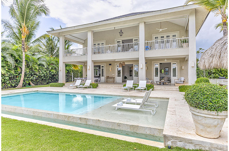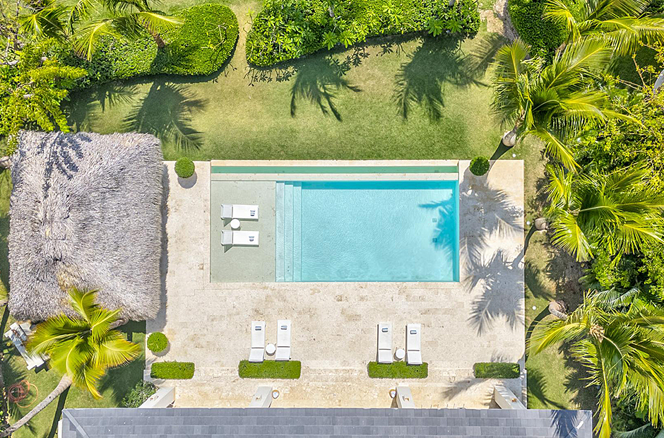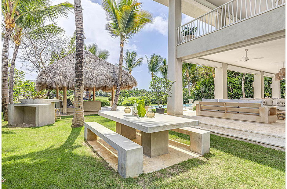 Entering the main gate, a water mirror reflecting the candid Caribbean sun surrounded by coralina tiles is a unique attraction before stepping into the high-ceilinged outdoor foyer with a massive lantern-like chandelier and balcony, staircase to the second floor, and access to the garden. The modern fully equipped kitchen governed by a white with gray stripes offers all you need to prepare a traditional Dominican meal or enjoy breakfast on the island while talking about your beach day. Moving to the living area a rustic chandelier welcomes you to rest on any of it cozy mat chairs or the sofa while gentle breezes sneak in. The dining area offers seats for 12 guests on its large hardwood squared table.