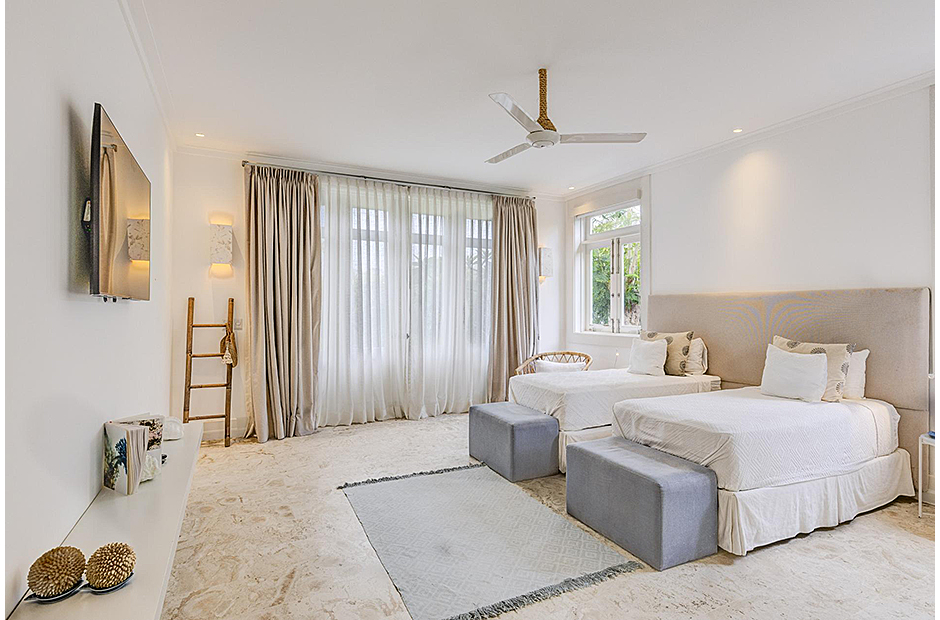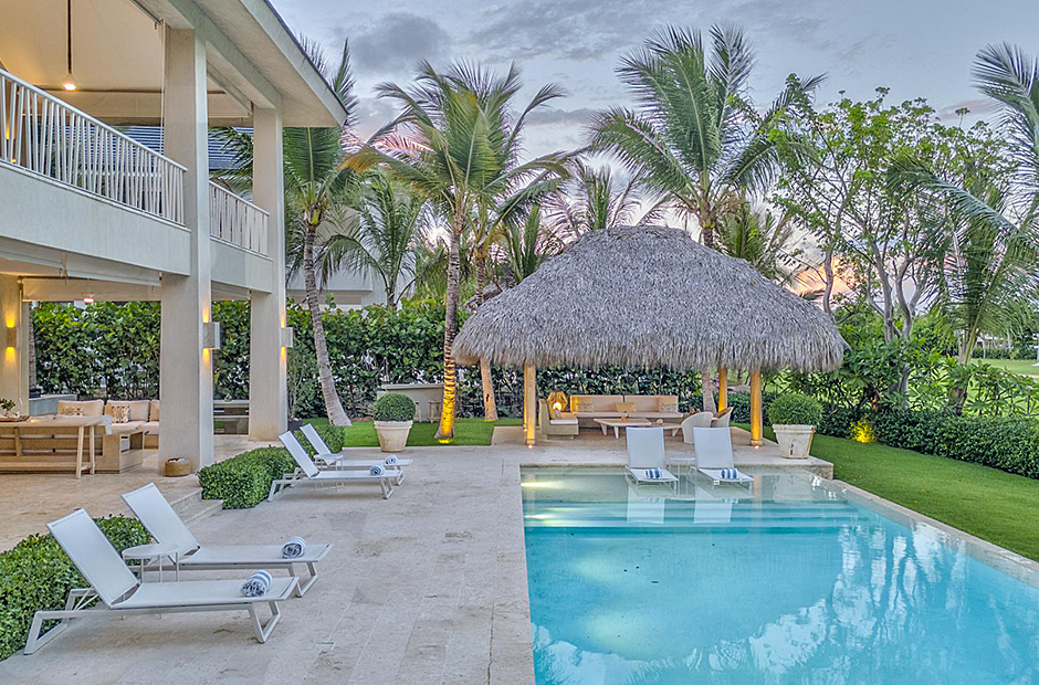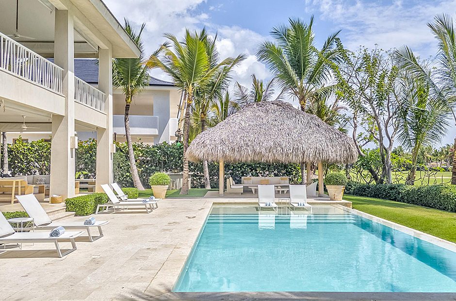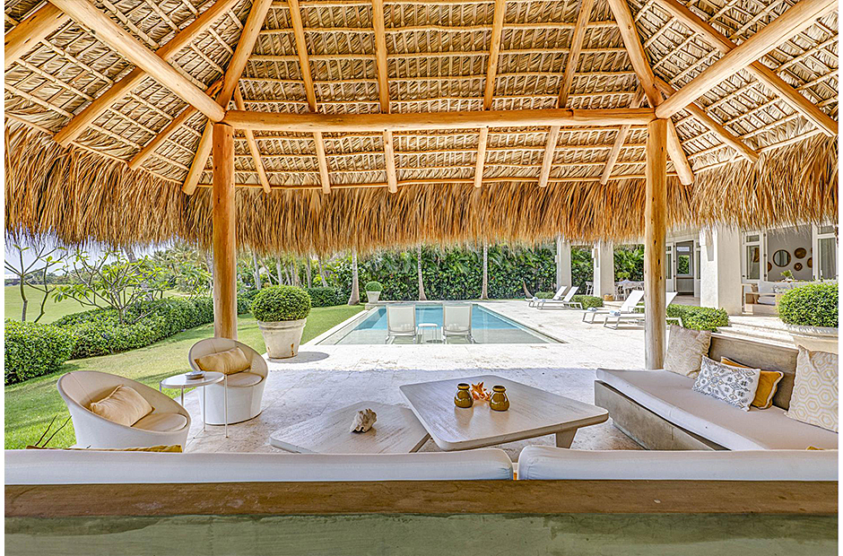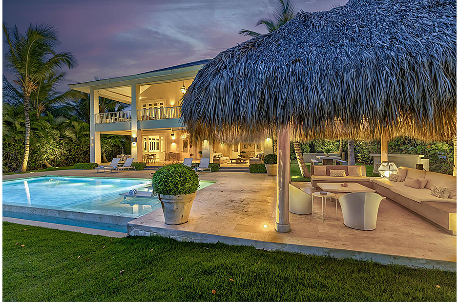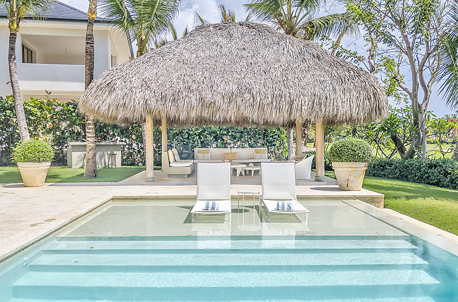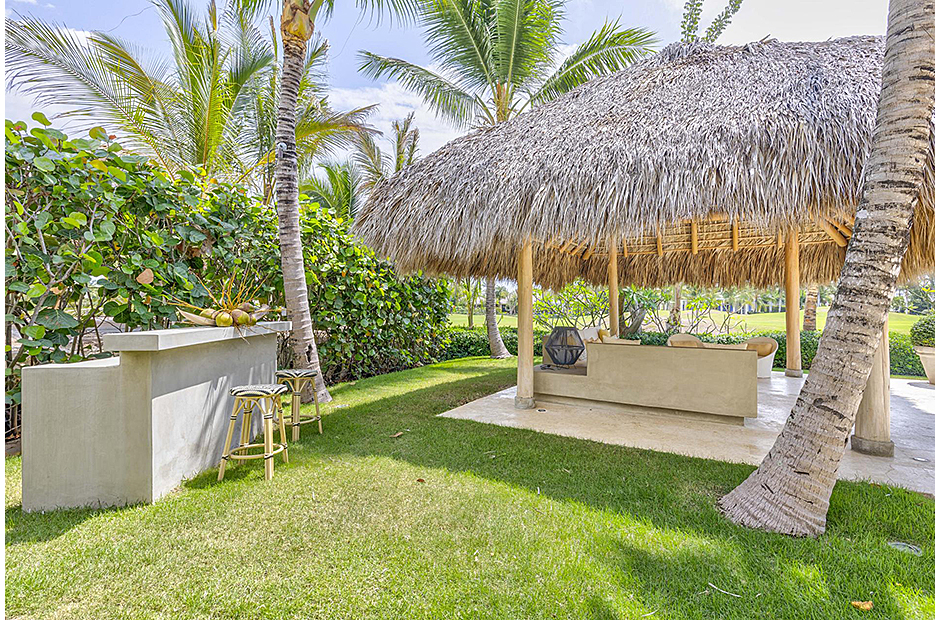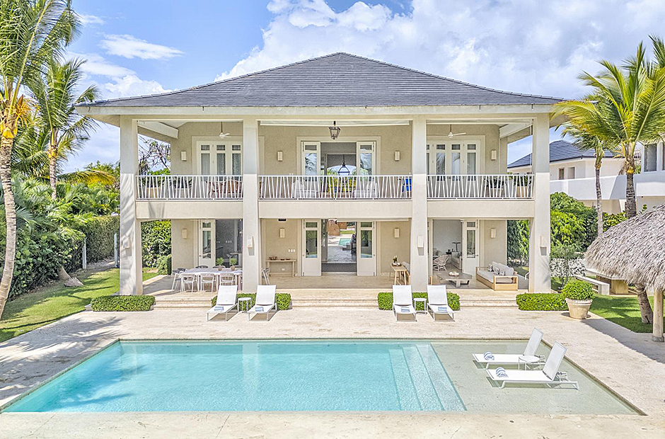 Entering the main gate, a water mirror reflecting the candid Caribbean sun surrounded by coralina tiles is a unique attraction before stepping into the high-ceilinged outdoor foyer with a massive lantern-like chandelier and balcony, staircase to the second floor, and access to the garden. The modern fully equipped kitchen governed by a white with gray stripes offers all you need to prepare a traditional Dominican meal or enjoy breakfast on the island while talking about your beach day. Moving to the living area a rustic chandelier welcomes you to rest on any of it cozy mat chairs or the sofa while gentle breezes sneak in. The dining area offers seats for 12 guests on its large hardwood squared table.