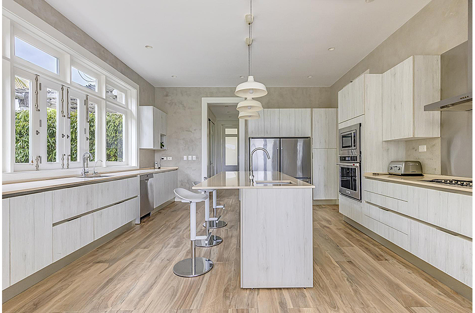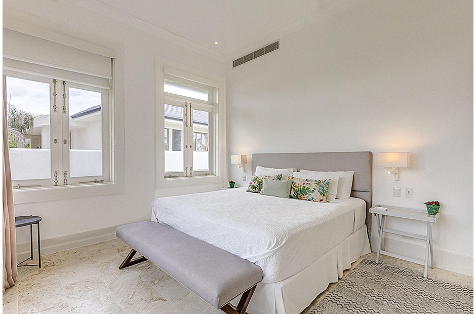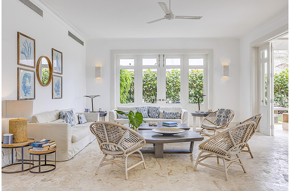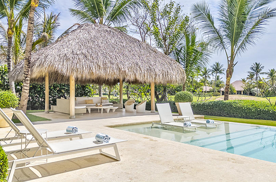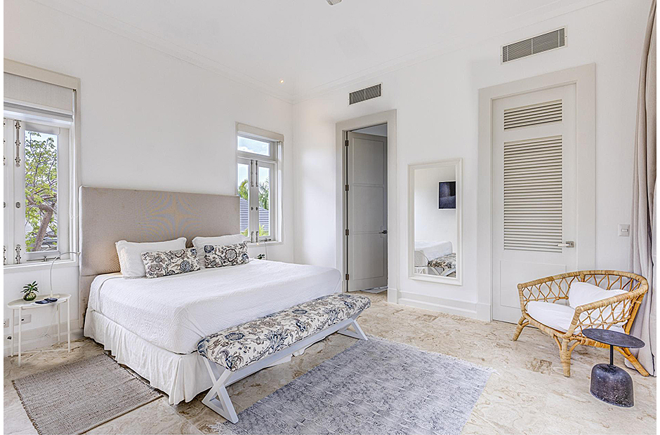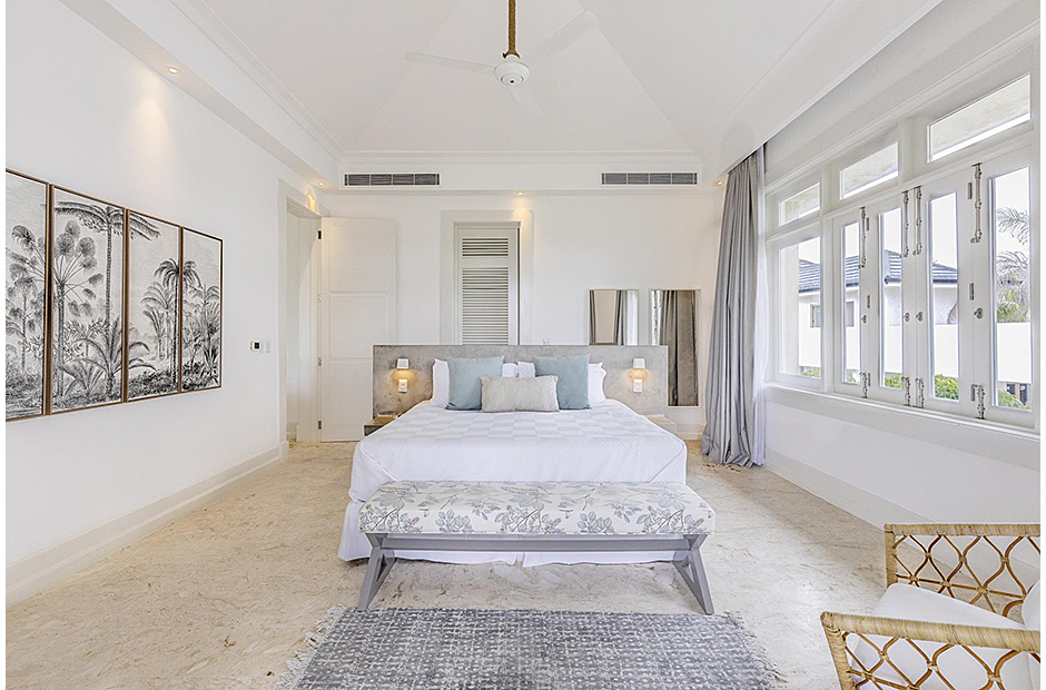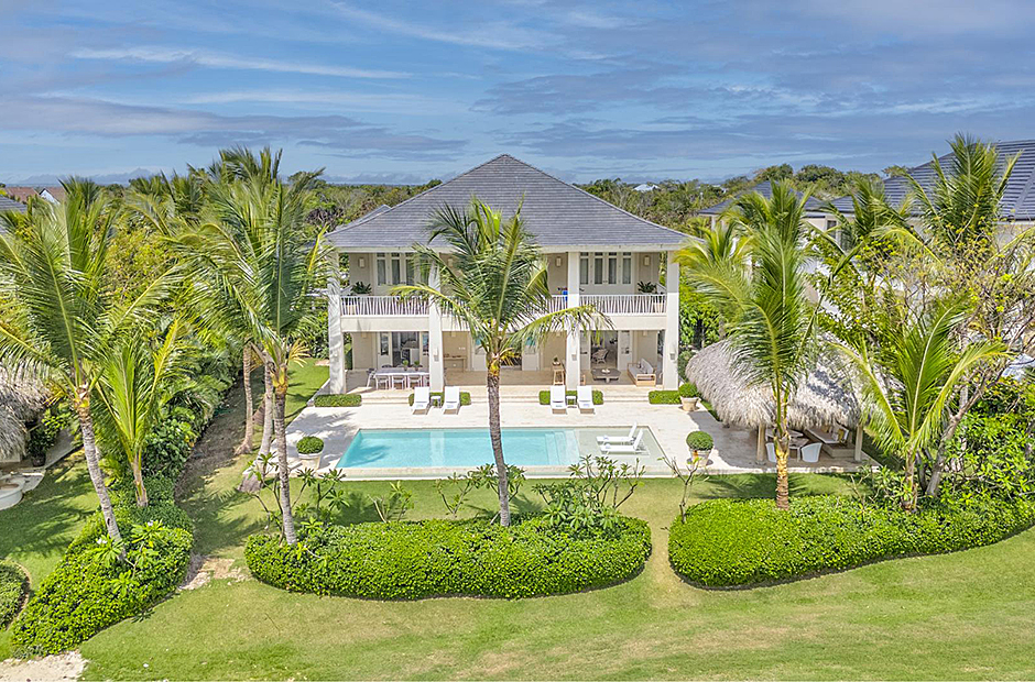 Entering the main gate, a water mirror reflecting the candid Caribbean sun surrounded by coralina tiles is a unique attraction before stepping into the high-ceilinged outdoor foyer with a massive lantern-like chandelier and balcony, staircase to the second floor, and access to the garden. The modern fully equipped kitchen governed by a white with gray stripes offers all you need to prepare a traditional Dominican meal or enjoy breakfast on the island while talking about your beach day. Moving to the living area a rustic chandelier welcomes you to rest on any of it cozy mat chairs or the sofa while gentle breezes sneak in. The dining area offers seats for 12 guests on its large hardwood squared table.