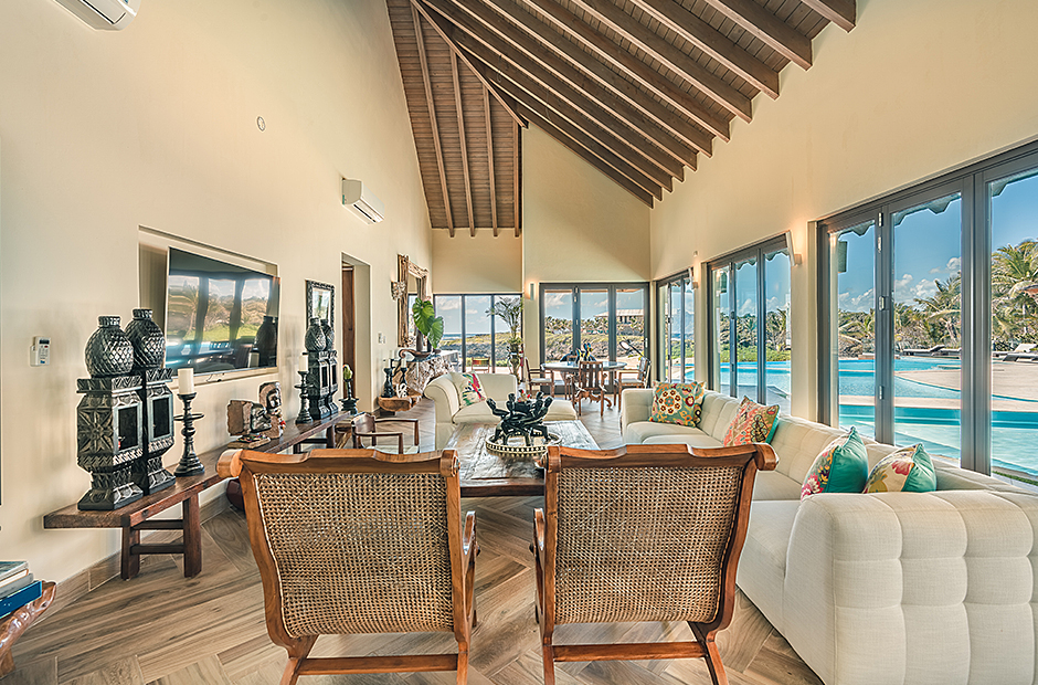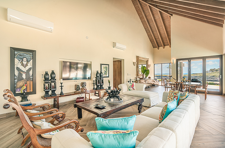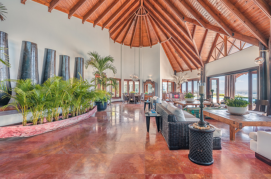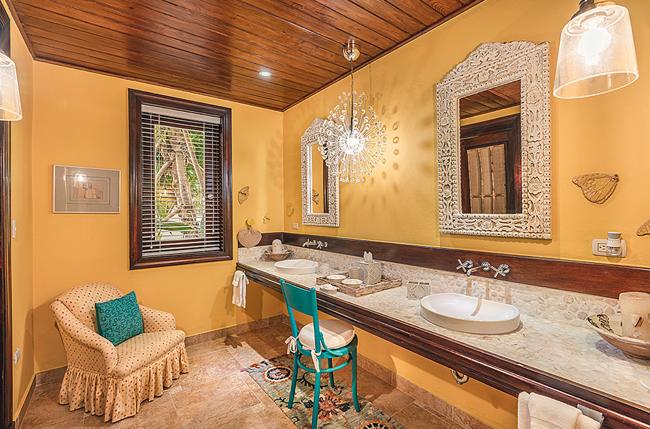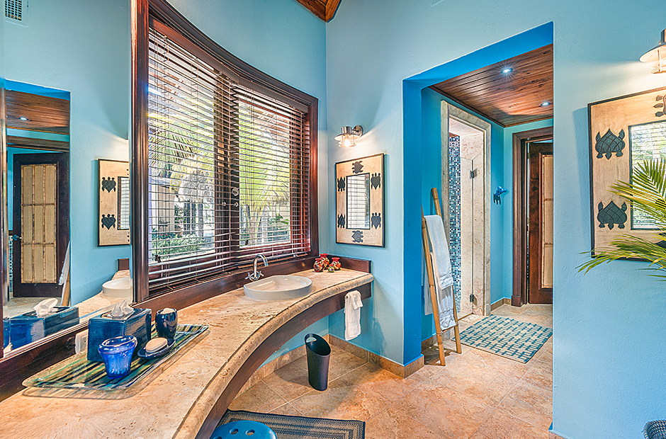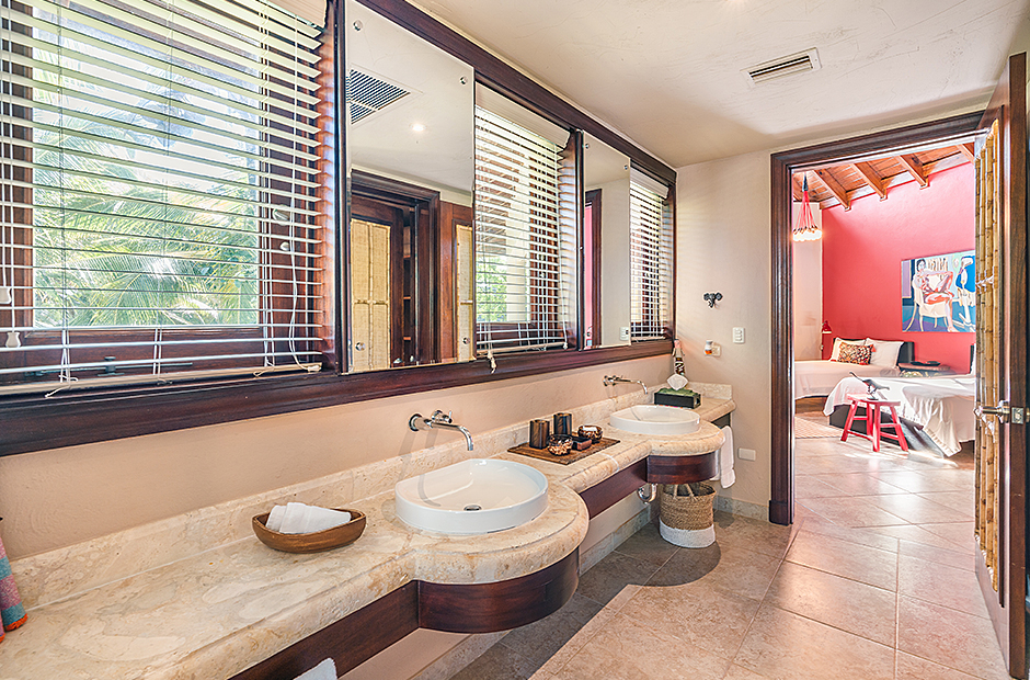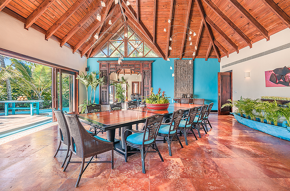 Raised upon a cliff with mesmerizing and outstanding views to the Caribbean Sea, this villa was thought by its owners as a perfect combination and balance between comfortability and the rustic exoticness. Governed by strident colors and hardwood, the main entrance welcomes you offering warmth and a mystic ambiance taking you to the dining room, presented with a high wooden roof and decorated with remarkable African details that will keep you focused for a while and a large wooden table with 14 seats lighted by a modern chandelier interrupting the rustic atmosphere. Next is the impressive living room with exquisite views to the Beach and the Caribbean sea and the vaulted high-ceiling with wood, endowed with a comfy sitting area and a large table.