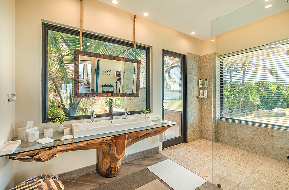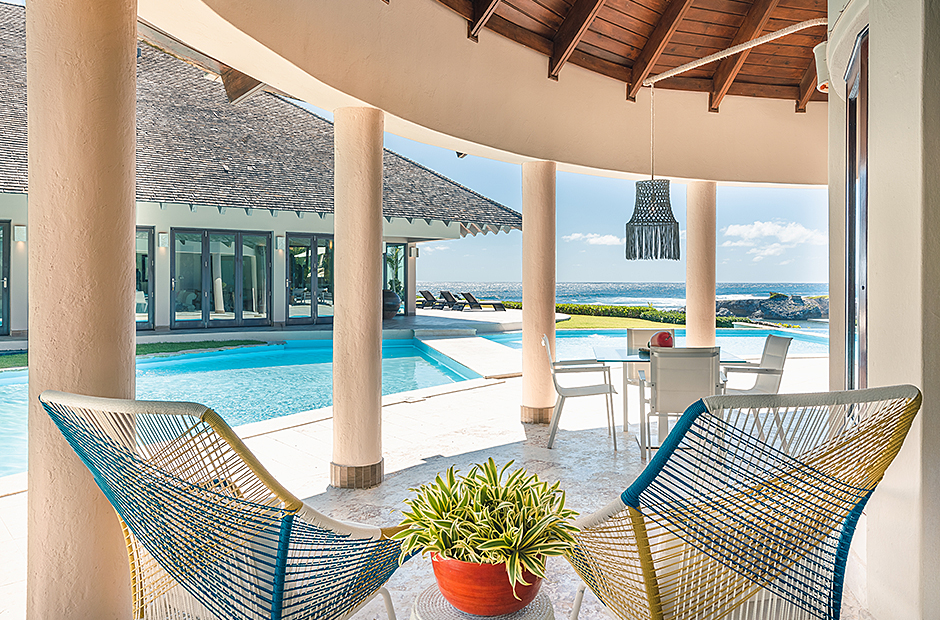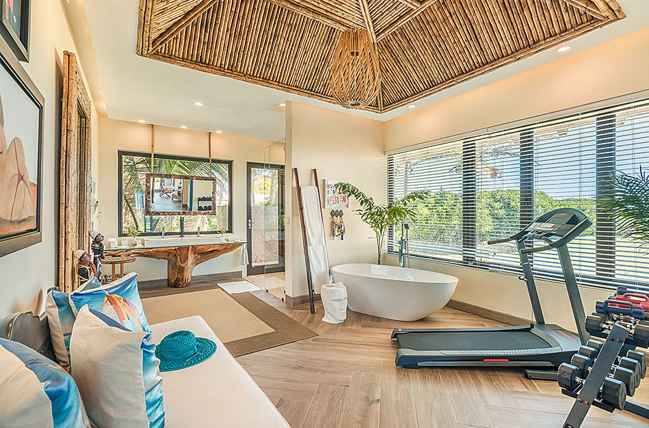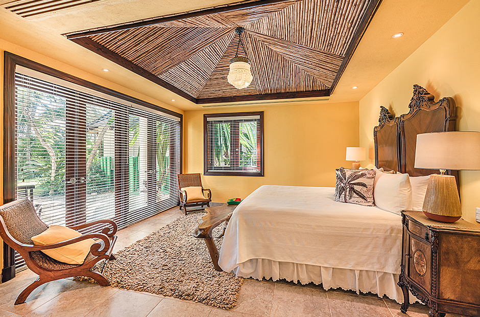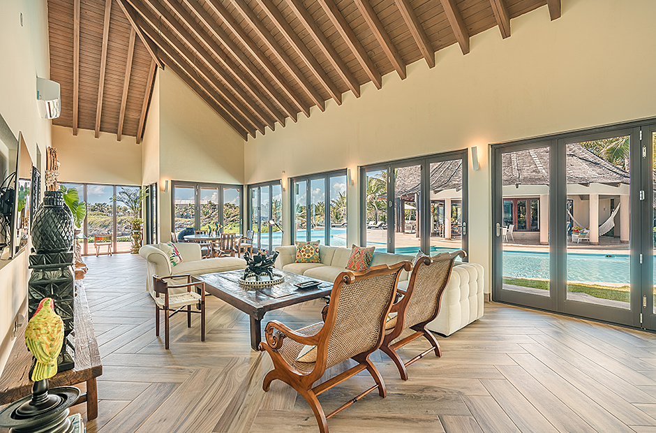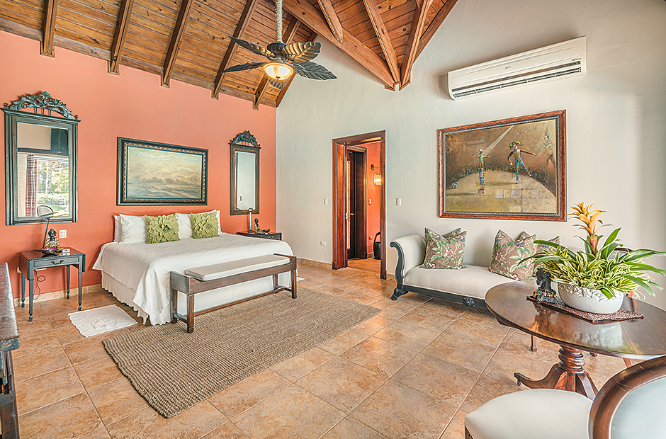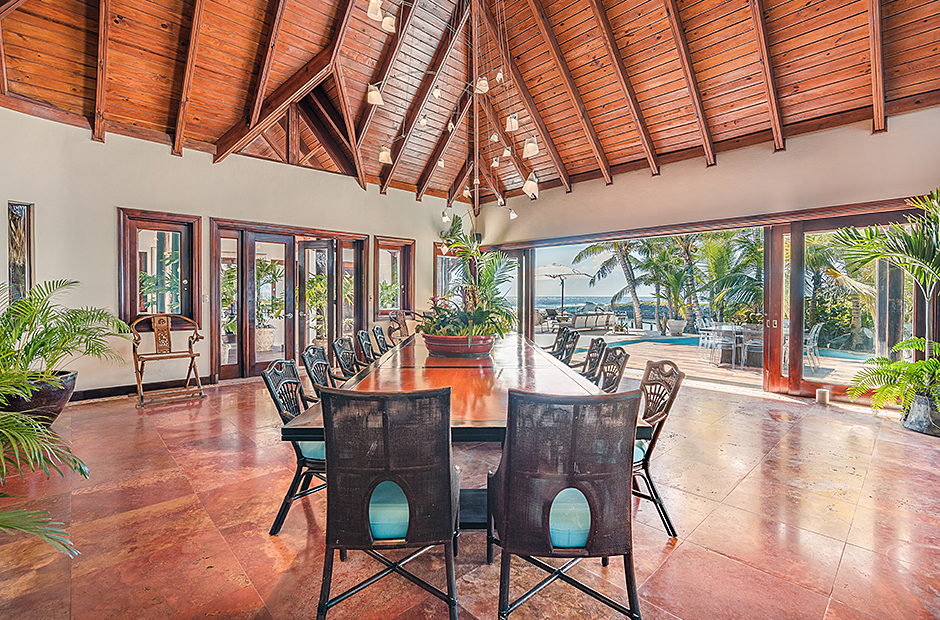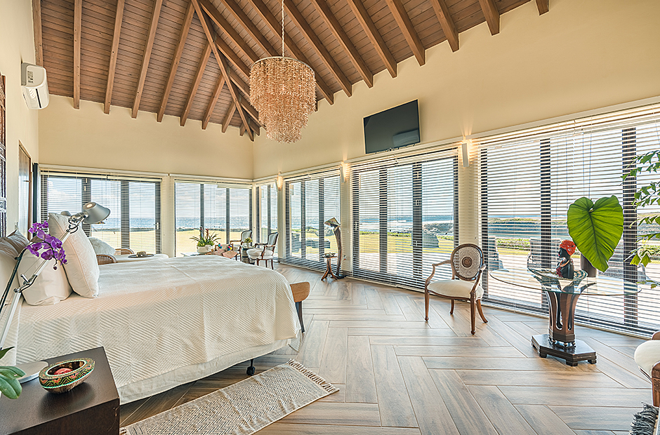 Raised upon a cliff with mesmerizing and outstanding views to the Caribbean Sea, this villa was thought by its owners as a perfect combination and balance between comfortability and the rustic exoticness. Governed by strident colors and hardwood, the main entrance welcomes you offering warmth and a mystic ambiance taking you to the dining room, presented with a high wooden roof and decorated with remarkable African details that will keep you focused for a while and a large wooden table with 14 seats lighted by a modern chandelier interrupting the rustic atmosphere. Next is the impressive living room with exquisite views to the Beach and the Caribbean sea and the vaulted high-ceiling with wood, endowed with a comfy sitting area and a large table.