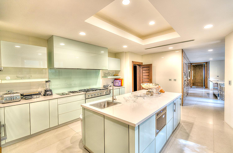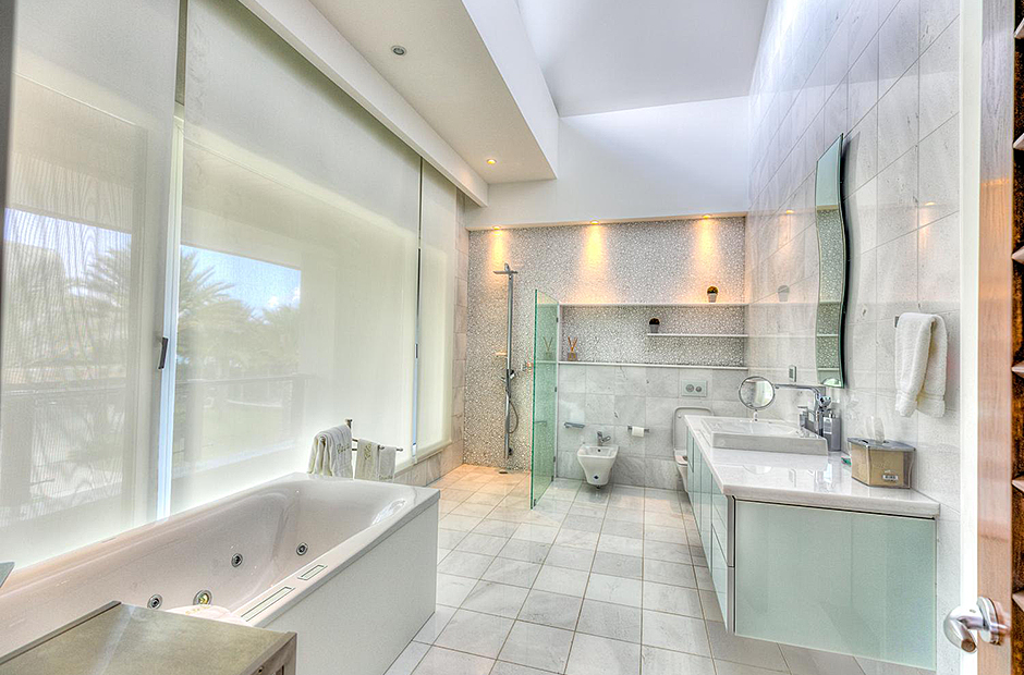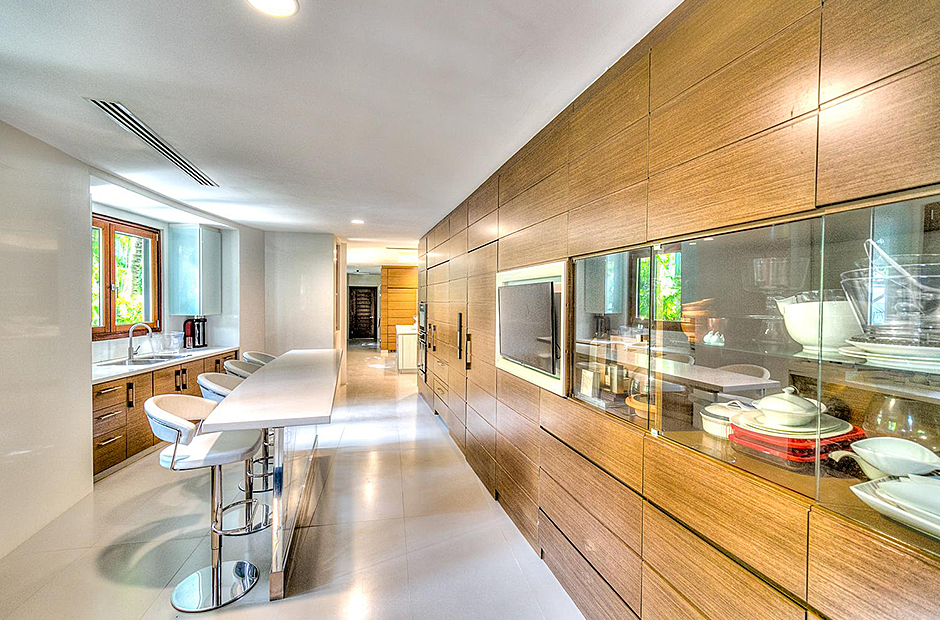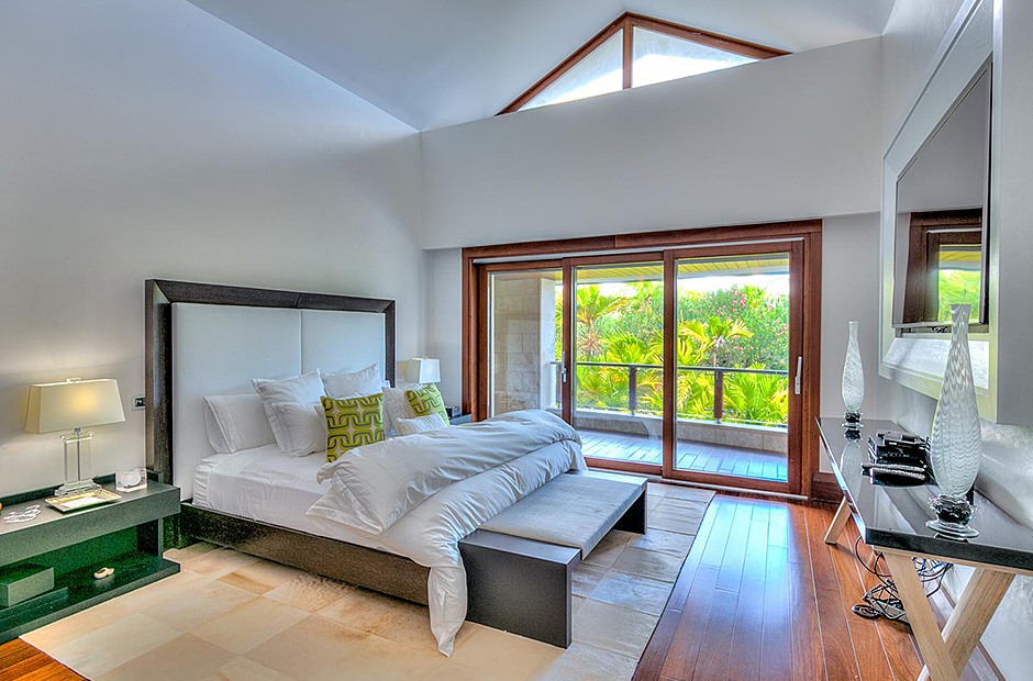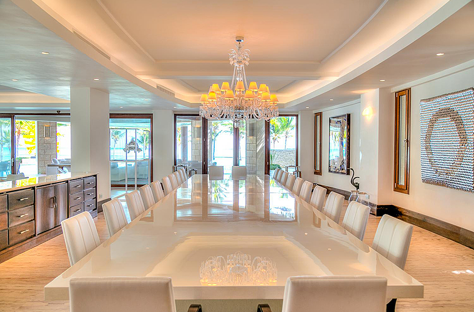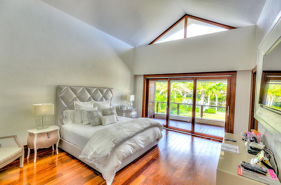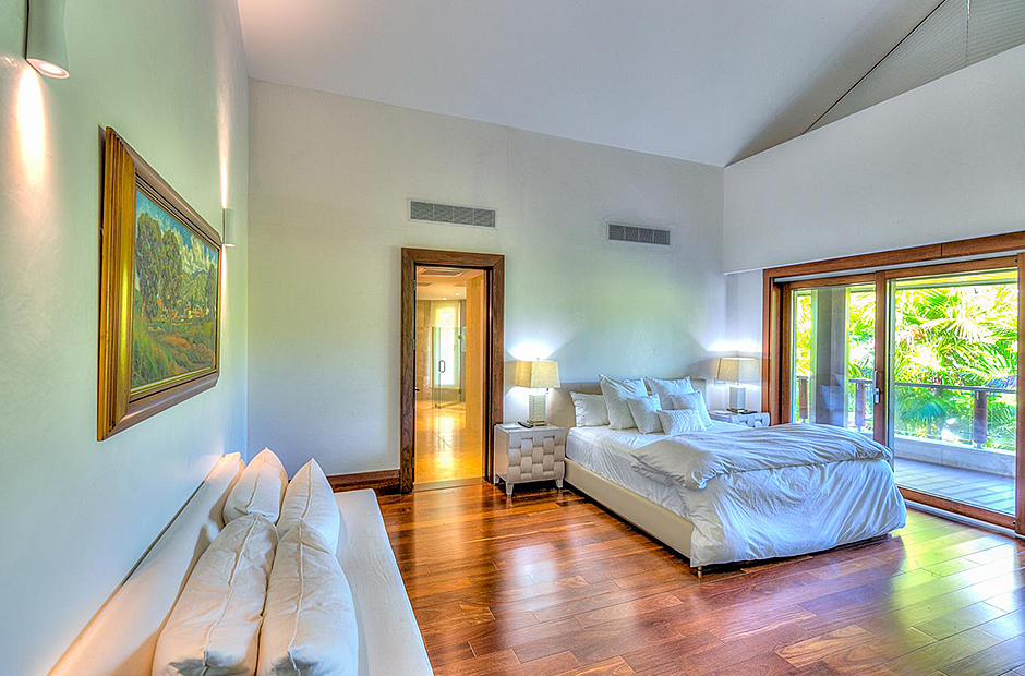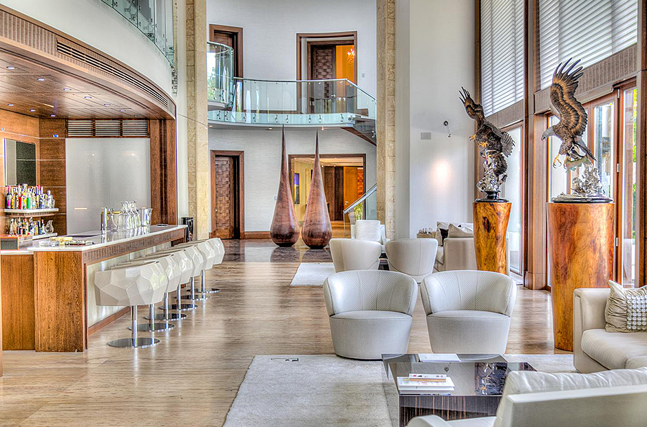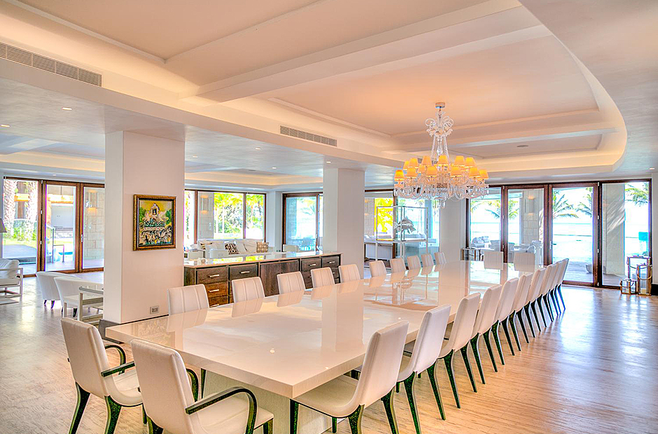 On one wing, the elevated ceilings guide you to the lounge area with picture windows and a comfortable sitting area waits for the guests, while they think of choosing a margarita or martini at the adjacent wet bar. To the other wing, the large living room with the white-marbled piano is the ideal spot to discuss the next place to visit or prepare local dishes in the fully equipped kitchen. At dinner time invite all family member you could think of because they will find space at the 24-seats table, lighted by the classy glass chandelier.