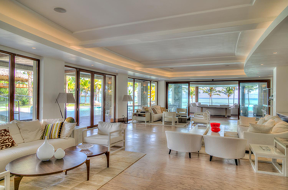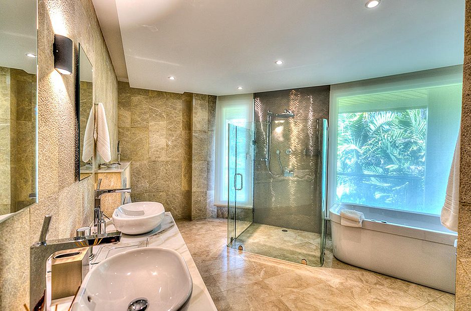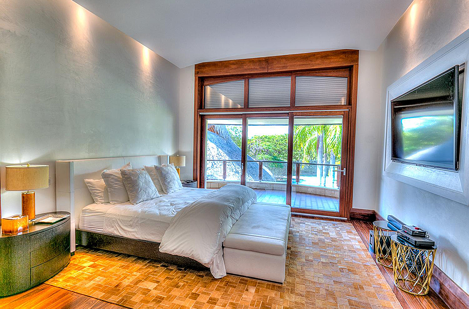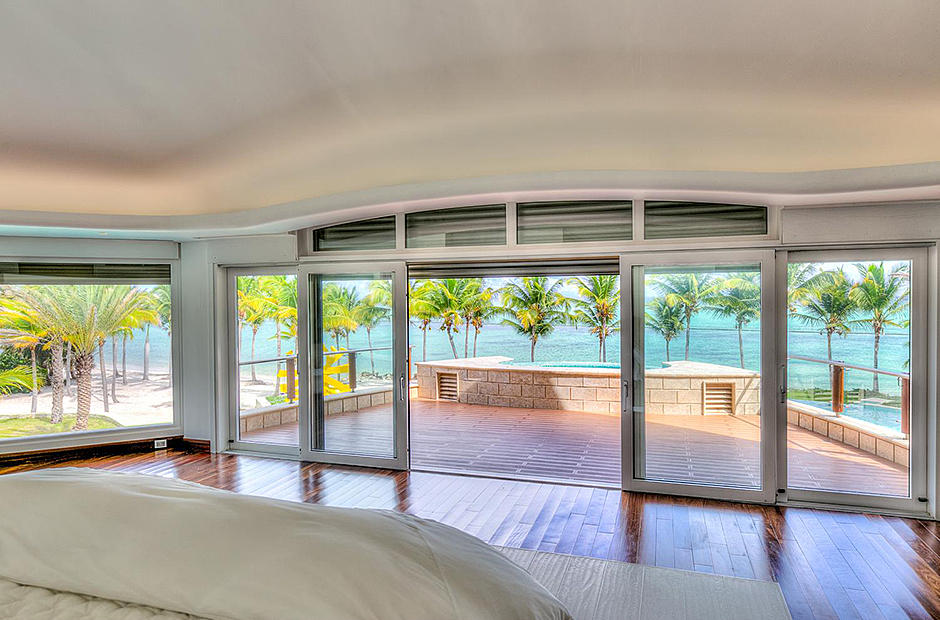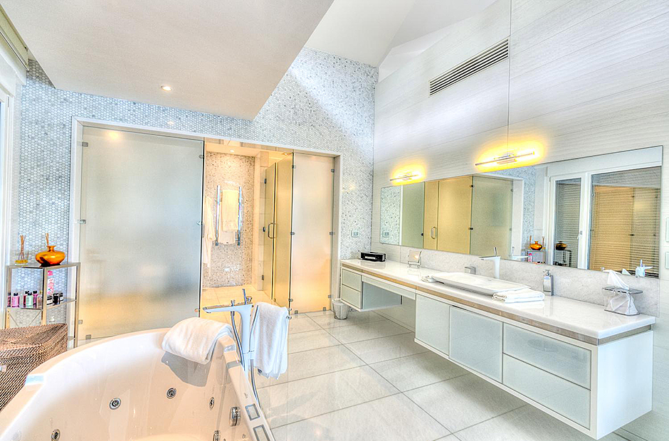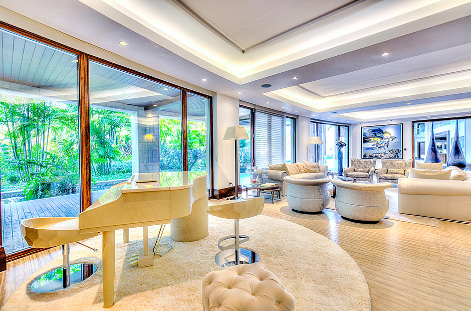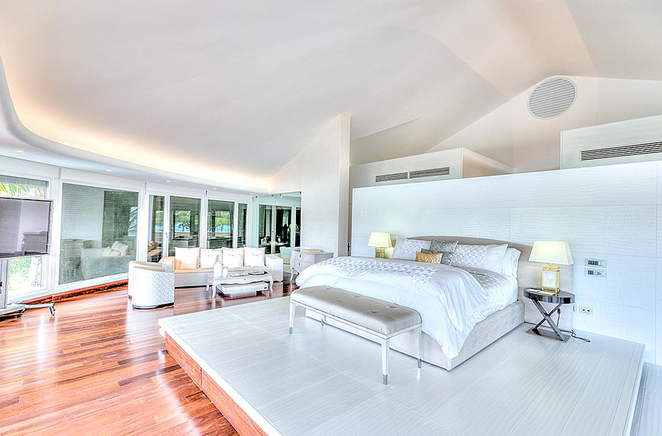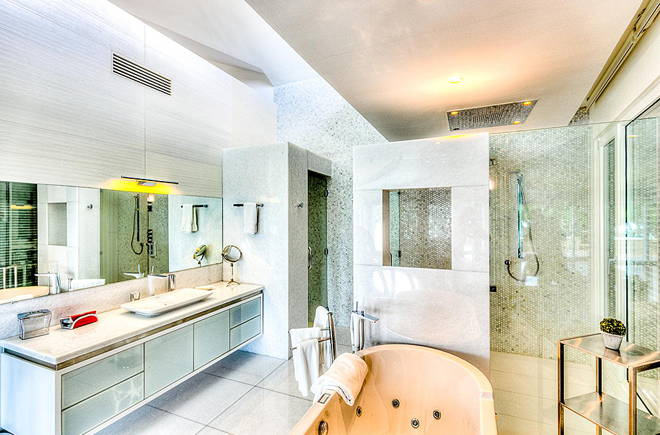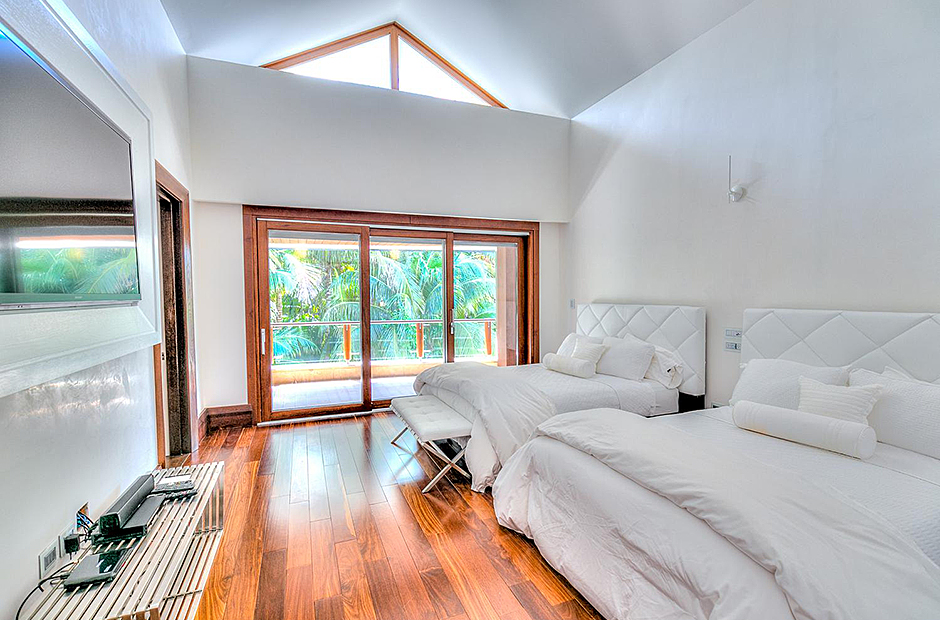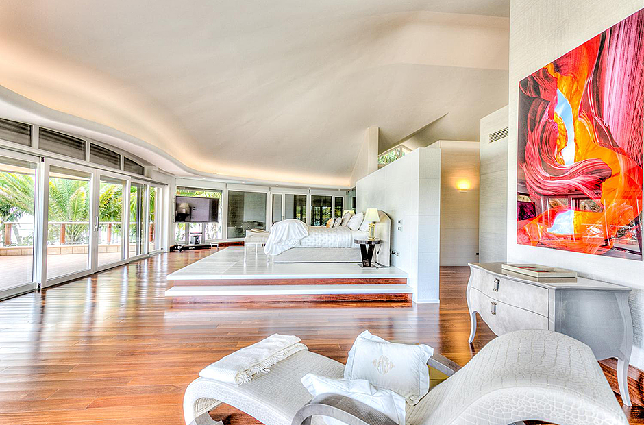 On one wing, the elevated ceilings guide you to the lounge area with picture windows and a comfortable sitting area waits for the guests, while they think of choosing a margarita or martini at the adjacent wet bar. To the other wing, the large living room with the white-marbled piano is the ideal spot to discuss the next place to visit or prepare local dishes in the fully equipped kitchen. At dinner time invite all family member you could think of because they will find space at the 24-seats table, lighted by the classy glass chandelier.