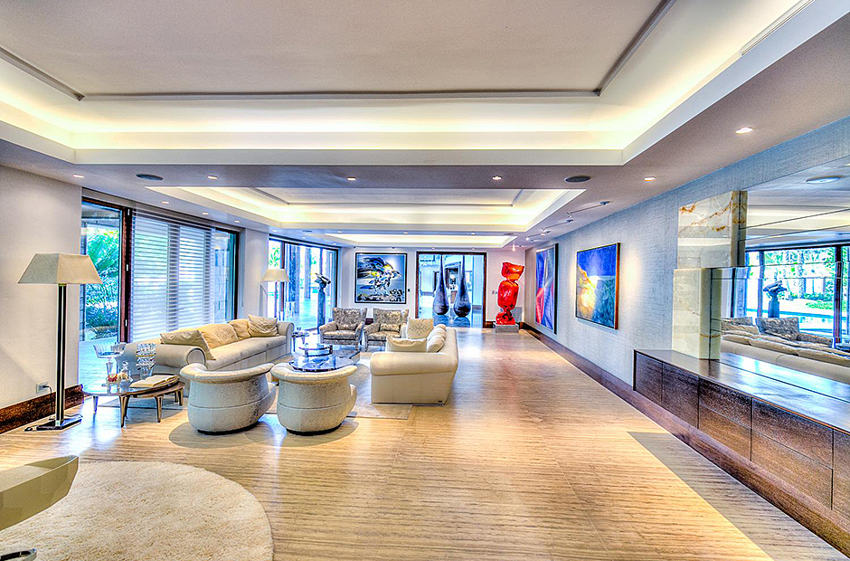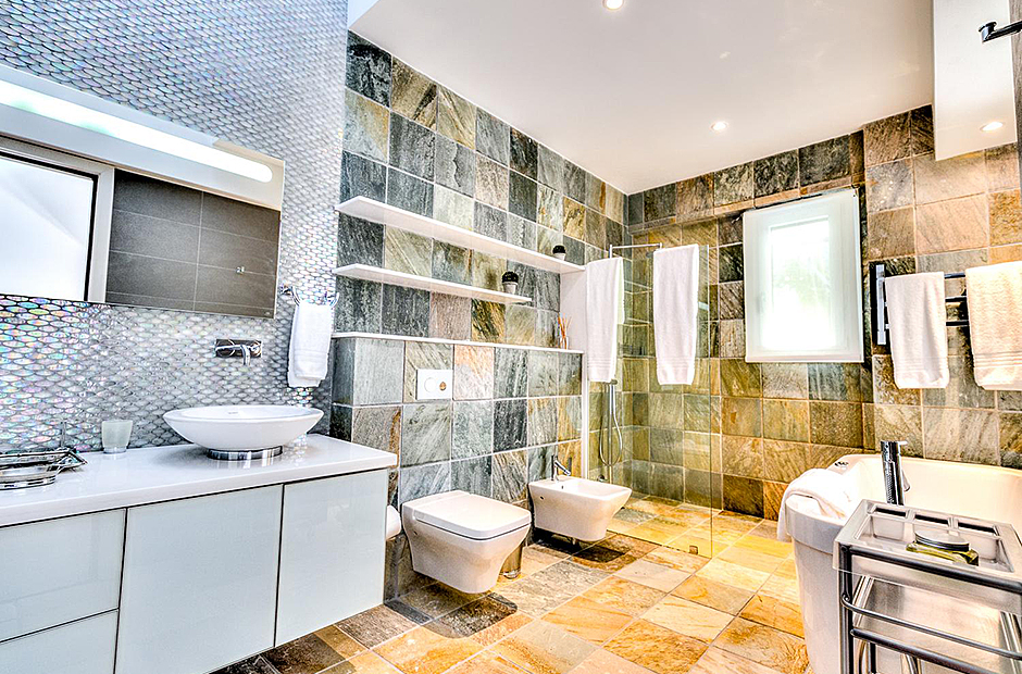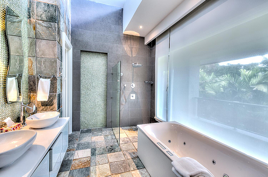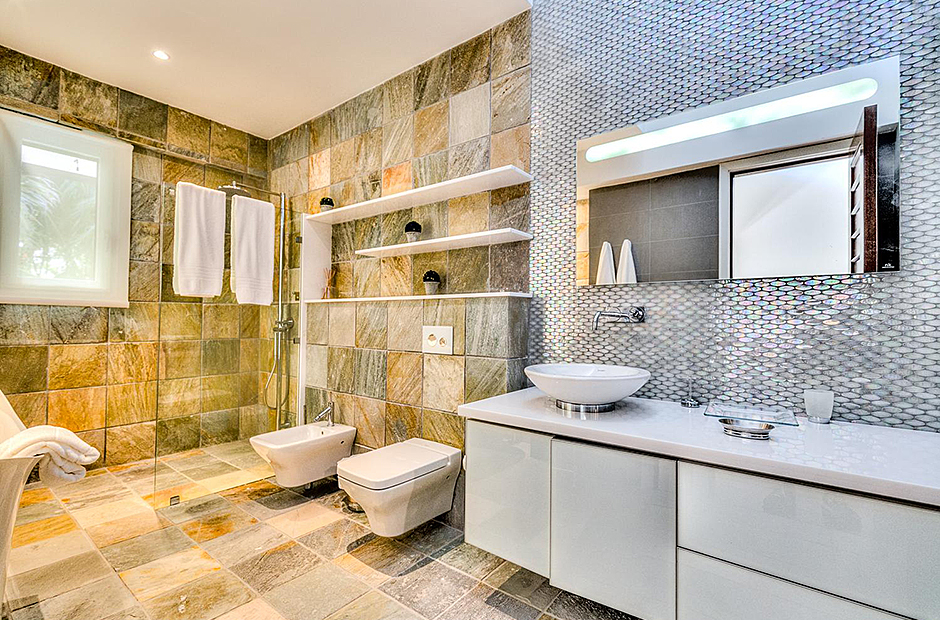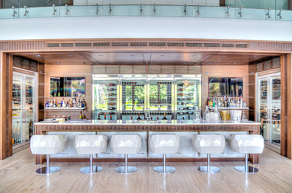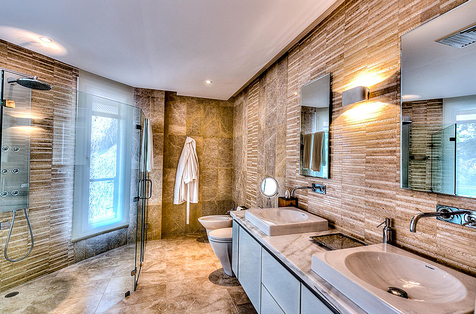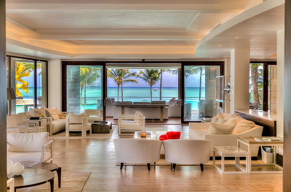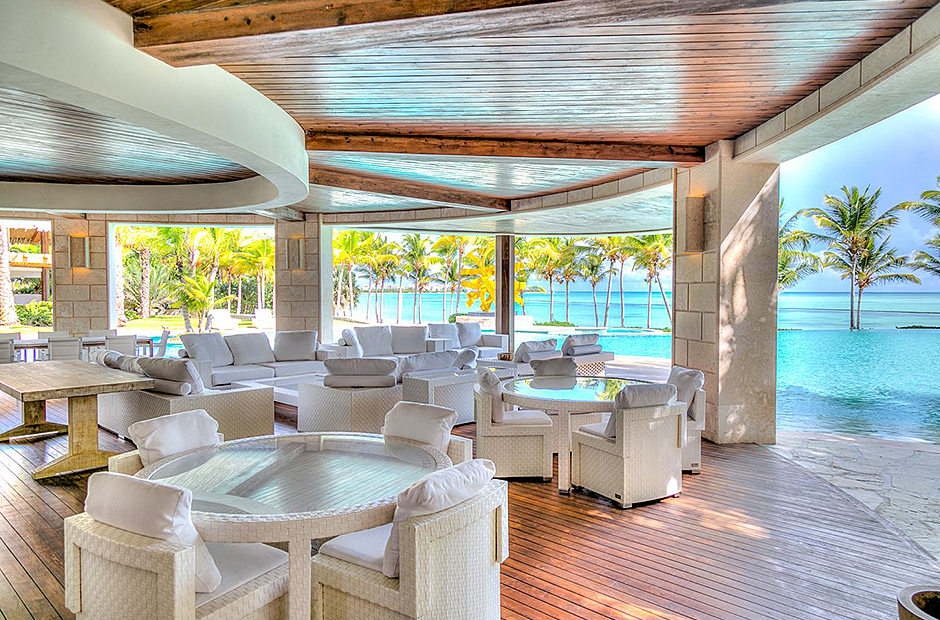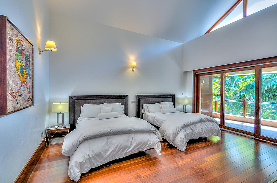 On one wing, the elevated ceilings guide you to the lounge area with picture windows and a comfortable sitting area waits for the guests, while they think of choosing a margarita or martini at the adjacent wet bar. To the other wing, the large living room with the white-marbled piano is the ideal spot to discuss the next place to visit or prepare local dishes in the fully equipped kitchen. At dinner time invite all family member you could think of because they will find space at the 24-seats table, lighted by the classy glass chandelier.