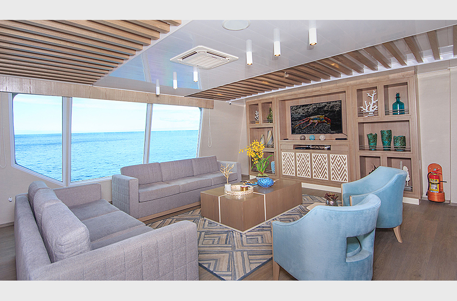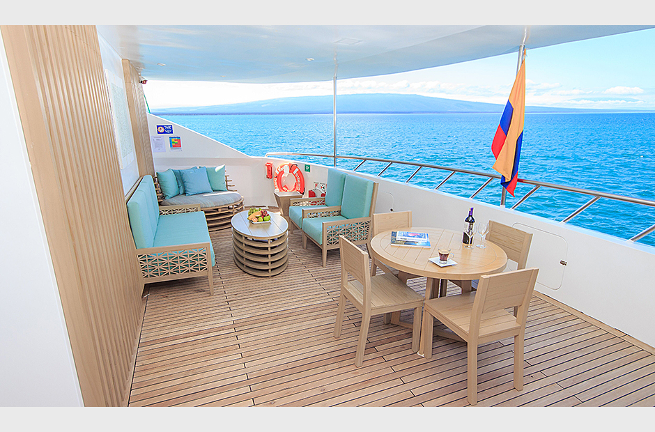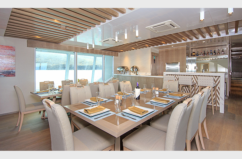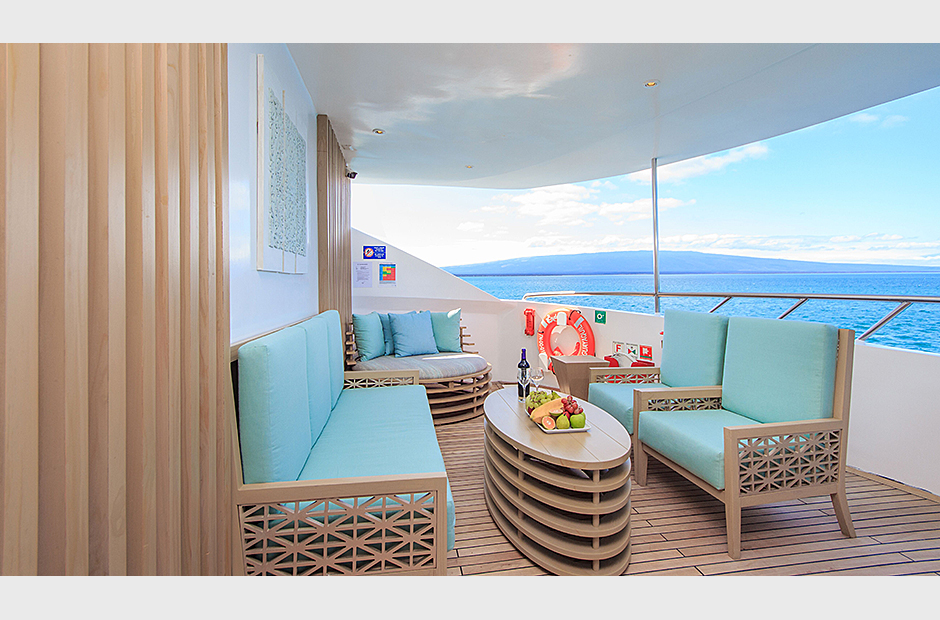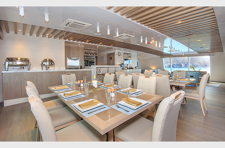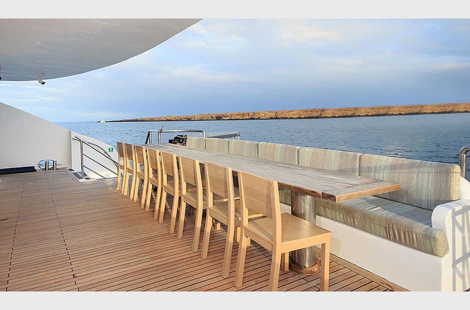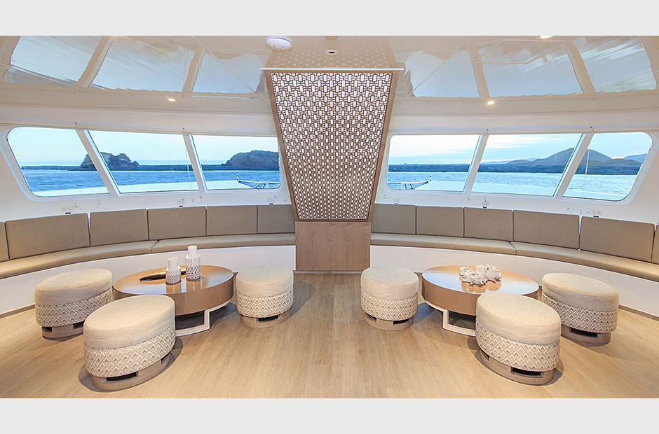 On the Main Deck, there is a briefing area for briefings, lectures, and it is also the point of information for Galapagos travel with videos, books, and personalized assistance. The interior passengers lounge and dining area offer also panoramic view of the islands during navigations and excursions, while enjoying exquisite cuisine. Two platforms allow passengers on and off the catamaran, offering super easy access to the yacht.