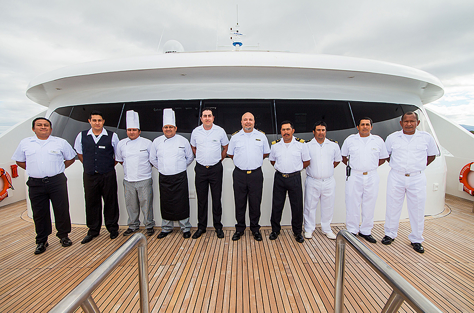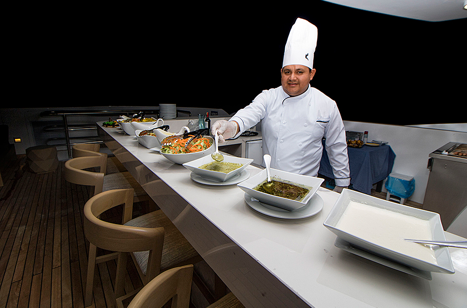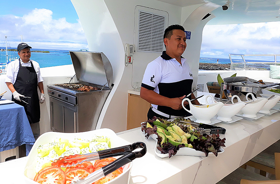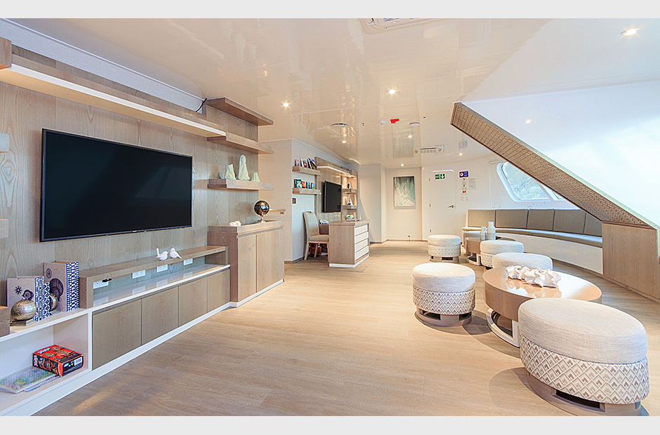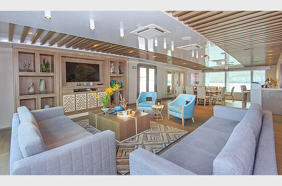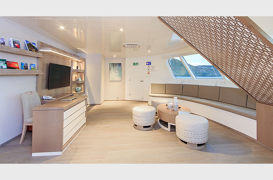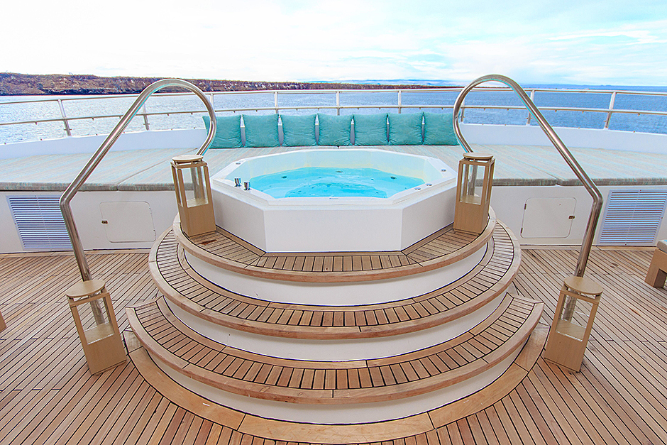 On the Main Deck, there is a briefing area for briefings, lectures, and it is also the point of information for Galapagos travel with videos, books, and personalized assistance. The interior passengers lounge and dining area offer also panoramic view of the islands during navigations and excursions, while enjoying exquisite cuisine. Two platforms allow passengers on and off the catamaran, offering super easy access to the yacht.