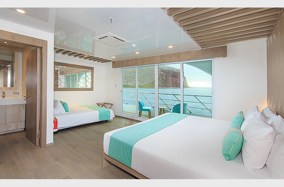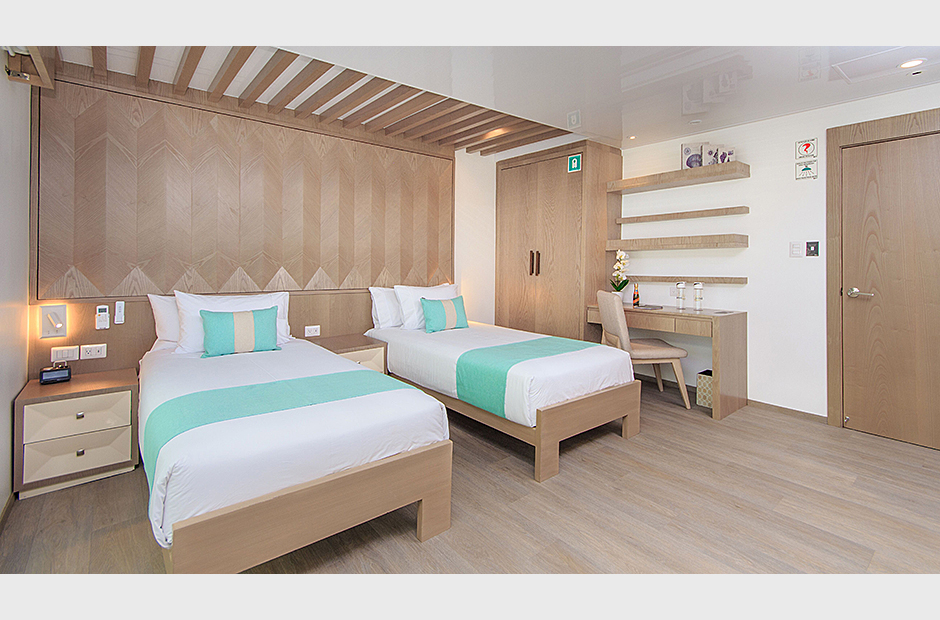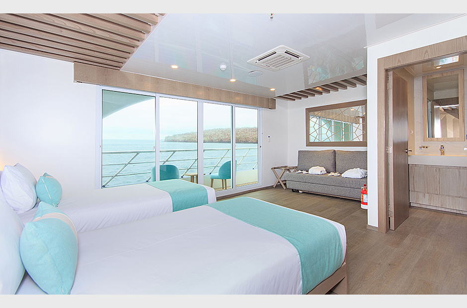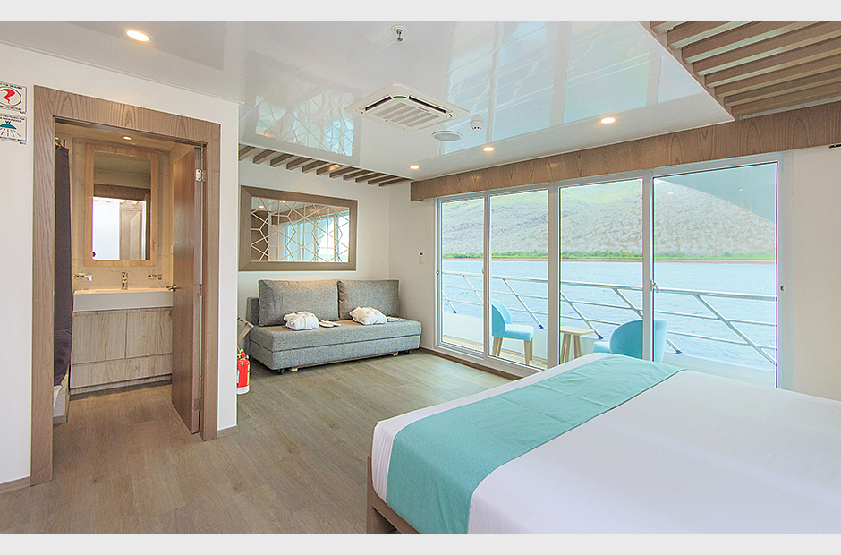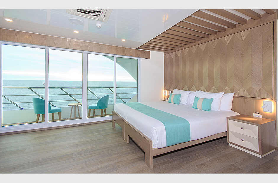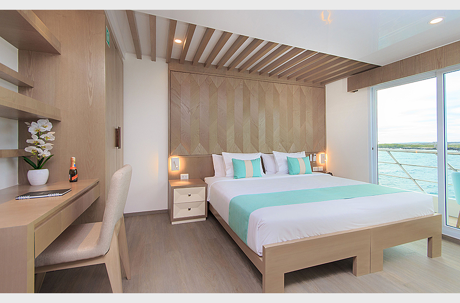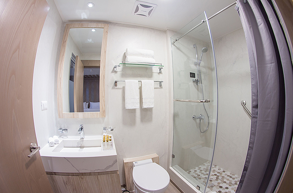 On board the ship, the eight Golden Panoramic Suites are airy and comfortable, four of them are located on main deck and the rest on the upper deck. Each suite has a private balcony; all suites have personalized marine air conditioning control and panoramic views of the islands due to its floor to ceiling/wall to wall glass doors instead of walls toward the outside. A small social area, closet/drawer, desk and sofa-bed are part of each suite as well. Matrimonial king size or two single twin beds are available in each suite for flexible accommodation. Private bathroom, hot and cold water and amenities.
