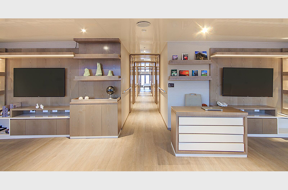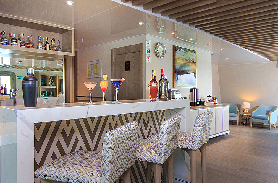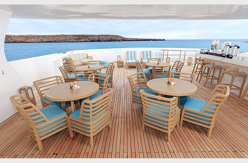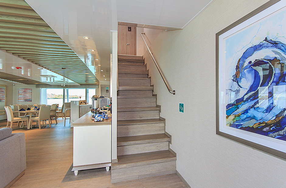 Passengers access our Upper Deck through interior steps. There are four suites, a sun terrace and a secluded social area for relaxation and wildlife observation. There is also a single cabin with private balcony as well. Passengers can also reach the upper levels through our exterior steps.