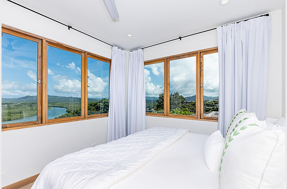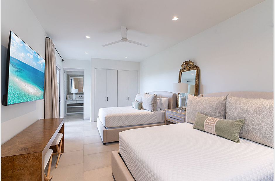 Bedroom 4: Two Queen Beds (Ensuite Bathroom, Safe, Smart TV, AC, Ceiling Fans, Balcony, Ocean Views, Closet).