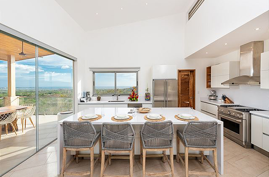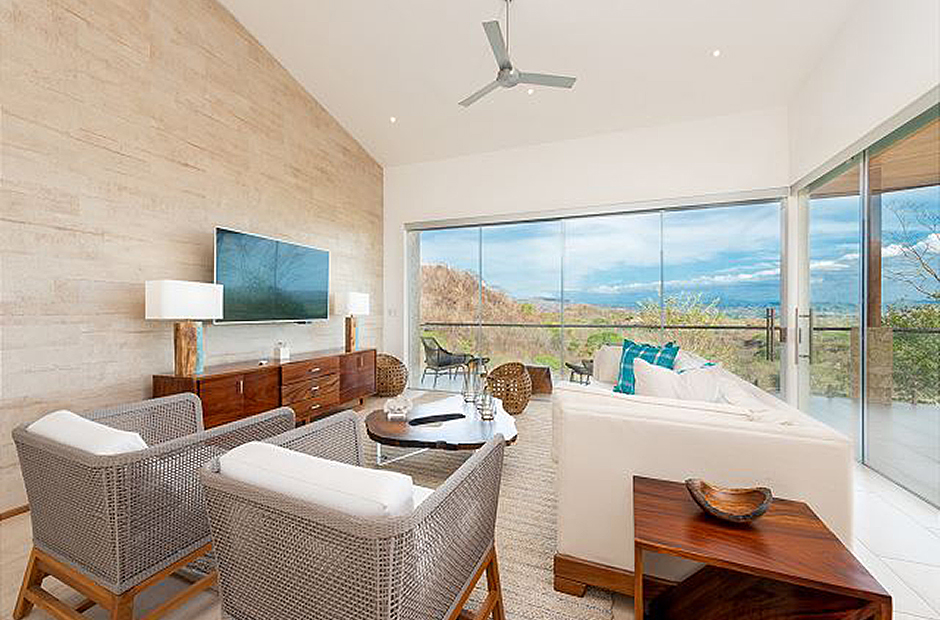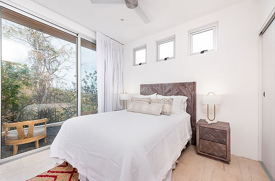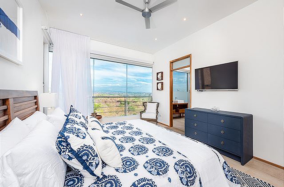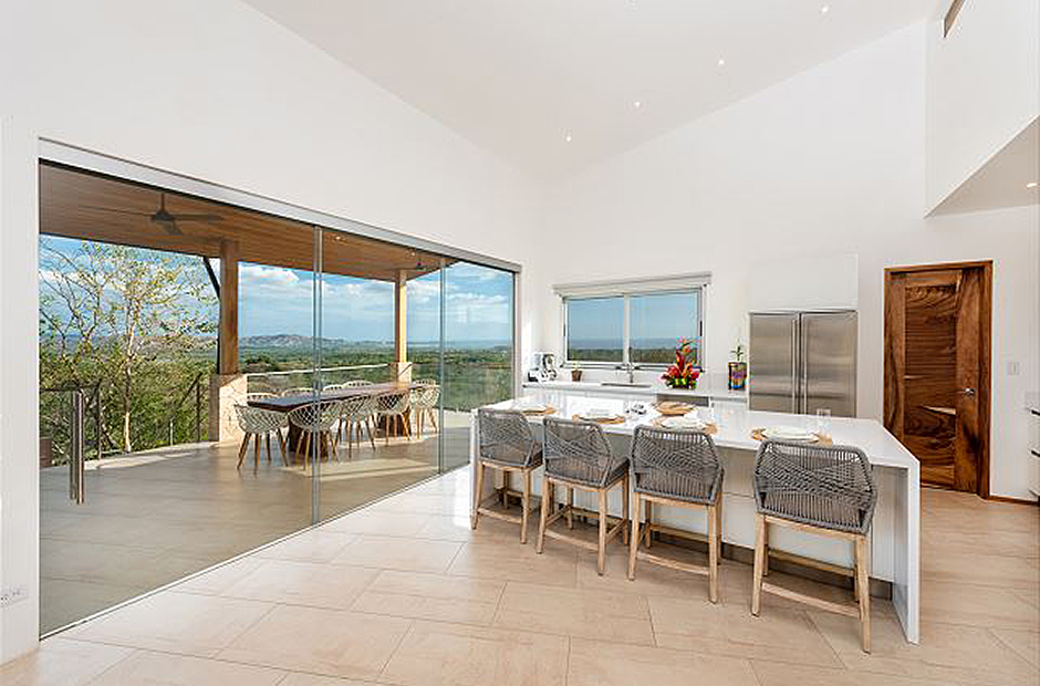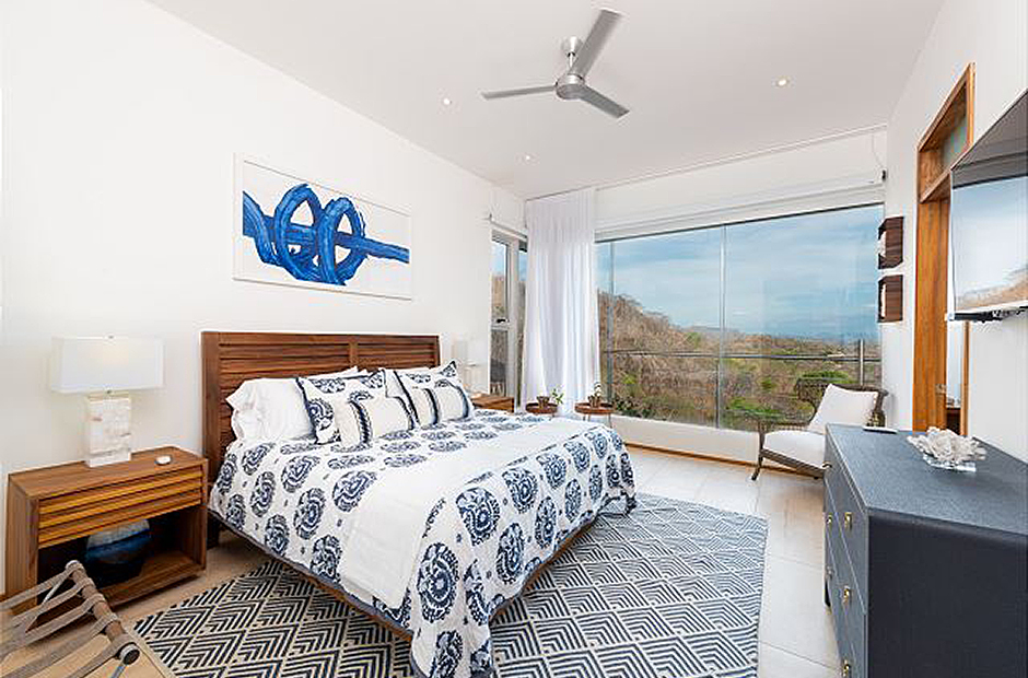 Oversized glass doors and windows provide you with a living panorama of the Guanacaste countryside in every room of the house. The sunny indoor common area is a single space where the living room, dining room, and kitchen blend together into the space where you will spend unforgettable hours with your family and friends during your Costa Rica vacation. The sleek modern kitchen is fully equipped and gourmet-ready, and comfortable furniture in the living area provides a place to relax in front of a flat-screen tv. Enjoy cable television, wi-fi service and of course air conditioning throughout the villa.
