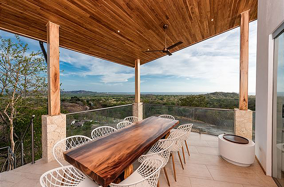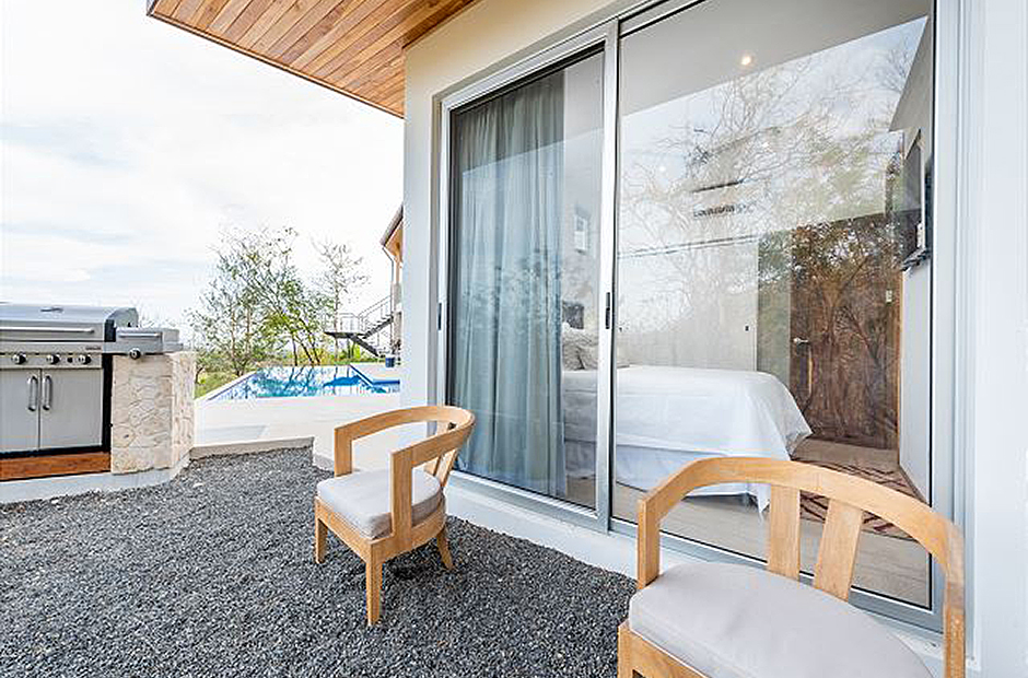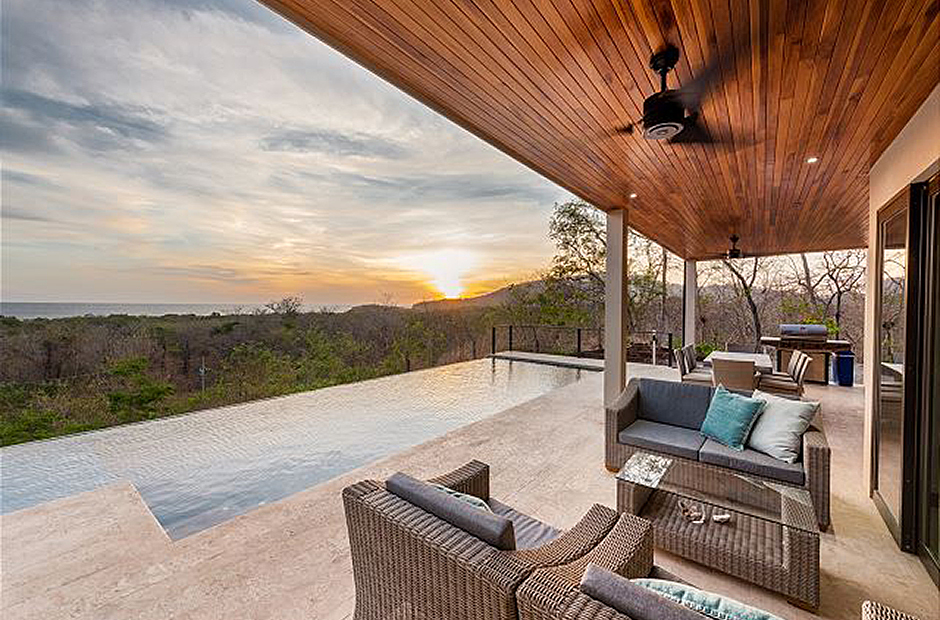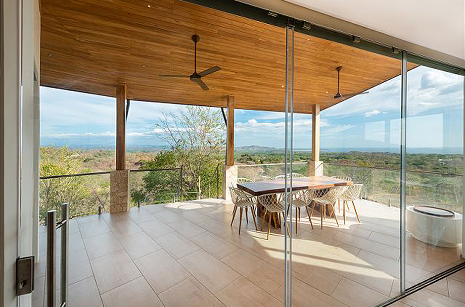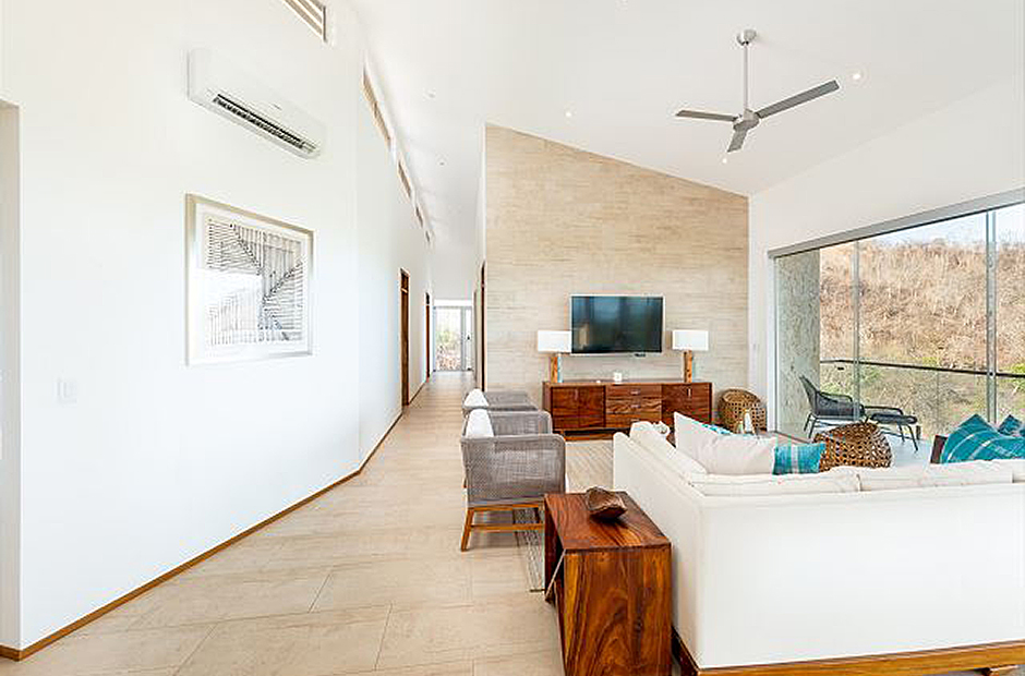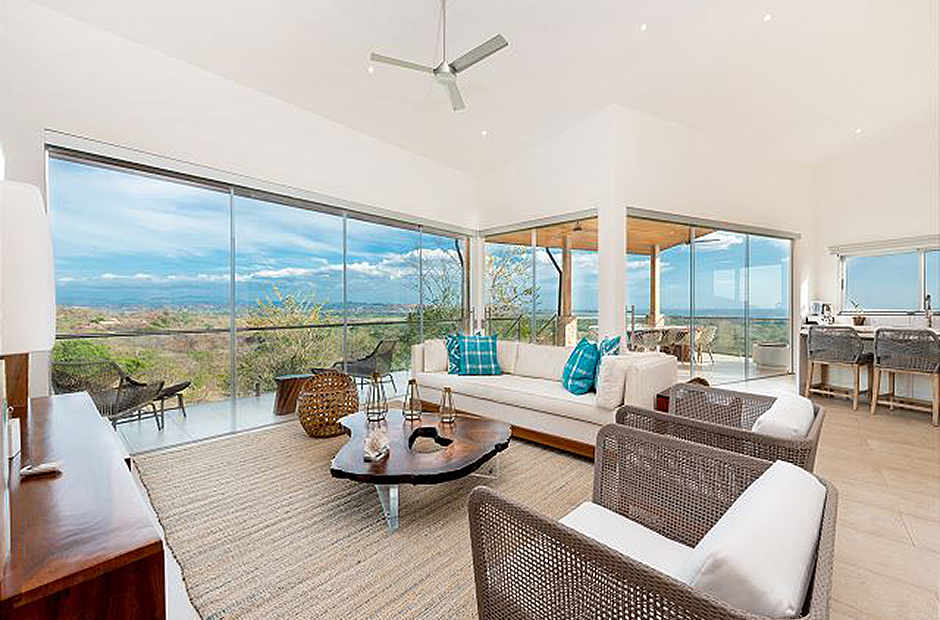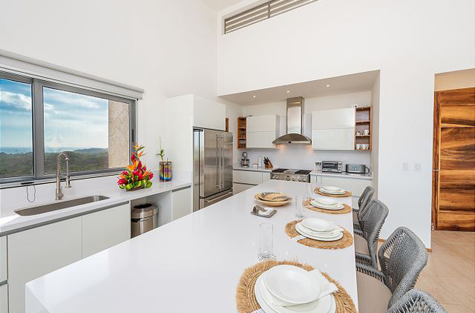 Oversized glass doors and windows provide you with a living panorama of the Guanacaste countryside in every room of the house. The sunny indoor common area is a single space where the living room, dining room, and kitchen blend together into the space where you will spend unforgettable hours with your family and friends during your Costa Rica vacation. The sleek modern kitchen is fully equipped and gourmet-ready, and comfortable furniture in the living area provides a place to relax in front of a flat-screen tv. Enjoy cable television, wi-fi service and of course air conditioning throughout the villa.