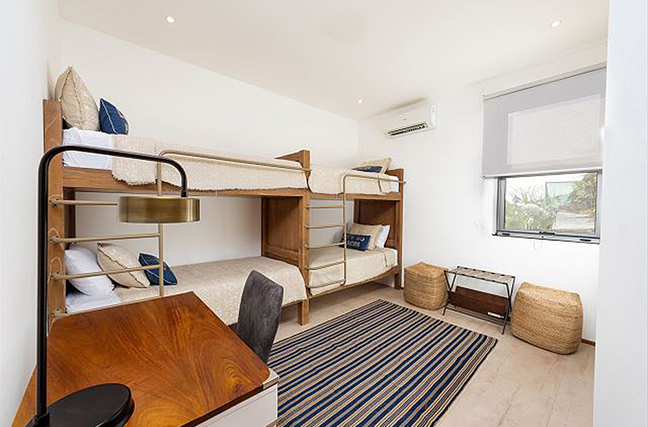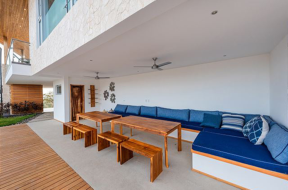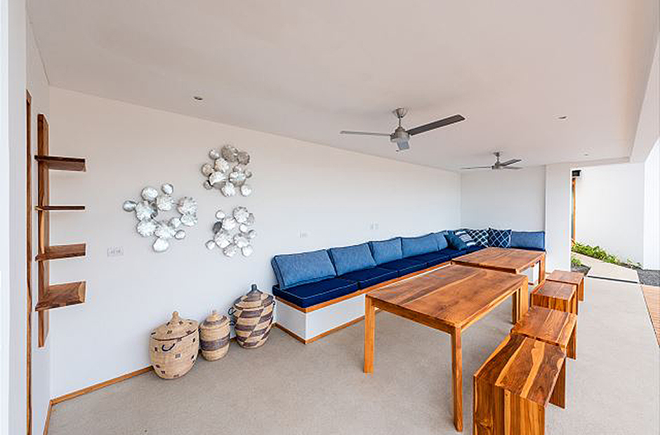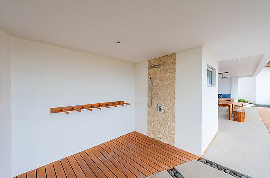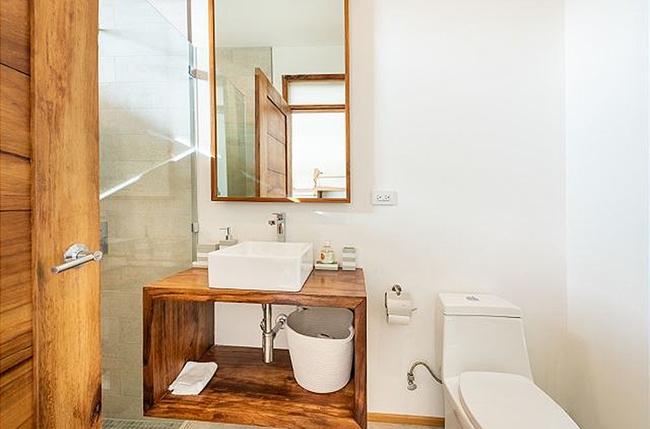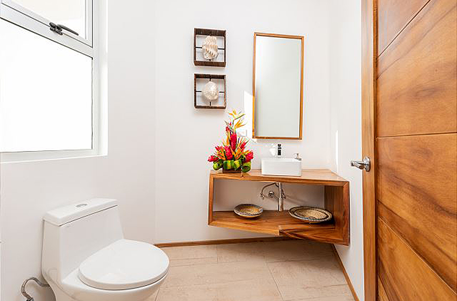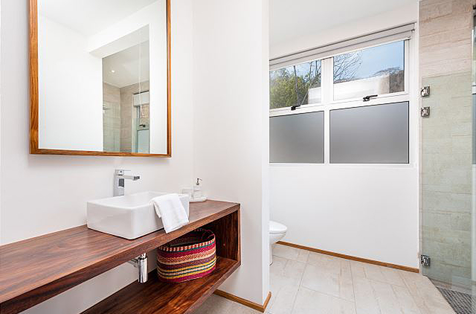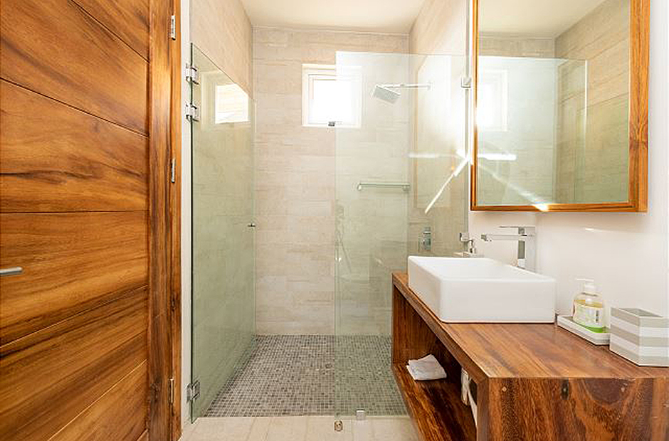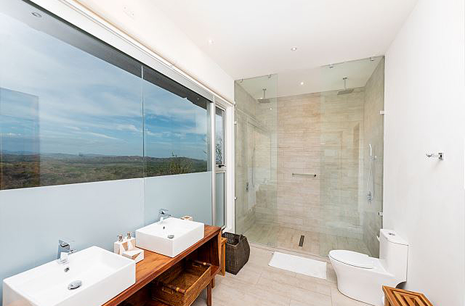 Three bedrooms with private en-suite baths are located in on the main level of the home. The room most preferred by the youngest guests contains two sets of twin bunk beds. A second guest bedroom offers twin beds that can be joined to form a king, and the master suite which overlooks first the pool and then the rolling hills of Guanacaste offers a king sized bed and a luxury bath that you will have to see to believe.