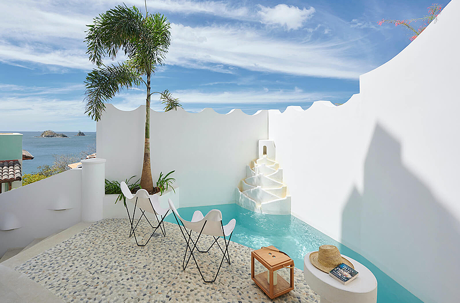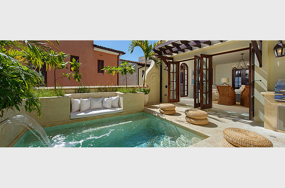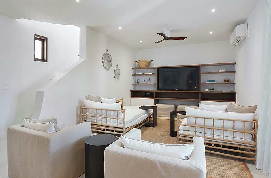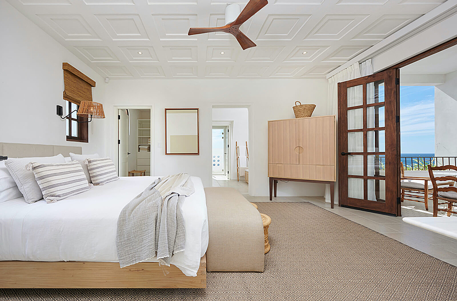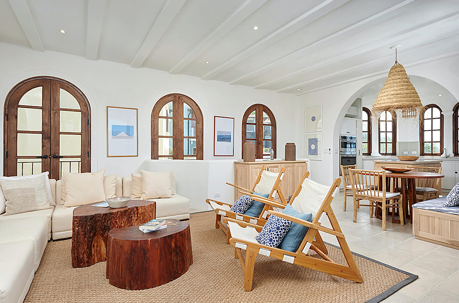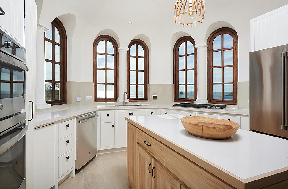 Panoramic ocean views continue back inside on the top floor, with windows bathing the open concept living room and full chef’s kitchen in golden natural light. The downstairs leads to the den, another patio with it’s own plunge pool, and an additional grilling area for outdoor cooking.