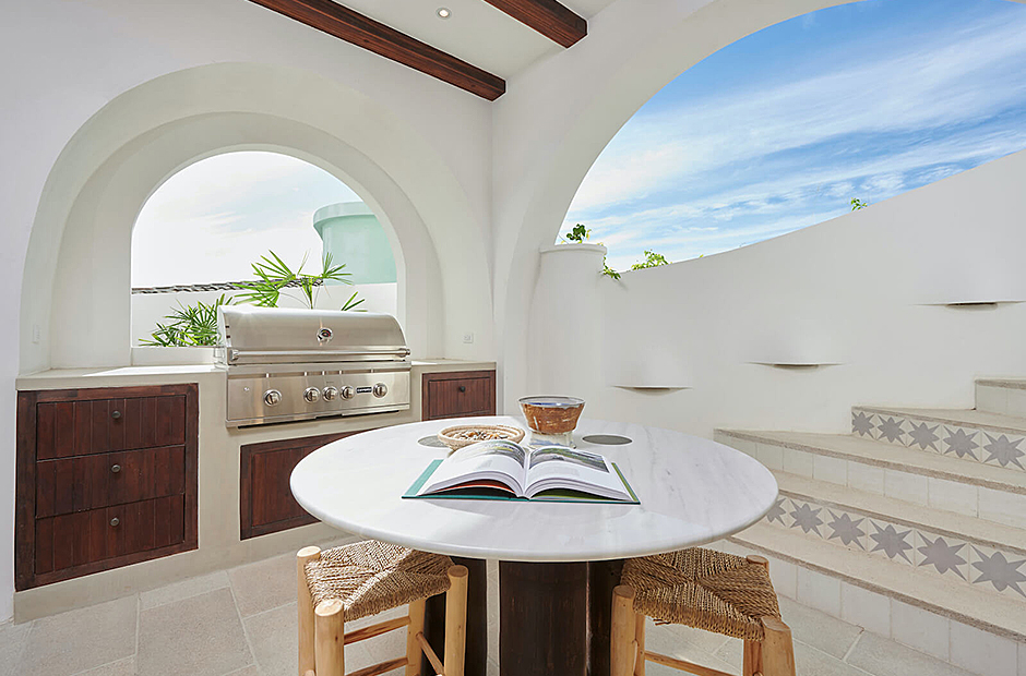 Perched atop the hillside street of Calle Virginia this villas large rooftop terrace opens up to expansive ocean views of the sunset and the Catalina Islands, where an outdoor grilling area and large rustic dining table is set up to host meals together.