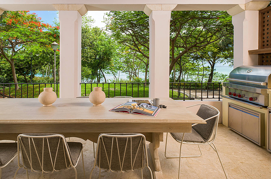 This villa begins outside, where the streetfront, elevated patio provides a connection back to the ocean while maintaining privacy. A refreshing pool is set back towards the home, giving it a more secluded location. Inside, the living space and full kitchen open up to a covered alfresco dining area that overlooks the ocean.