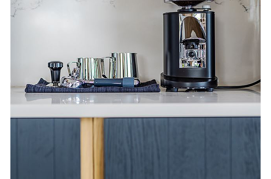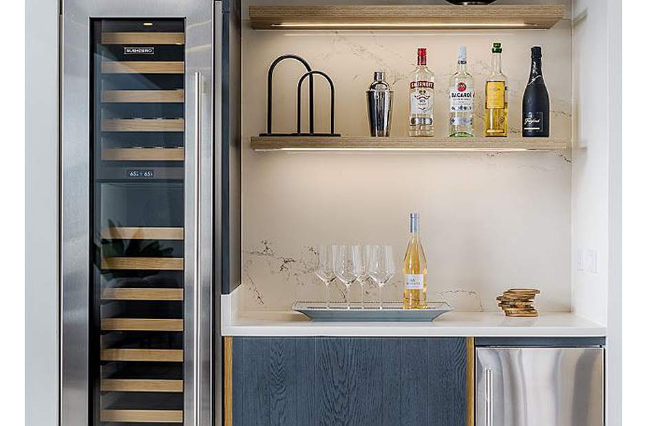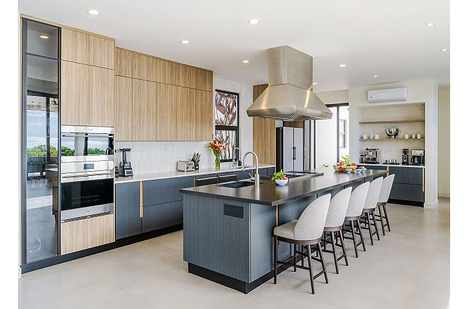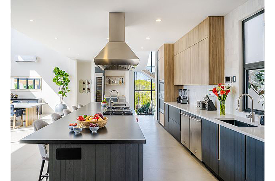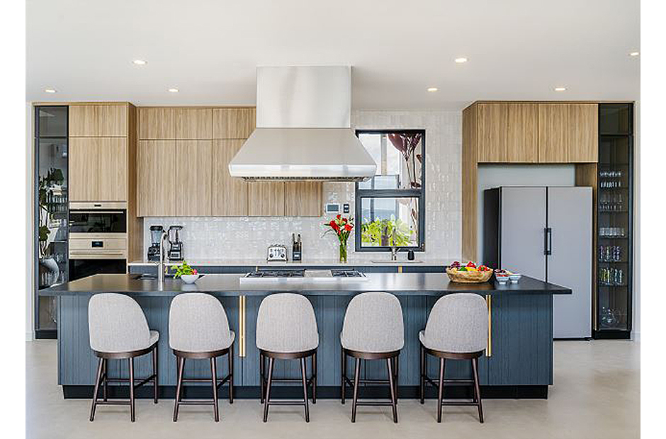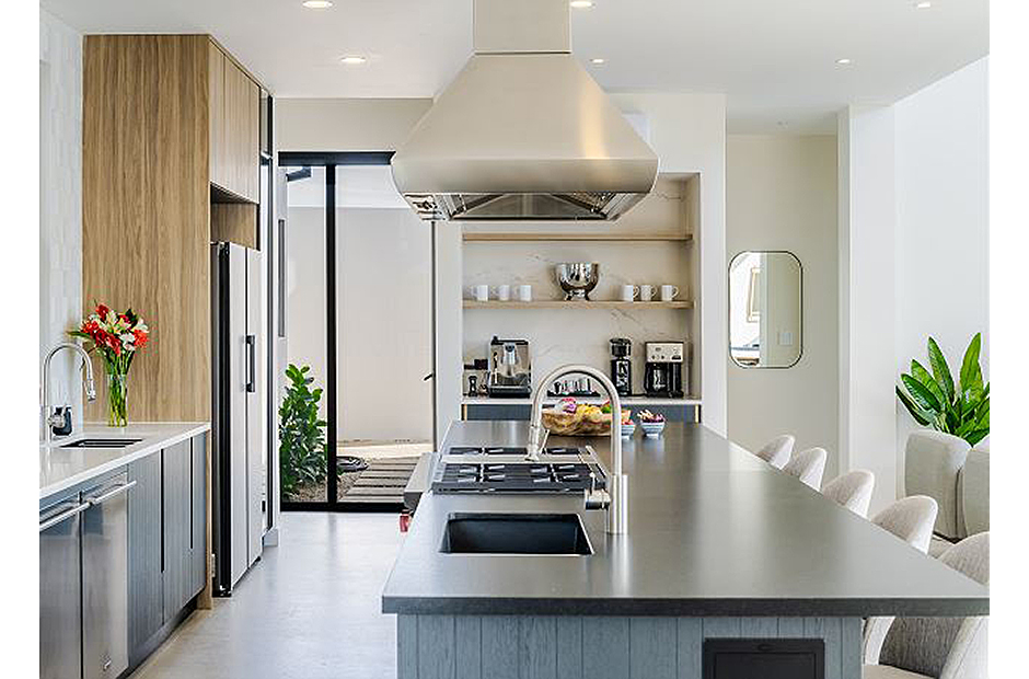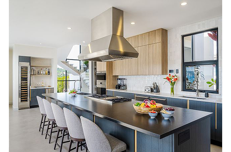 Equipped with top-of-the-line appliances including an industrial ice maker and a professional espresso machine from brands such as subzero and wolf. This kitchen is a singular mix of welcoming atmosphere and layered textures with plenty space for every party to enjoy.