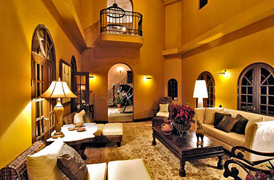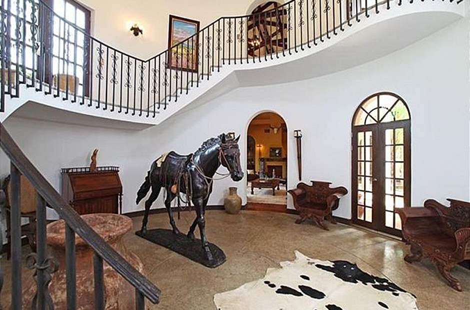 It features an atrium with beautiful fountains, balconies, three staircases, 45 ft ceilings, 6 bedrooms, a parlor, a dinning room with a table that seats 12, a living room, kitchen with a table that seats 6, a massage spa room, tv, 8 bathrooms, a 3 stall barn, a pool with swim up bar and a Jacuzzi. Plus a small pool for waders and a natural waterfall fountain feature.