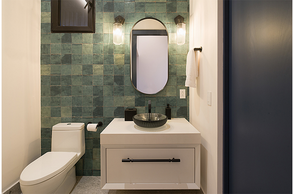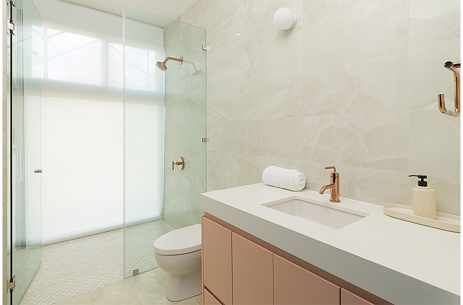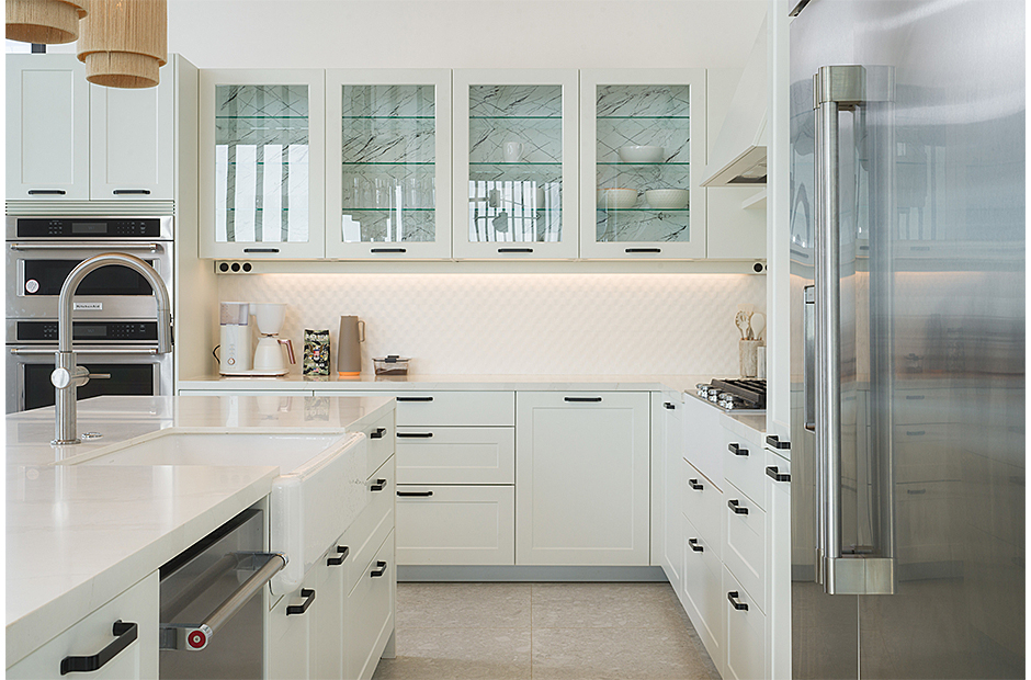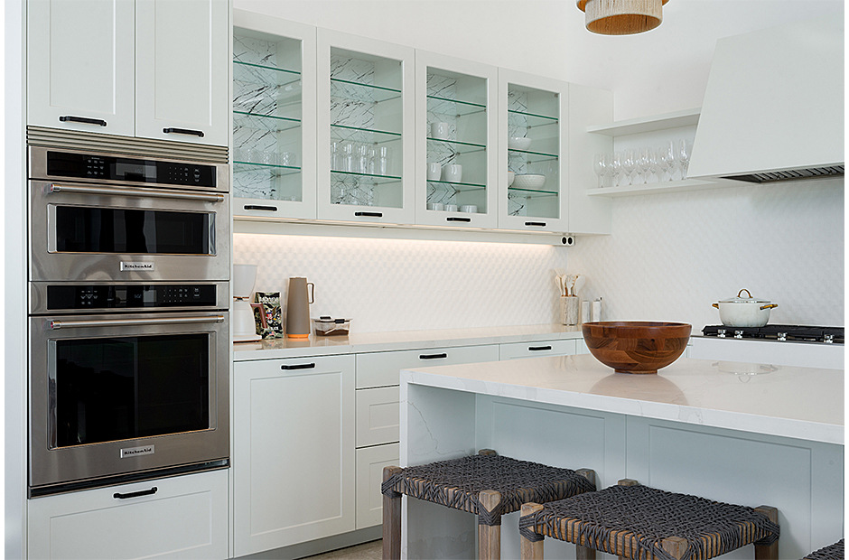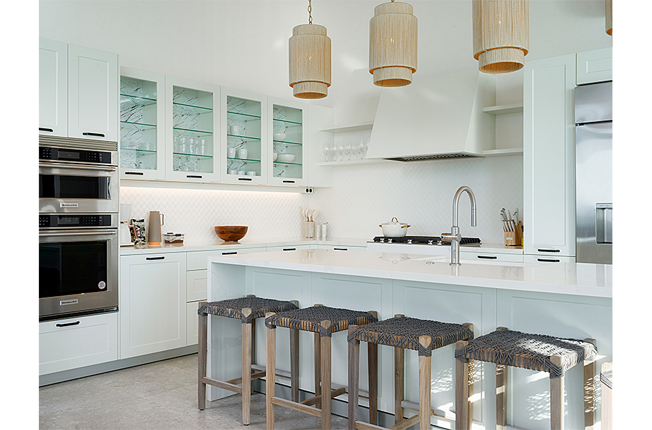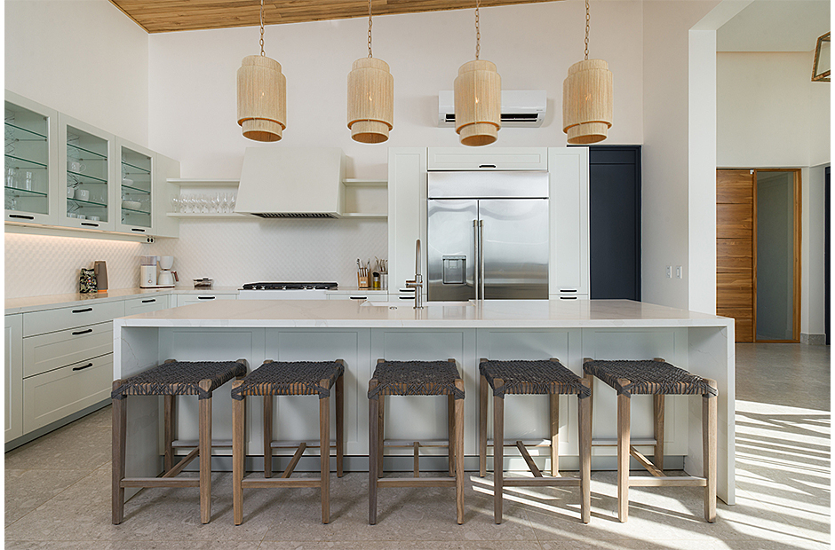 On the main level upon entry, guests are greeted by a spacious open-plan living and kitchen area. The well-appointed gourmet kitchen is a chef’s delight and the large kitchen island serves as the social center of the home for dinner parties and cocktail hour!