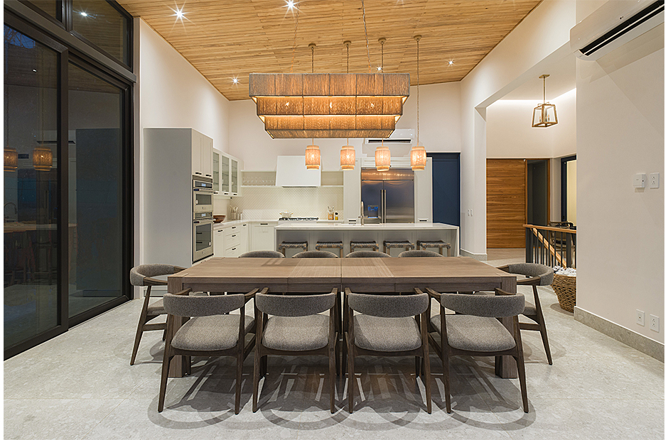 A large dining table plus spacious and comfortable seating can accommodate the whole gang for movie night after a long day at the beach.