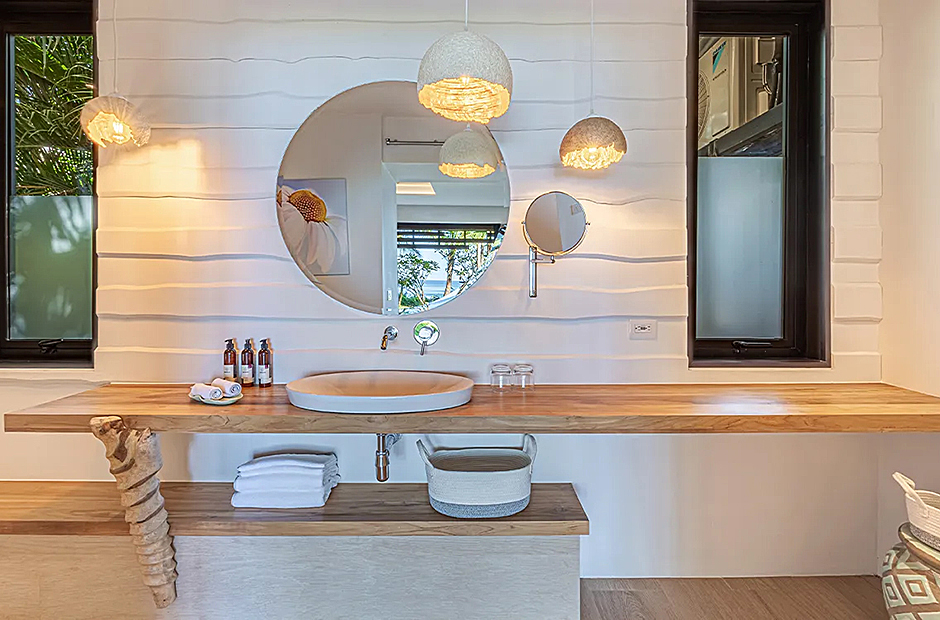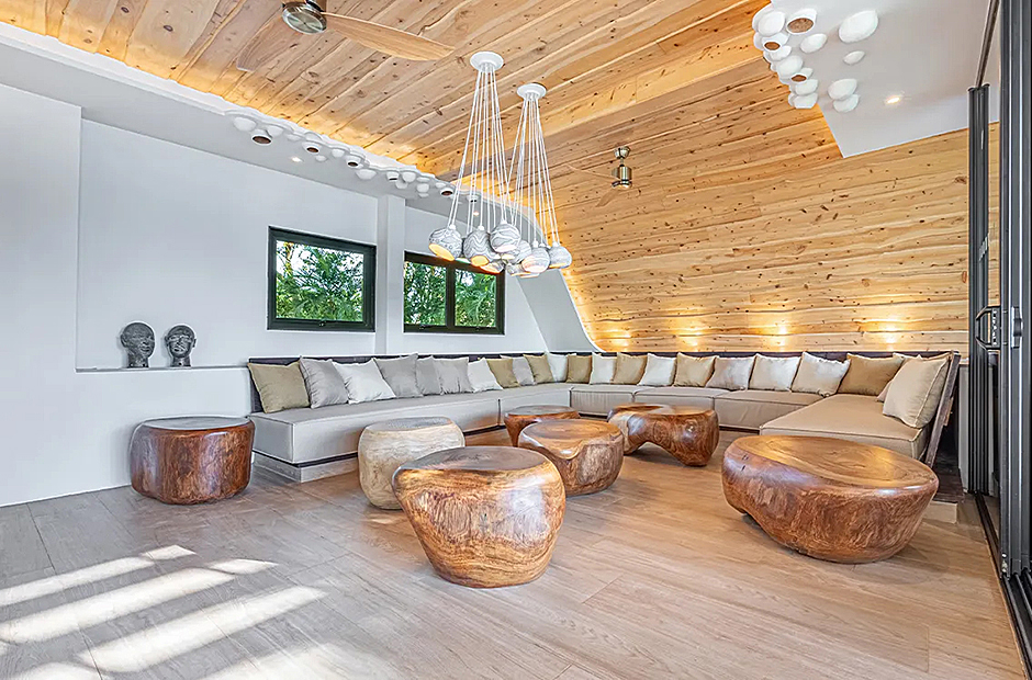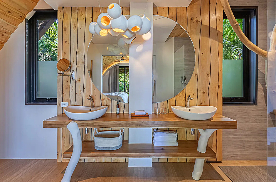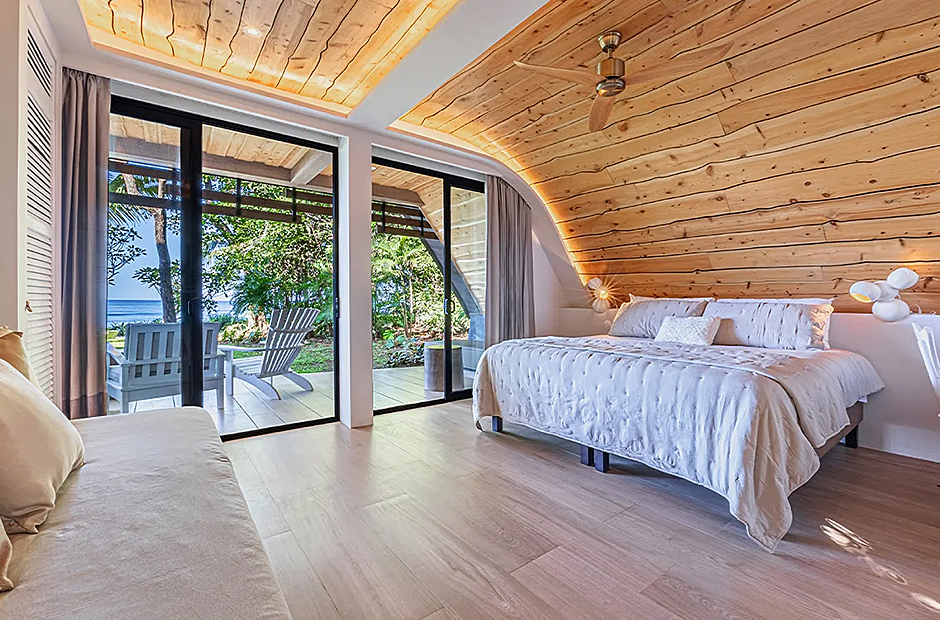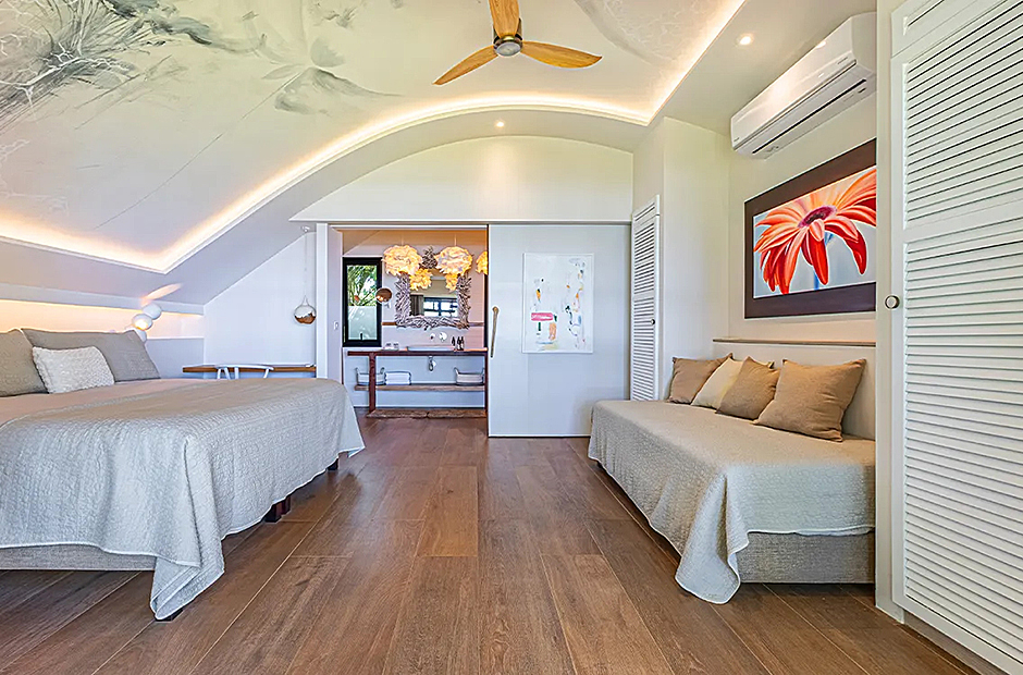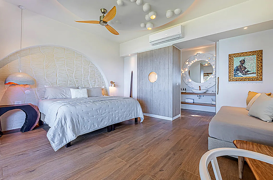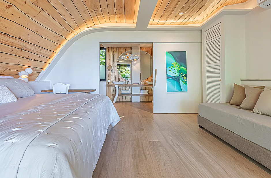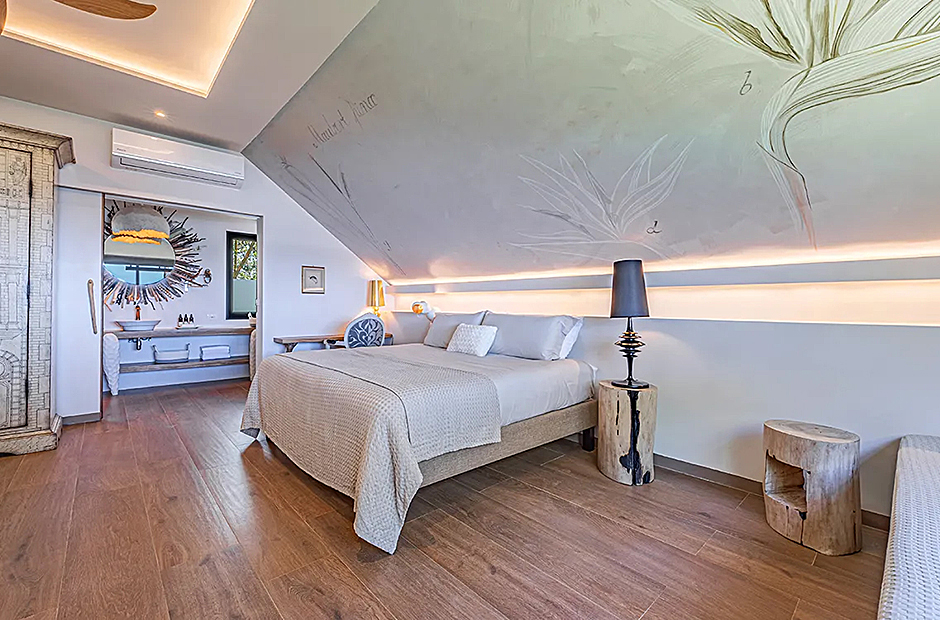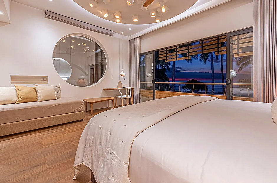 The living space opens onto a terrace, extending beyond the infinity pool overlooking the Pacific Ocean. The playful round shapes of wooden seats and tables seamlessly flow from inside to outside. Handcrafted lamps add an artistic touch, and conversation with sculpted lighting forms above. Our bedrooms are enchanting spaces with hand - painted features adds a touch of artistry to your sleep sanctuary. When it’s time to retreat and rest, your five-star suite will be waiting for you. The spaces are infused with character by adding art and natural materials everywhere.