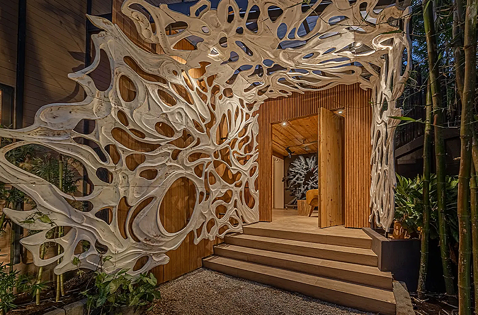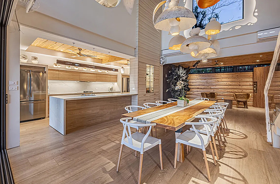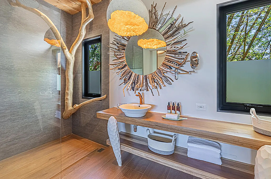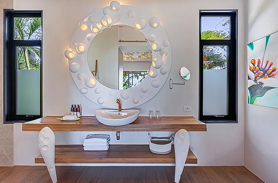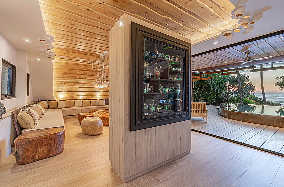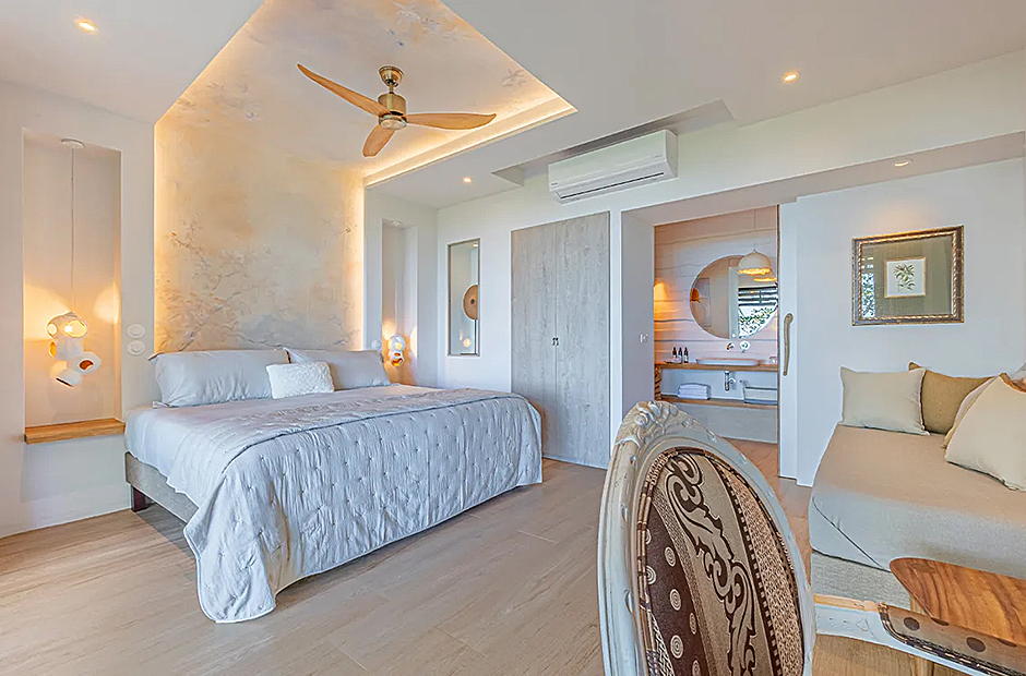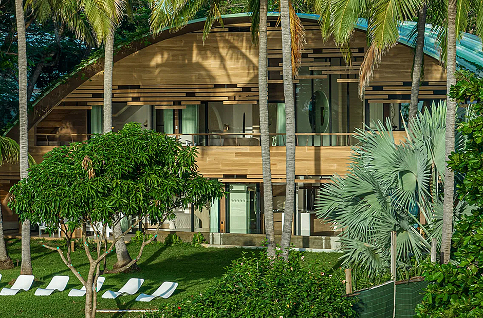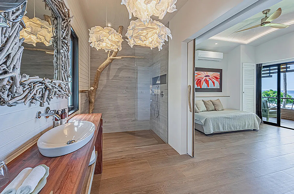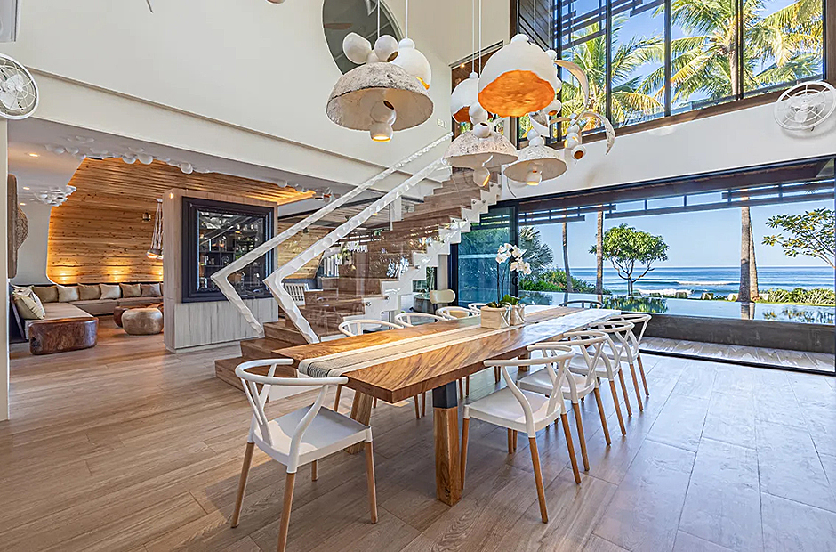 The living space opens onto a terrace, extending beyond the infinity pool overlooking the Pacific Ocean. The playful round shapes of wooden seats and tables seamlessly flow from inside to outside. Handcrafted lamps add an artistic touch, and conversation with sculpted lighting forms above. Our bedrooms are enchanting spaces with hand - painted features adds a touch of artistry to your sleep sanctuary. When it’s time to retreat and rest, your five-star suite will be waiting for you. The spaces are infused with character by adding art and natural materials everywhere.