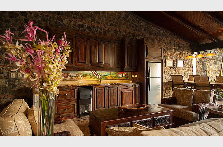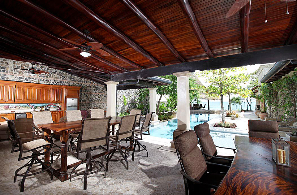 The main living/dining room is spacious and luxurious, and is adjacent to the kitchen, perfect for entertaining and dining. Several double doors open to the pool/patio area, allowing unhindered access to the outdoors throughout the home. This villa's dining room has capacity for 15 people.