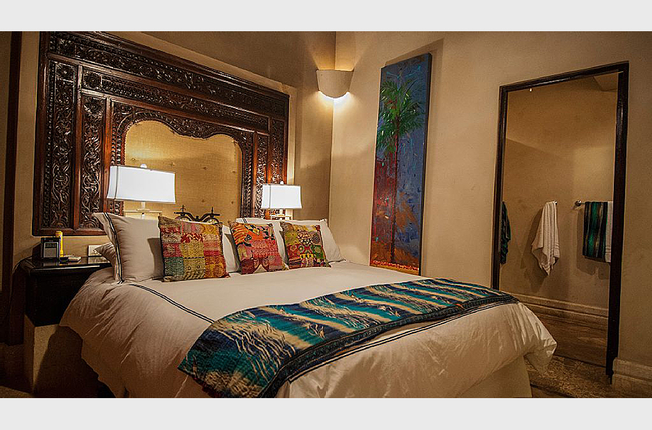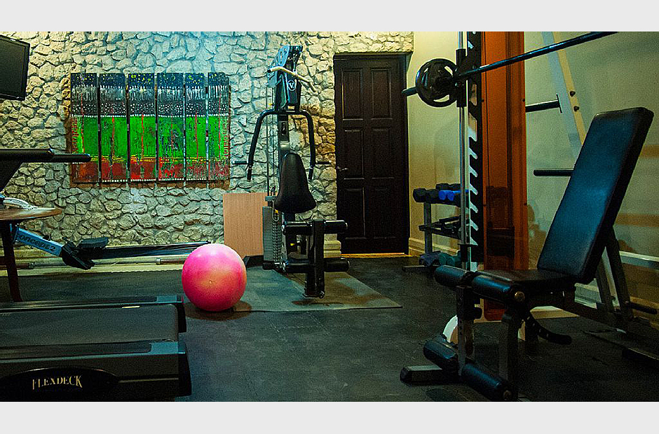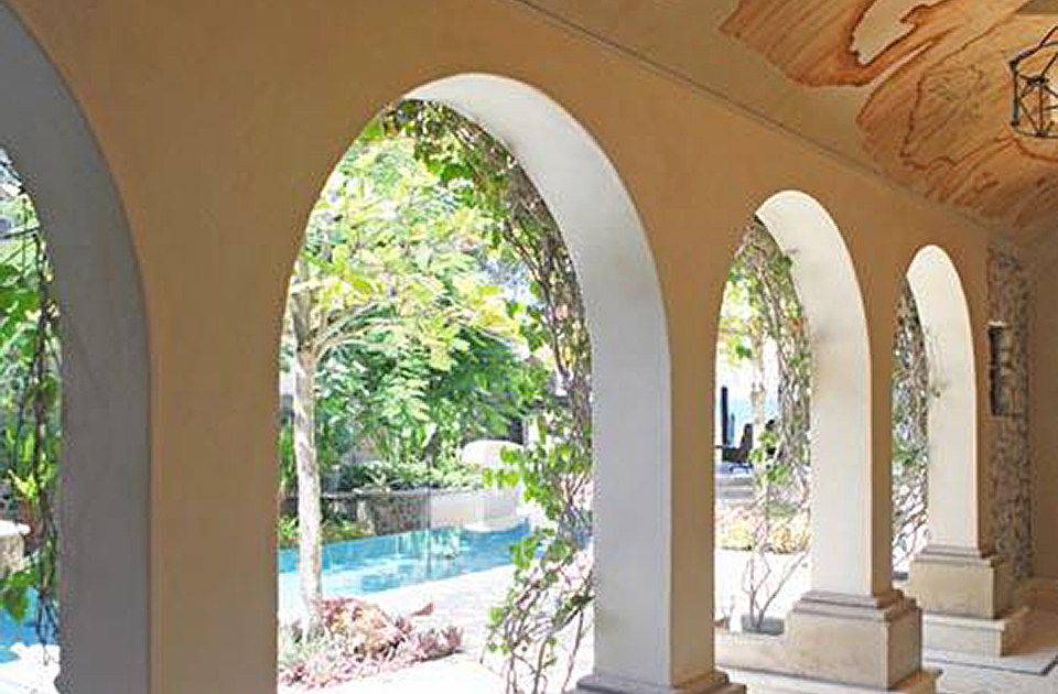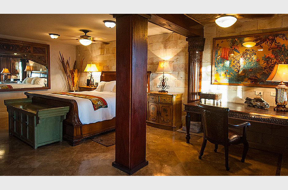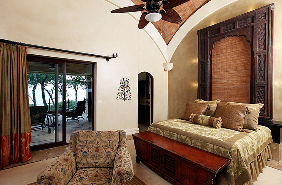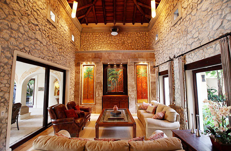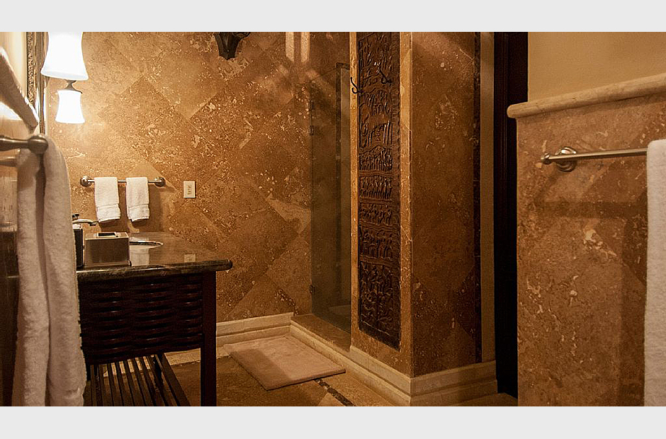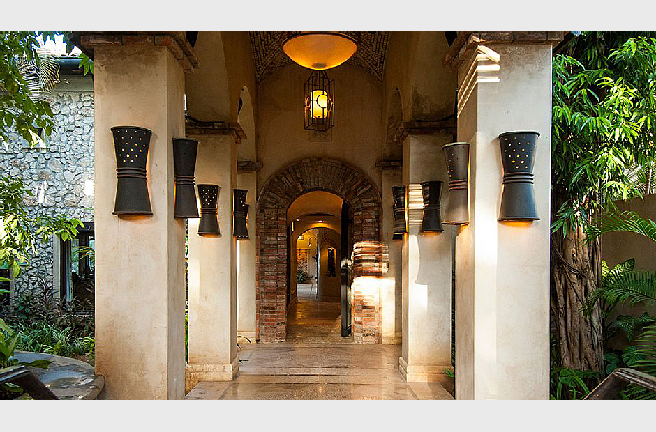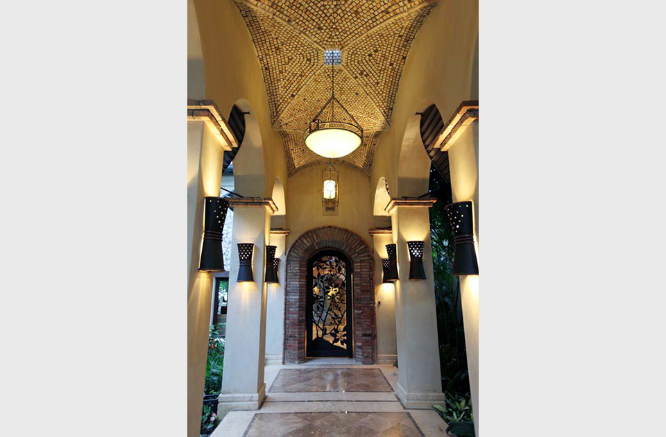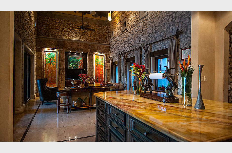 Enter the property through the stone tower entrance which opens onto the courtyard and foyer with mosaic tiled archway and ambient lighting. Walk through the custom designed wrought iron doorway, where the prevalent detailing becomes clearly evident, from the sandstone carvings, to the world map painted ceiling hallway. The indoor lounge area features vaulted ceilings and stone walls with tropical decor. The kitchen provides spacious preparation room and professional appliances.