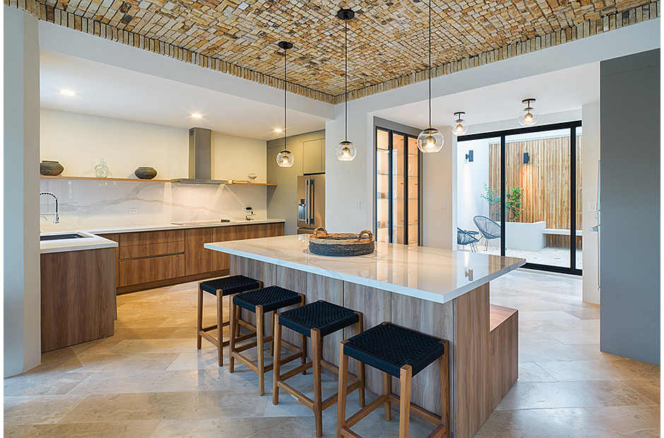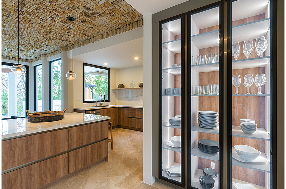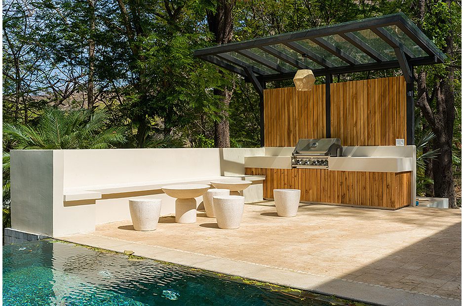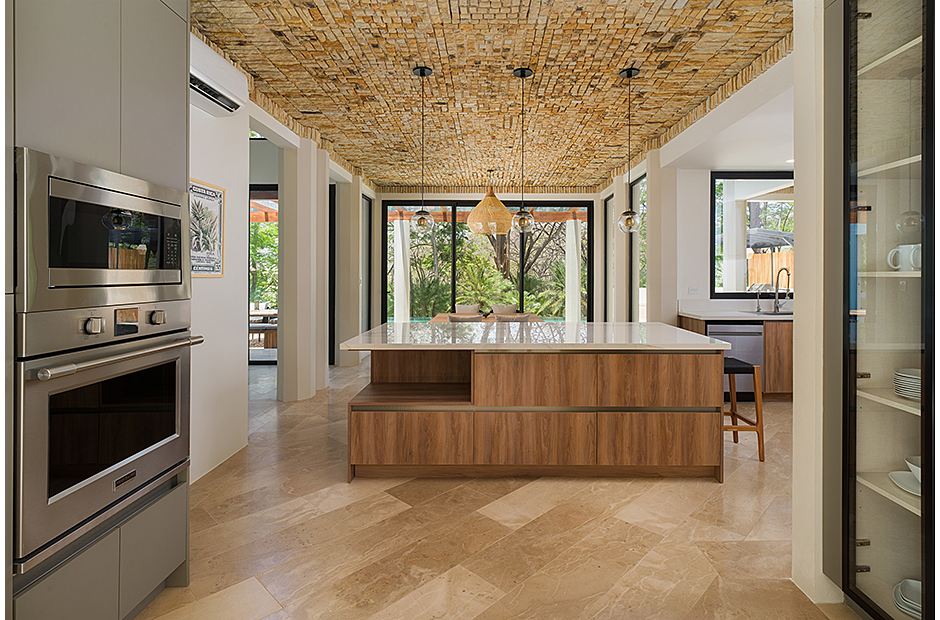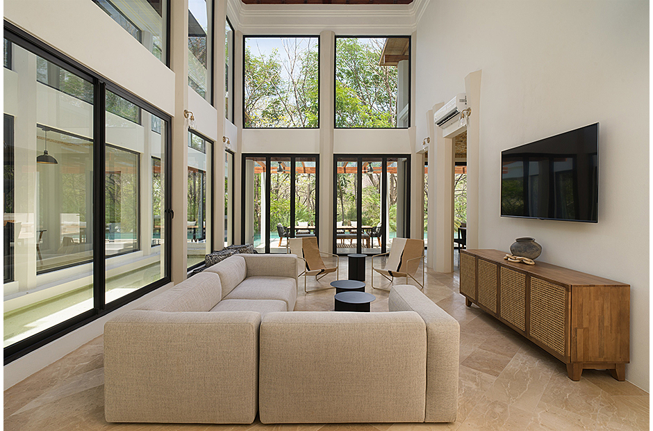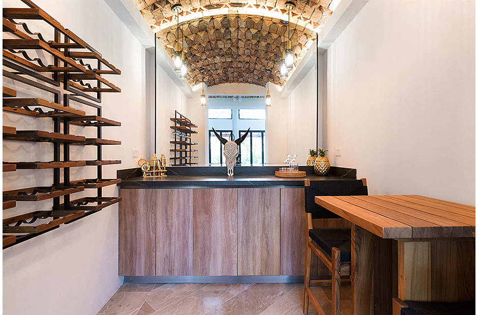 Spacious double-height living room adjoins the gourmet kitchen and indoor dining area. Pull a bottle from the wine cave and take in the tropical surroundings.