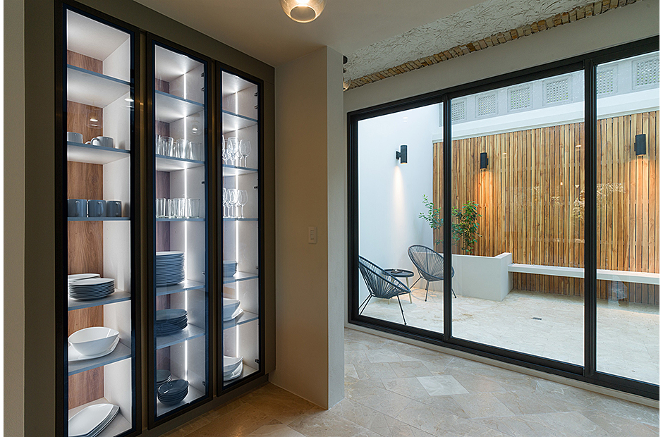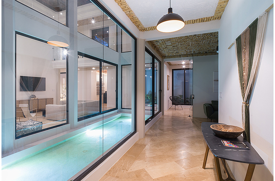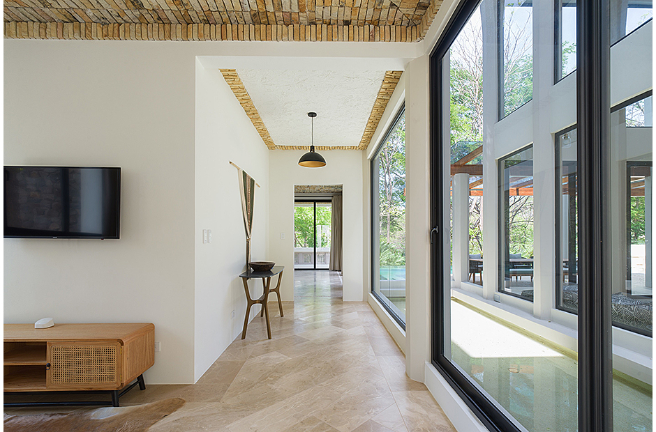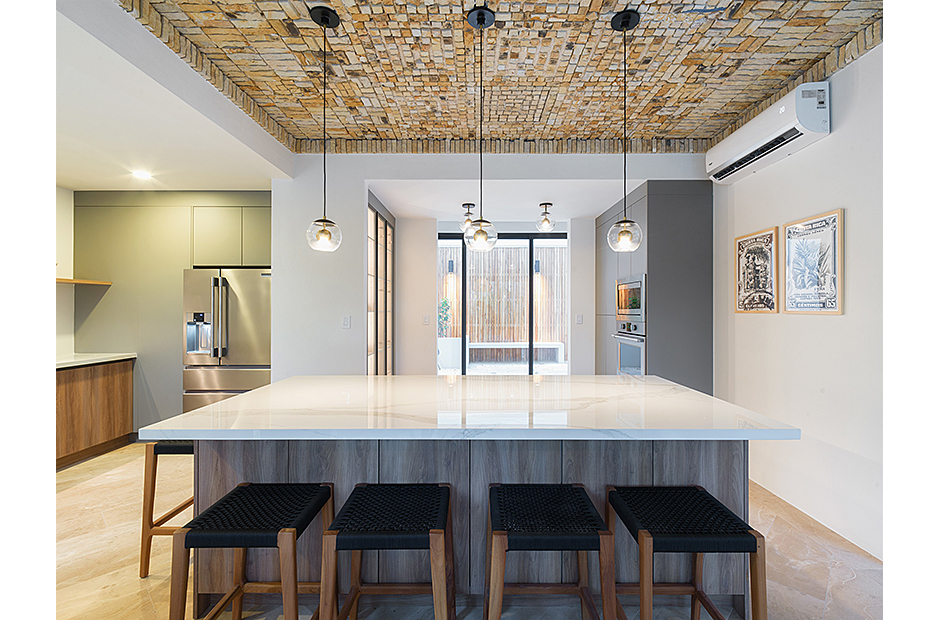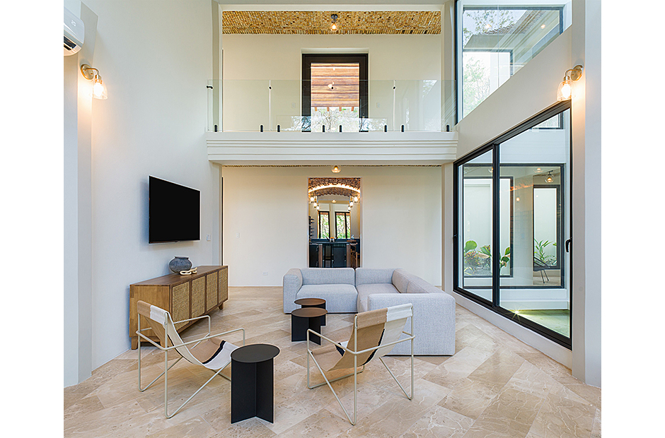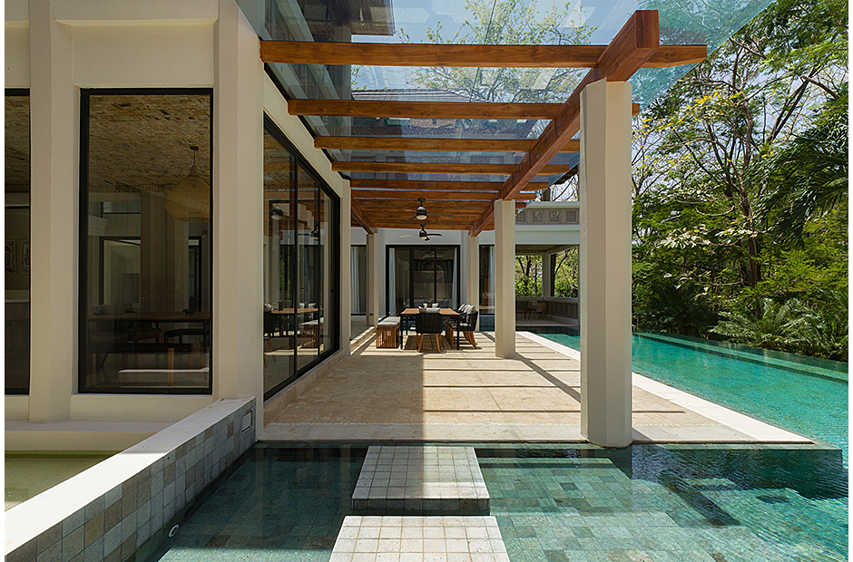 Spacious double-height living room adjoins the gourmet kitchen and indoor dining area. Pull a bottle from the wine cave and take in the tropical surroundings.