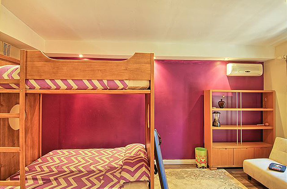 Just off the dining area is the superb master bedroom with king size bed, large flat-screen TV and lots of closet space, and master bath that includes an over-sized modern glass shower and jacuzzi tub. A second bedroom has a queen bed and large walk-in closet. This bedroom is connected to the next bedroom suite by another lovely bathroom with a modern glass shower. The bedroom suite (bedrooms 3 and 4 that are separated by a curtain) also has a queen size bed, a large flat-screen and an alcove step down to a sitting room that can also sleep 3 on the single/double bunk beds. There is also a fifth bedroom that sleeps one person next door to the guest bathroom.