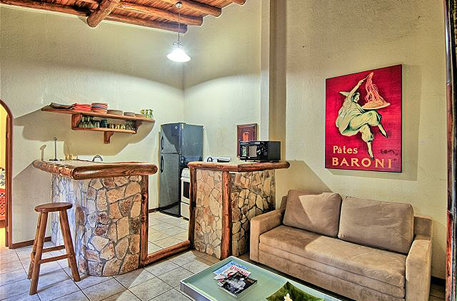 A guest house is across the garden and can sleep up to 6 more guests. The first bedroom has a king size bed, the second bedroom has two twin beds. Both bedrooms have full bathrooms. The living room has a pullout double couch and a TV. Take a step up into the full stone kitchen.