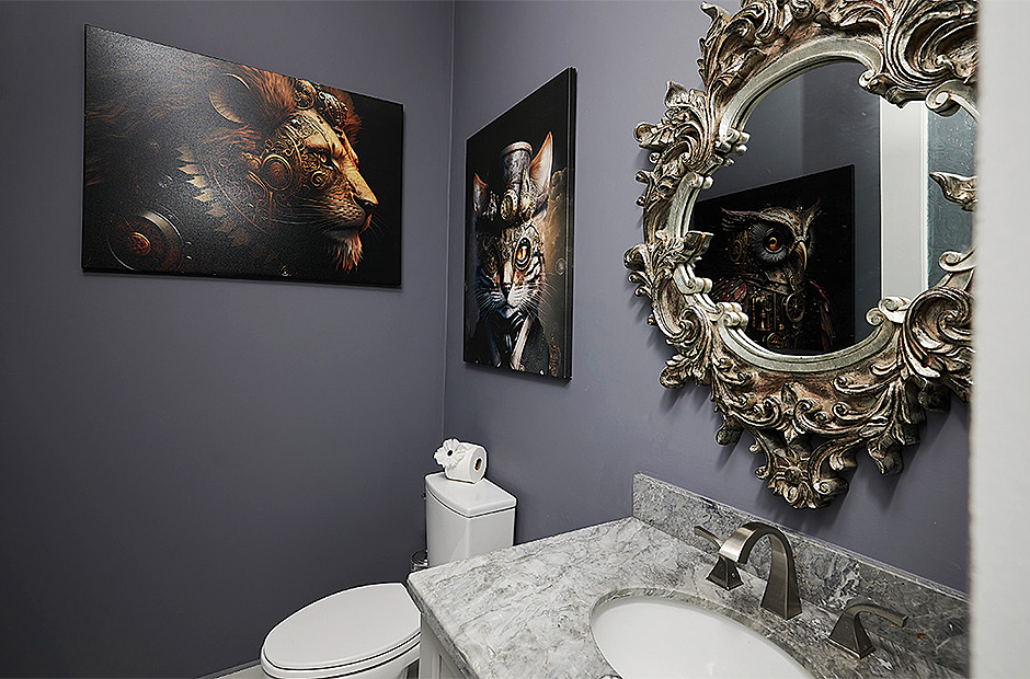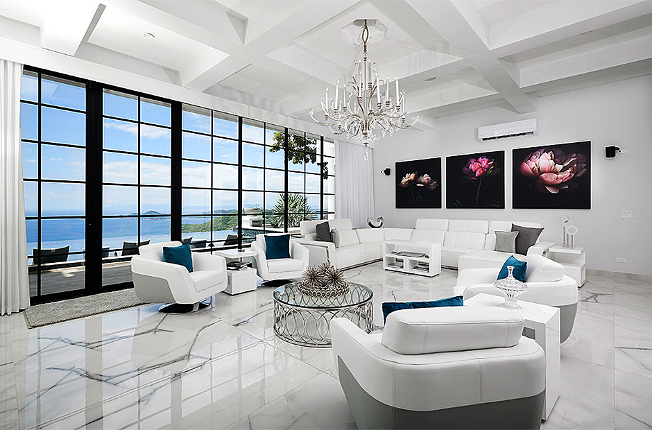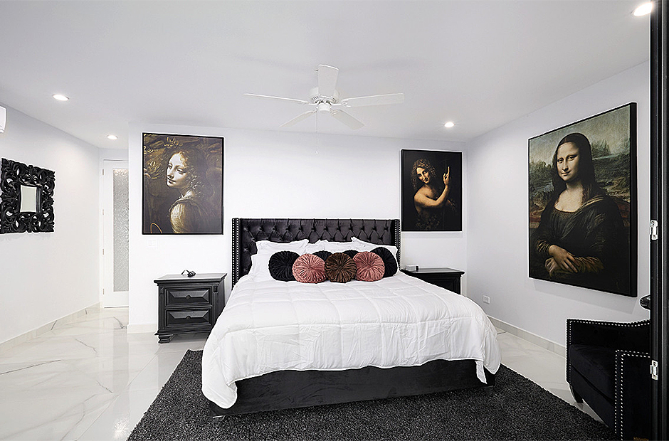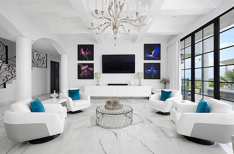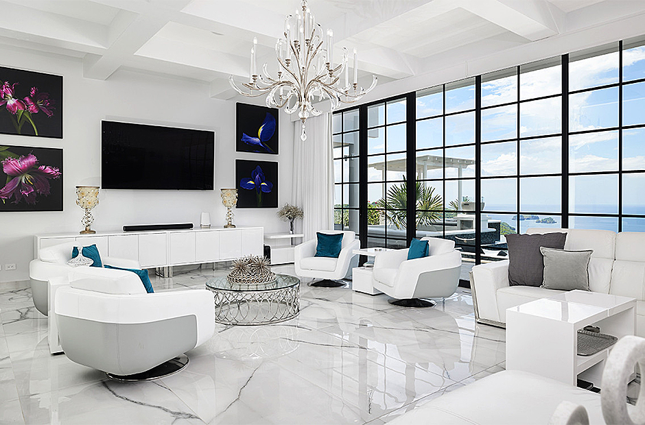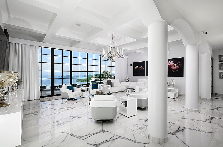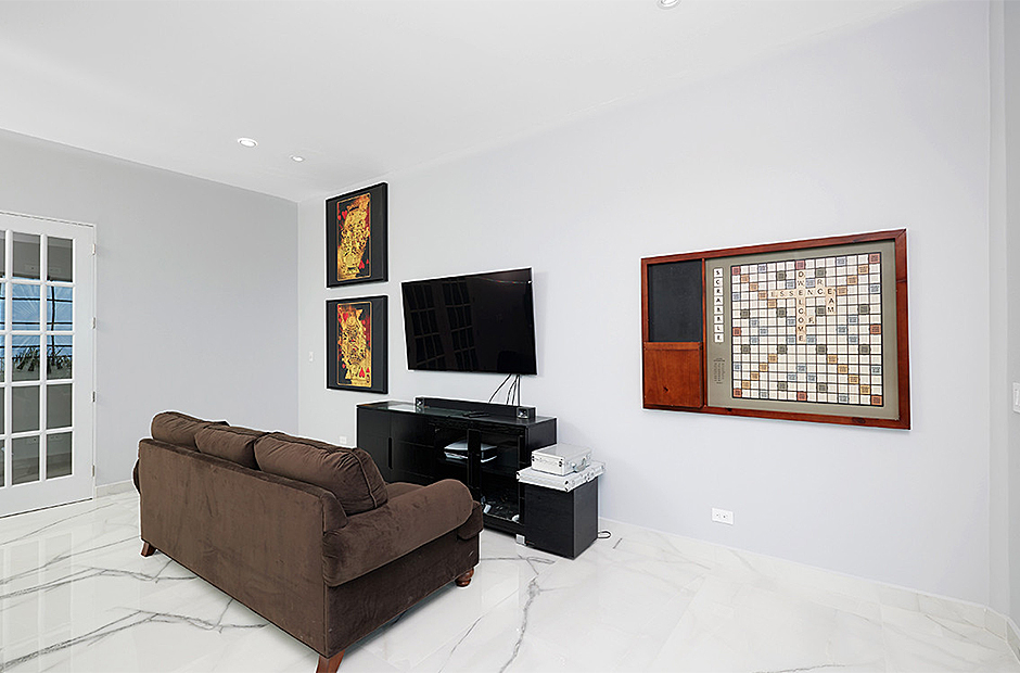 The grand living room, resplendent with the artistic accents of masterpieces adorning the walls, creates an inviting environment with its spacious layout and oversized windows. A large flat-screen TV and comfortable seating arrangements offer an ideal space for relaxation, entertainment, or contemplation while enjoying panoramic views of the Pacific Ocean.
