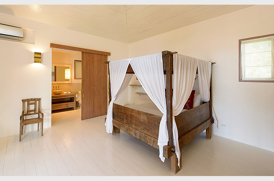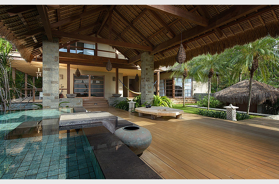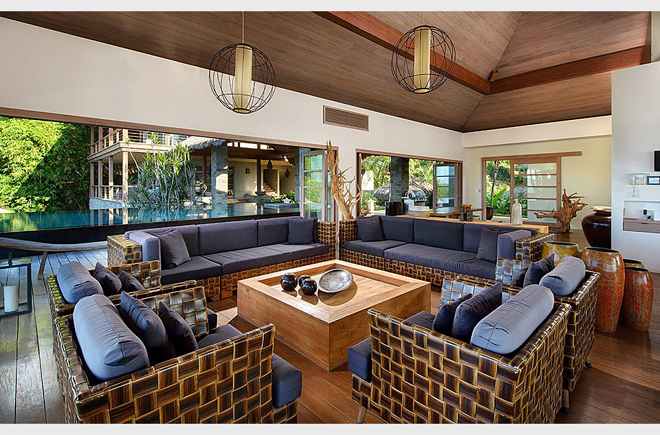 The spacious living area can be opened, closed partially or closed completely depending on weather conditions. This inside living area contains a large ironwood table for dining as well as a comfortable sofa for relaxing and both seat up to 12 people.