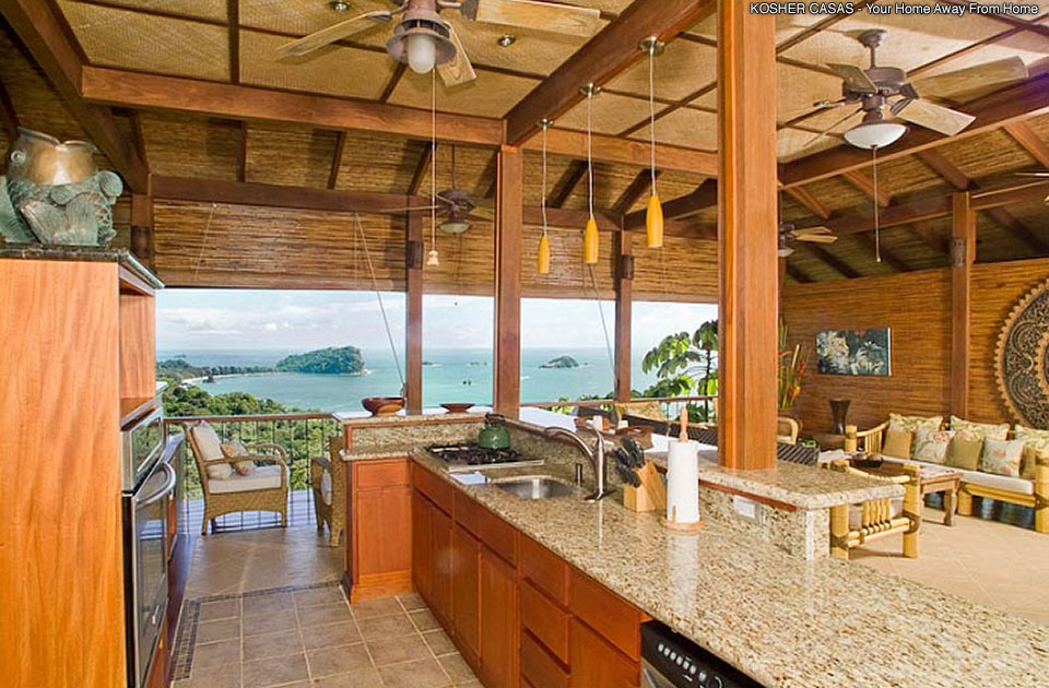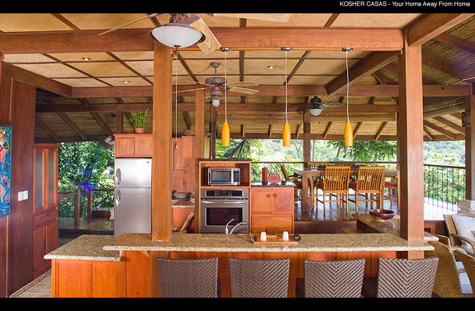 Enjoy the beautiful living room with native crafted mats and bamboo that create a magnificent 15 foot ceiling supported by hardwood columns and hand carved stone supports. This lofty open-air room is kept cool by six ceiling fans, which complement the cool ocean breezes. The walls are completely open to create a tropical feel allowing you to enjoy the spectacular views and the surrounding nature. The kitchen is part of this lofty open space area.