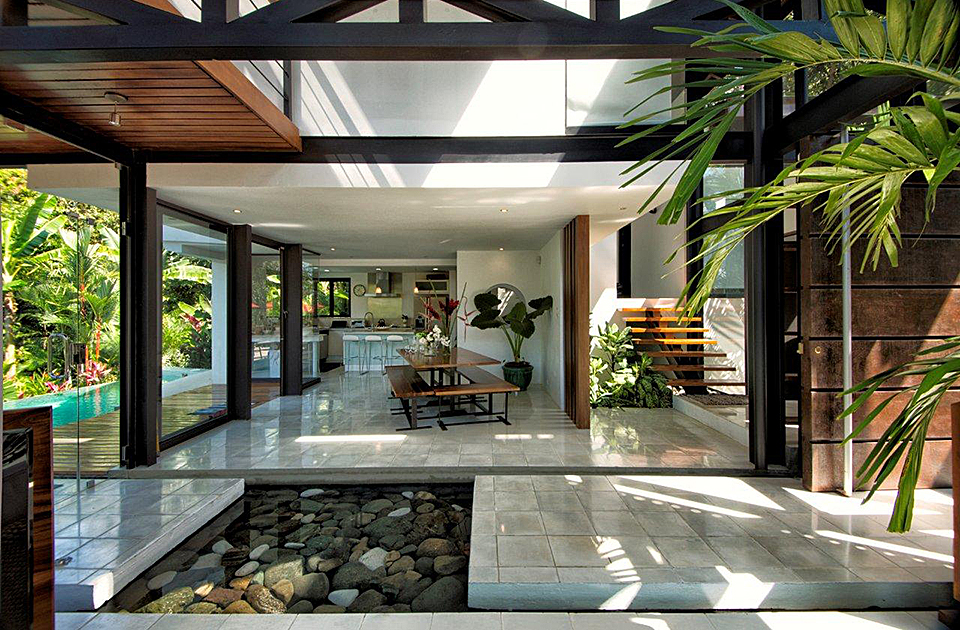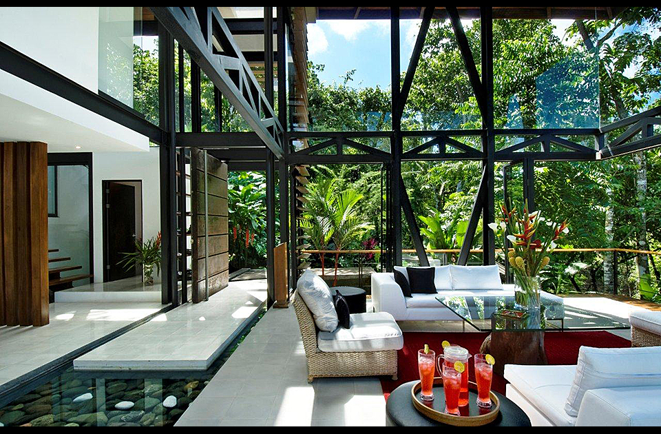 This incredible home has a vast sweeping garden walkway which traverses down to a serene waterfall with a massive steel door (counter balanced to move with only a touch of the finger) at the entrance. The door opens to a staggeringly beautiful living room with 25 foot vaulted wooden ceilings surrounded on all sides by glass doors which open entirely to the pool, expansive deck and jungle. The unique indoor water feature which leads to the infinity pool is only one of the features provided in this luxury custom home.